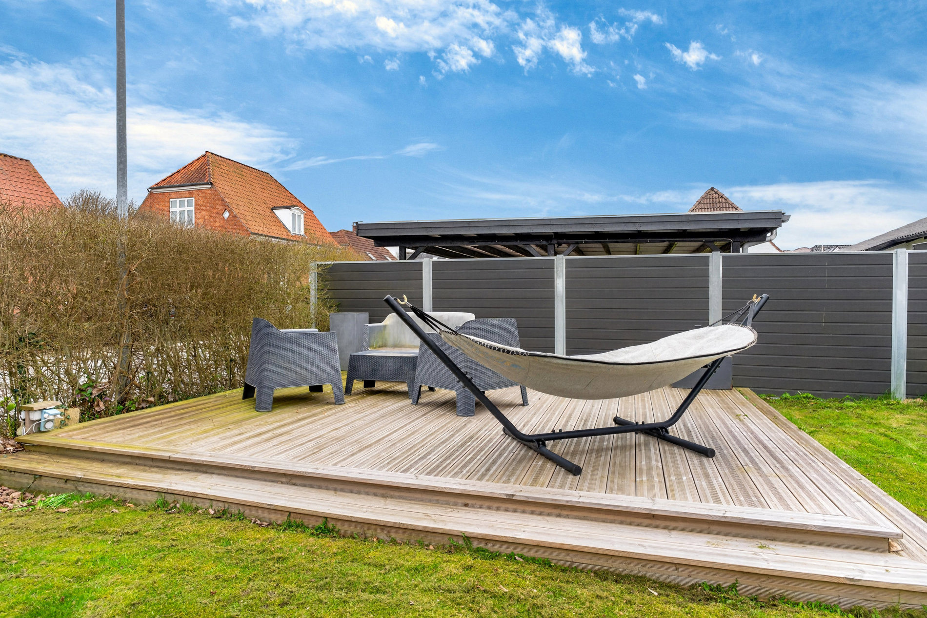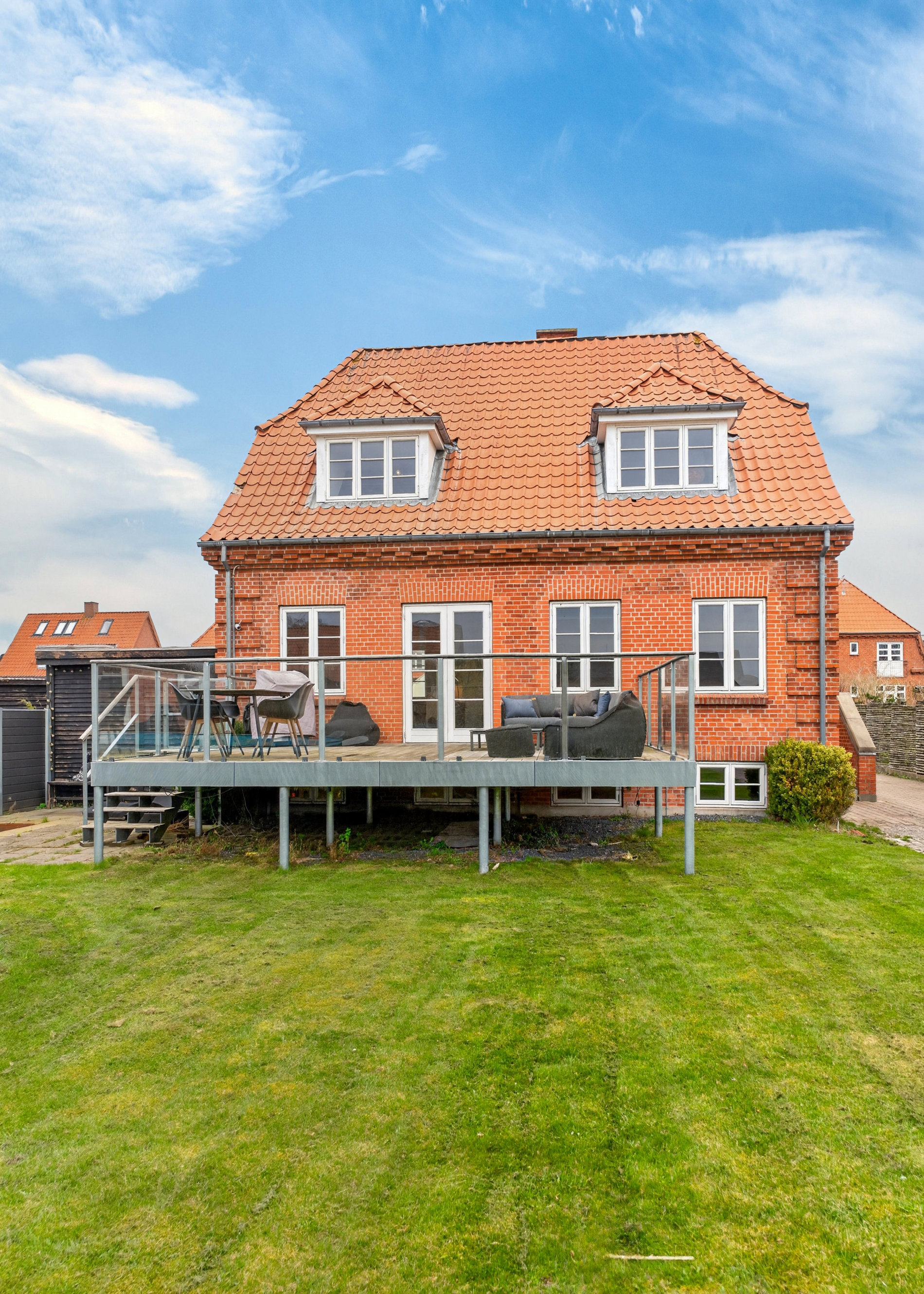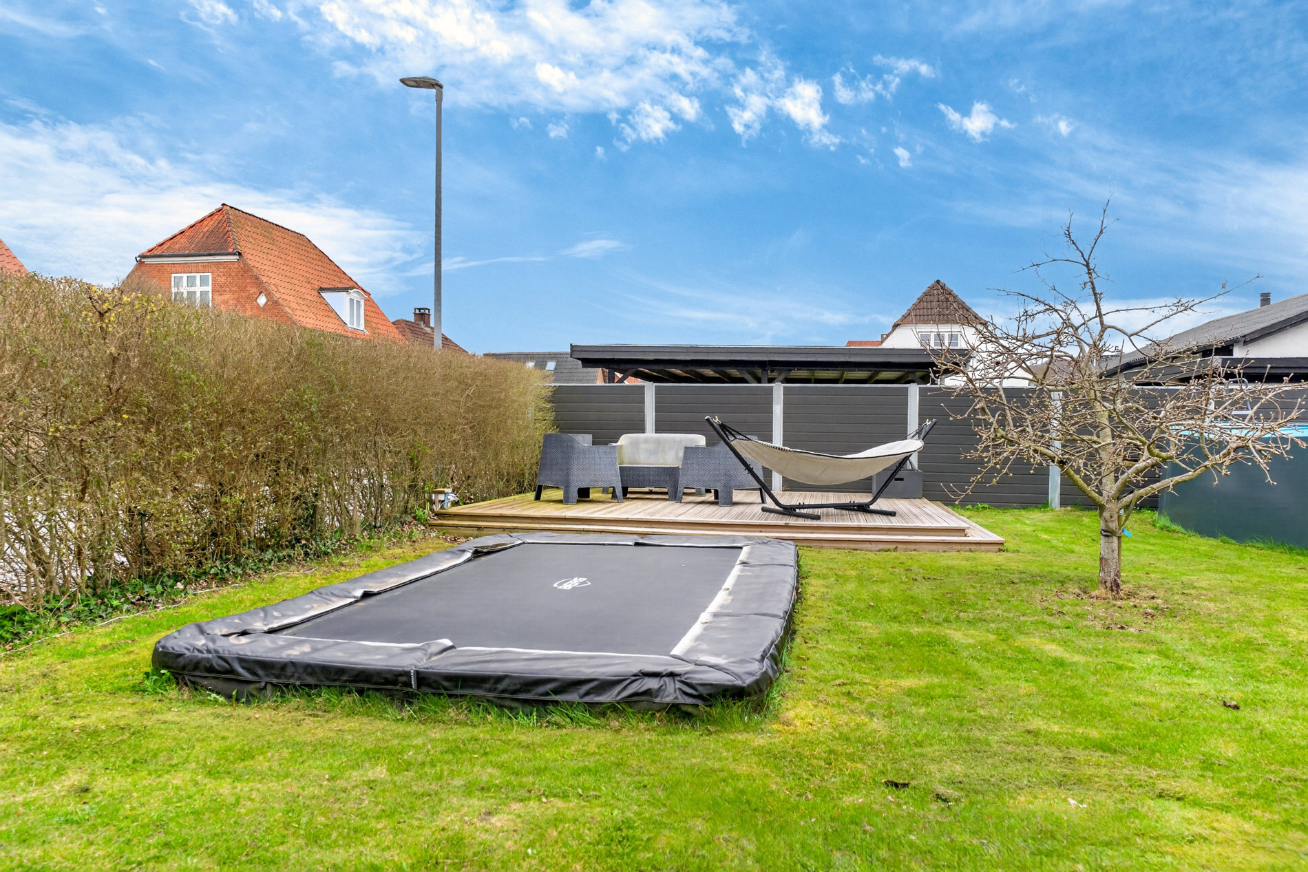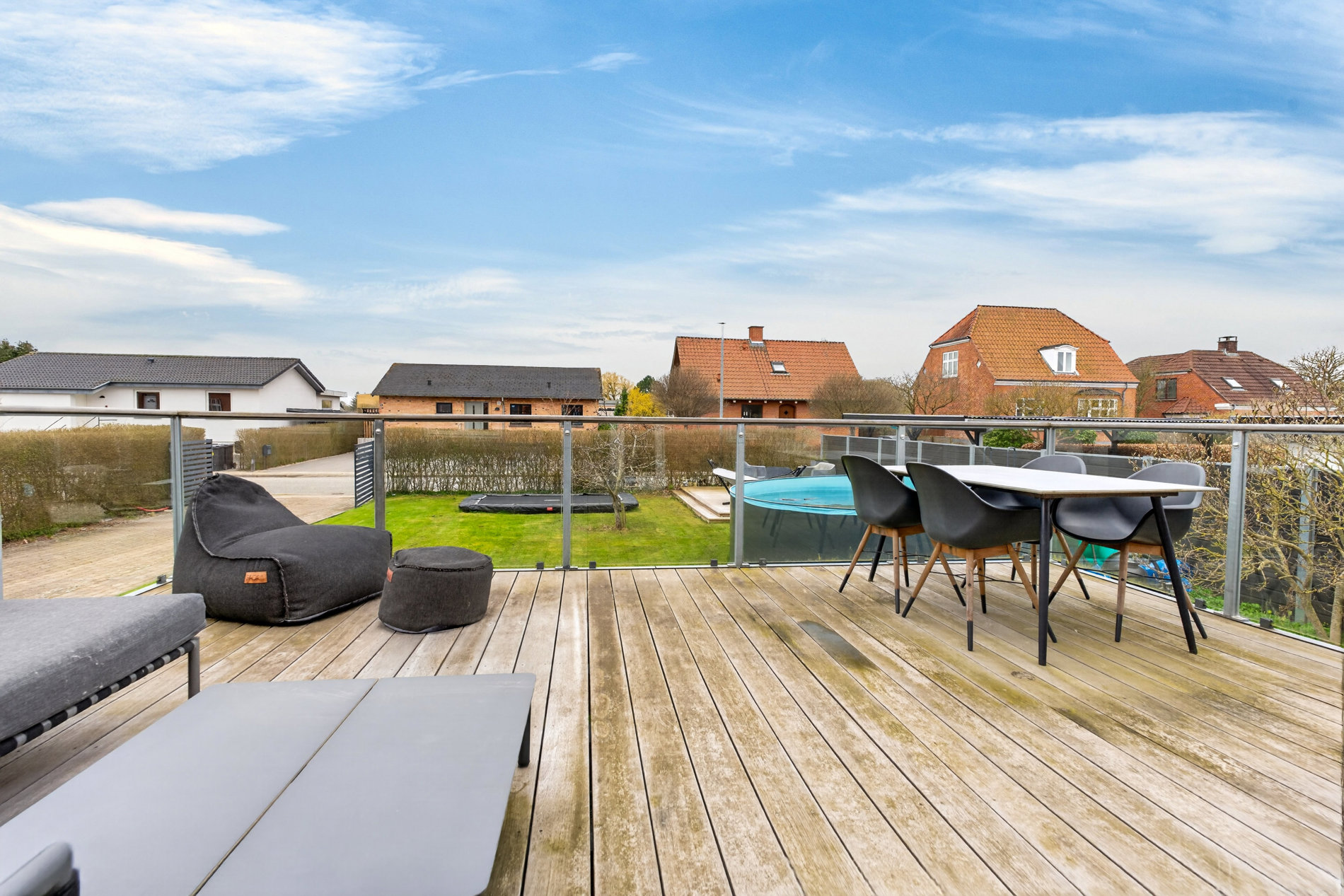Stuen er stor, dyb og let at indrette med både opholds- og loungemiljø. Herfra er der direkte udgang til en stor, hævet terrasse med nedgang til haven, der er et oplagt sted at nyde solen, udsigten og de lange sommeraftener. Bag huset findes desuden en stor overdækning, der forlænger udesæsonen og skaber en hyggelig ramme om grill, samvær og afslapning.