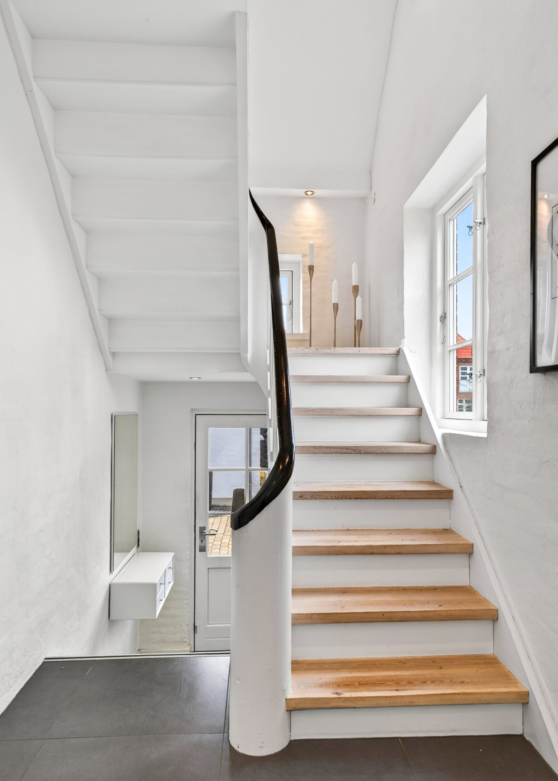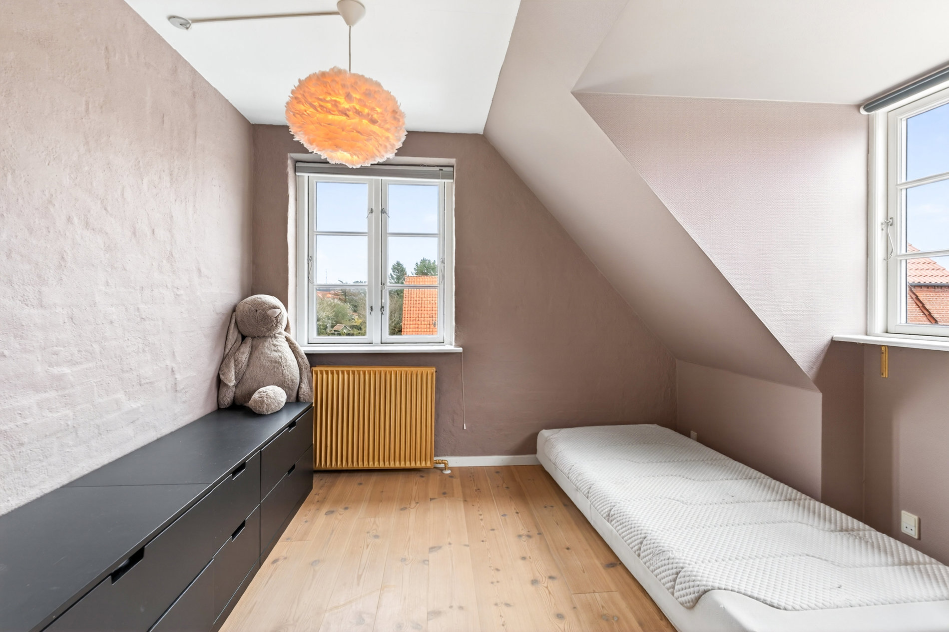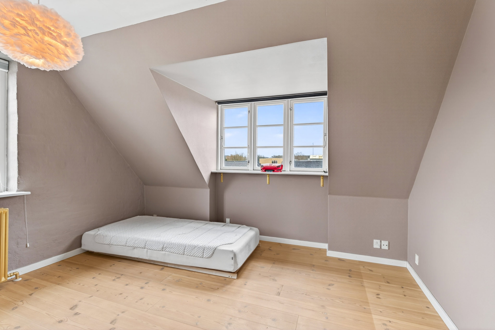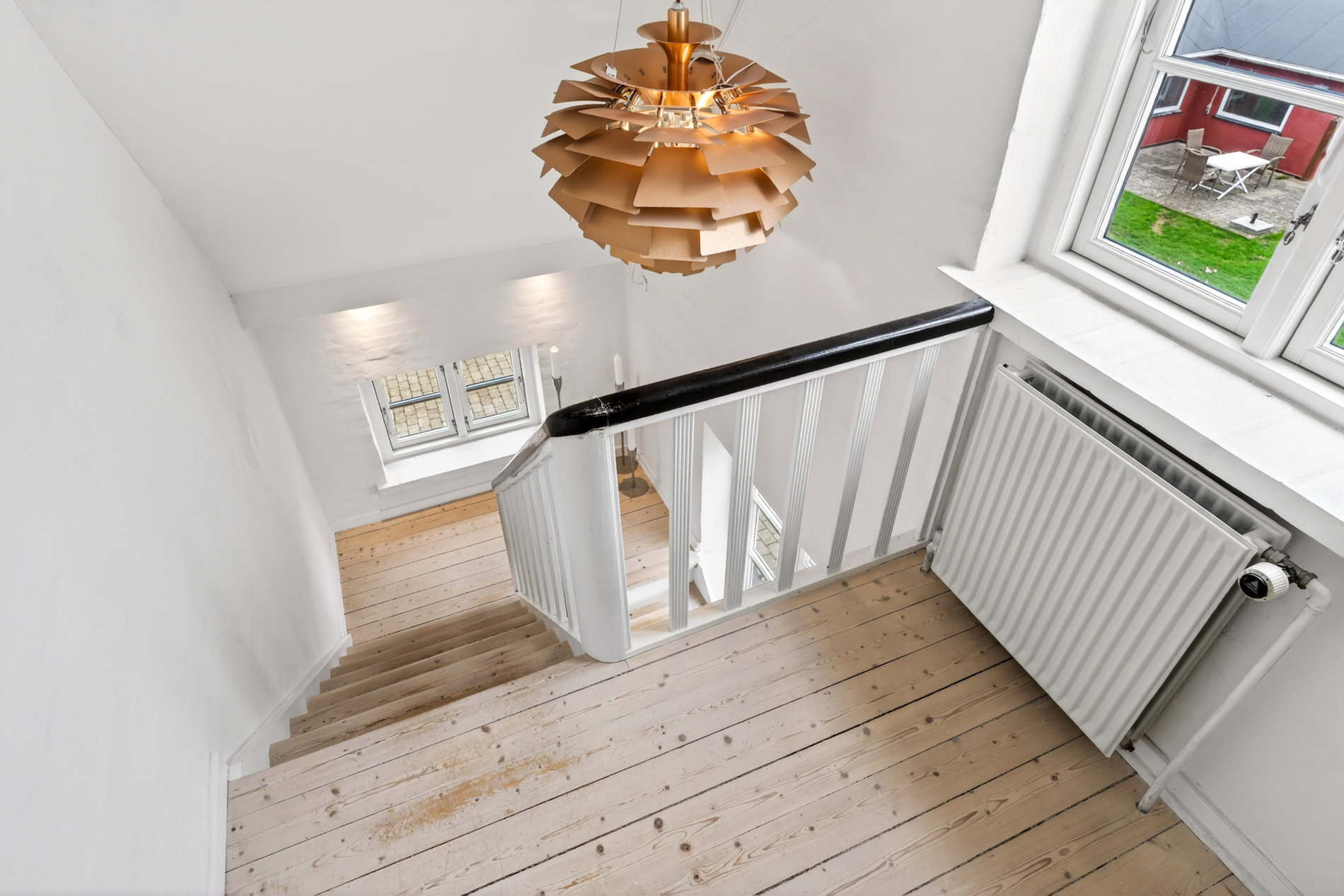 Den restaurerede trappe fører op til førstesalen, hvor planløsningen er ideel til familieliv. Her findes et stort soveværelse, to gode børneværelser samt et stort badeværelse med både karbad og bruseniche. Alle rum fremstår pænt istandsatte og klar til indflytning.