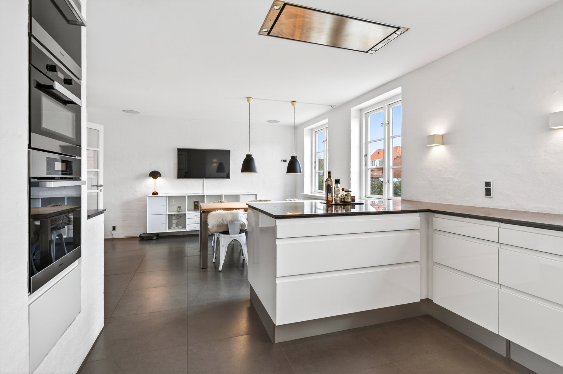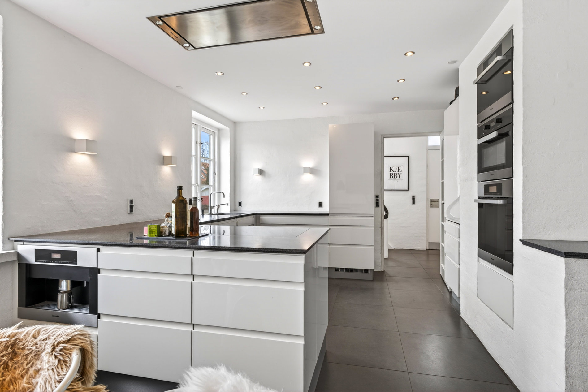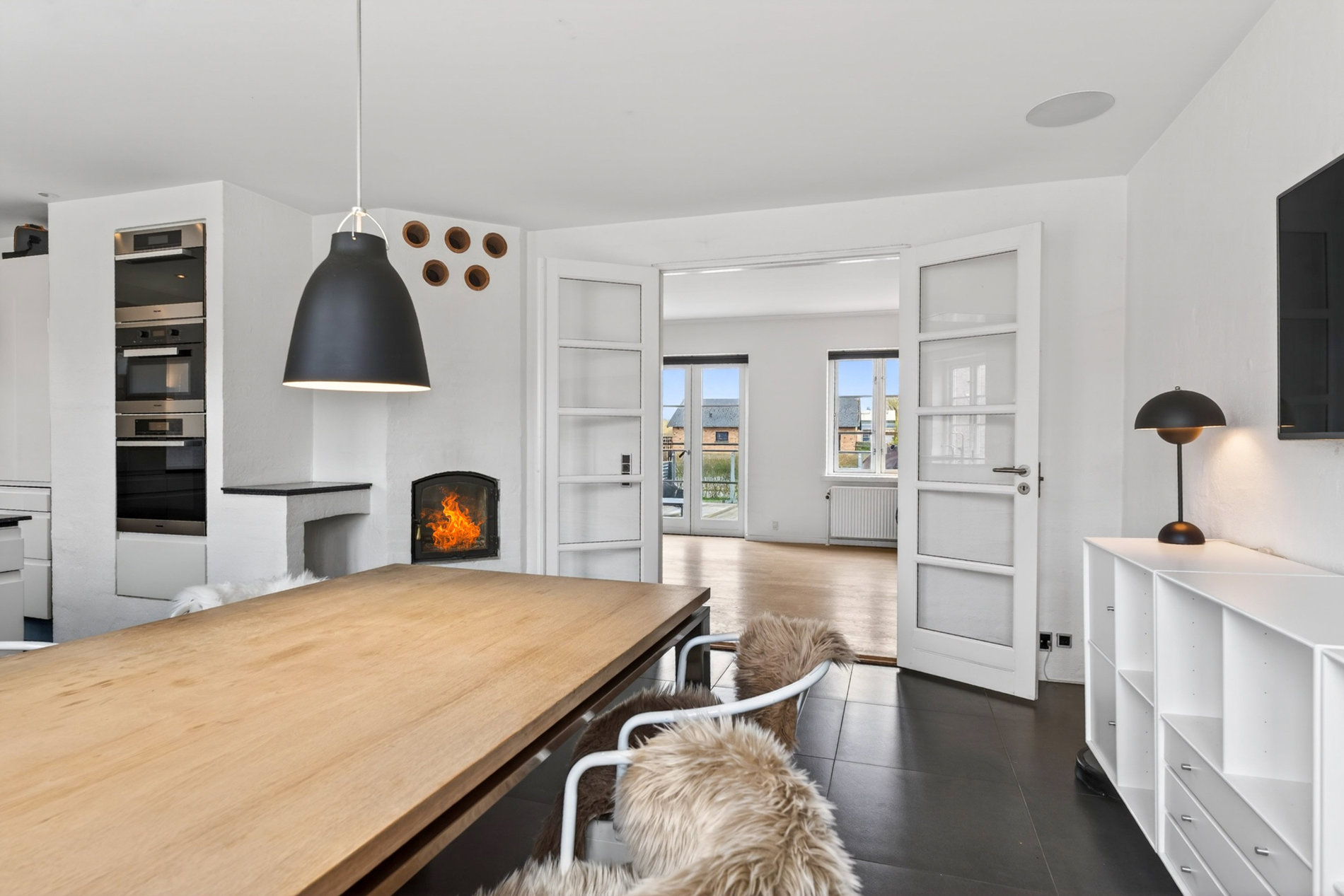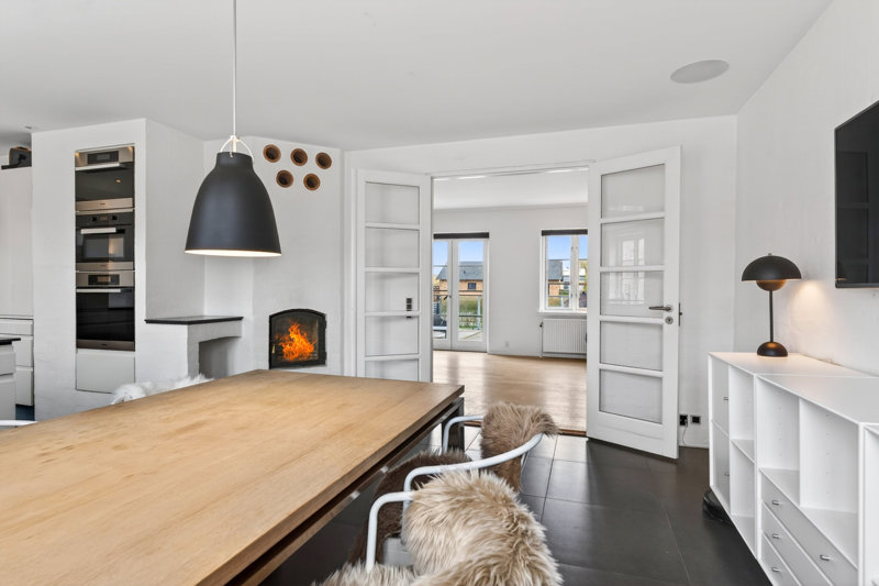 Boligens køkken er stort, åbent og særdeles rummeligt med god plads til både hverdagsliv og gæster. Den store spiseplads ligger naturligt i forlængelse af køkkenet og bindes elegant sammen med stuen via de franske glasdøre, der skaber mulighed for både åbenhed og afskærmning mellem opholdsrummene.