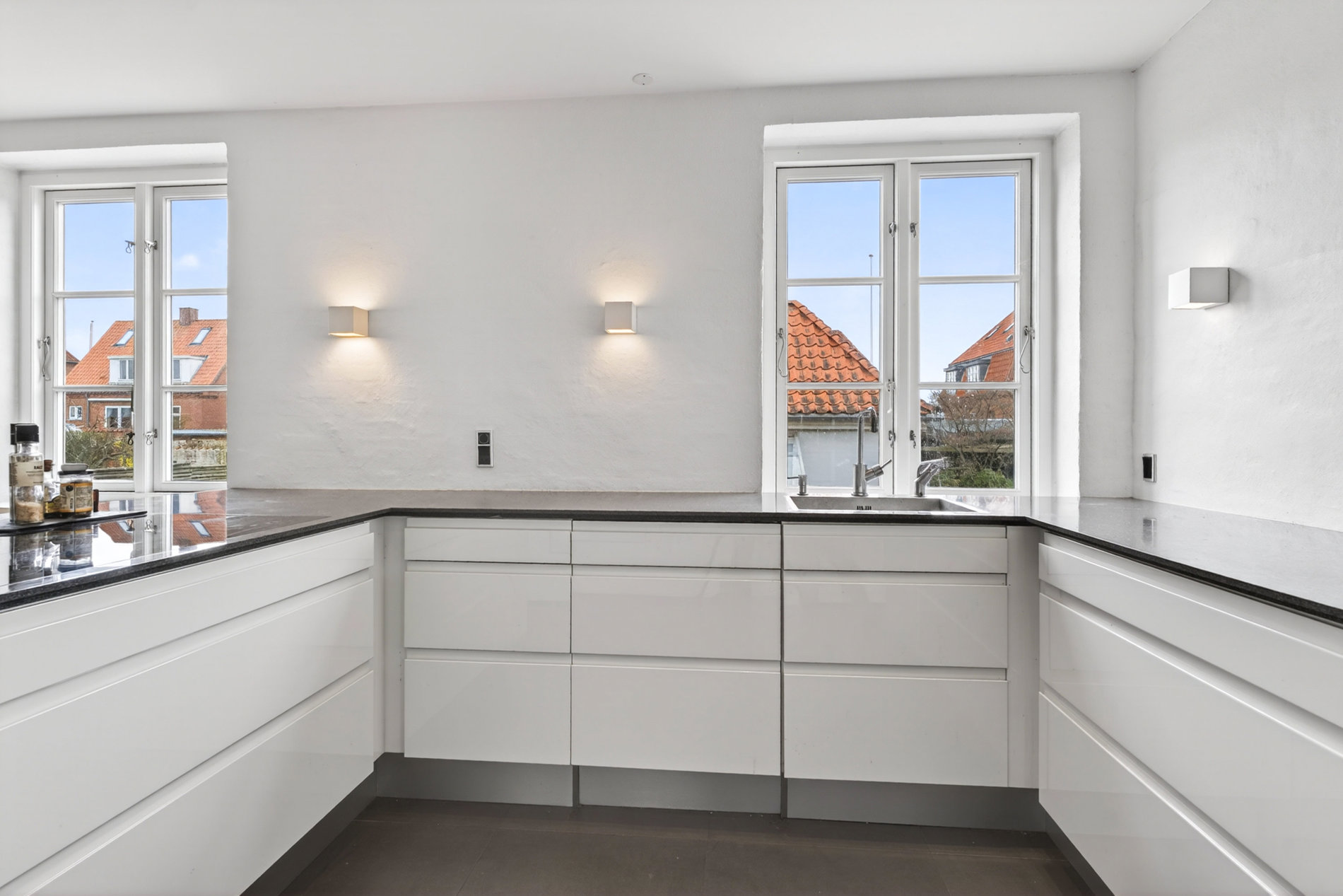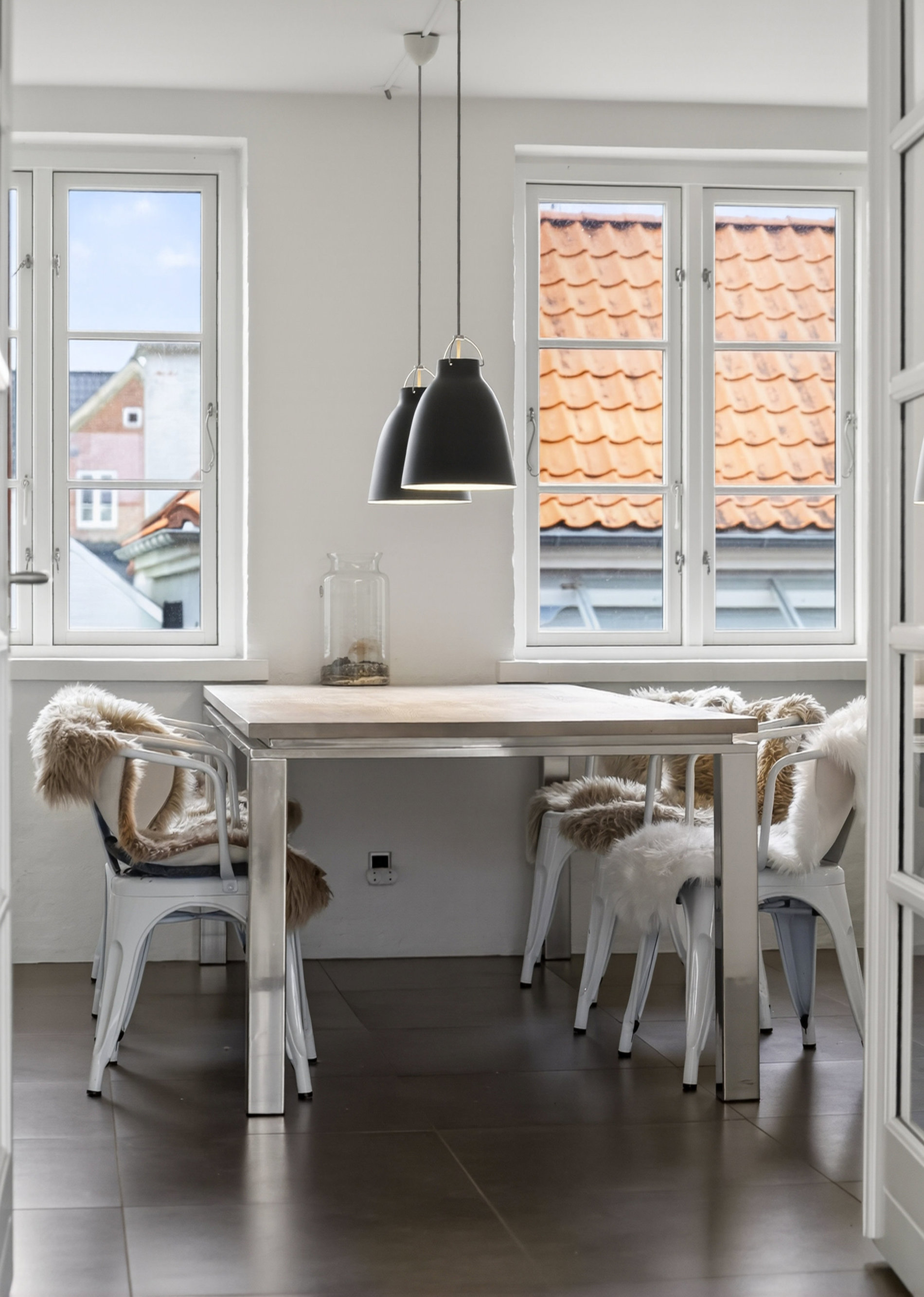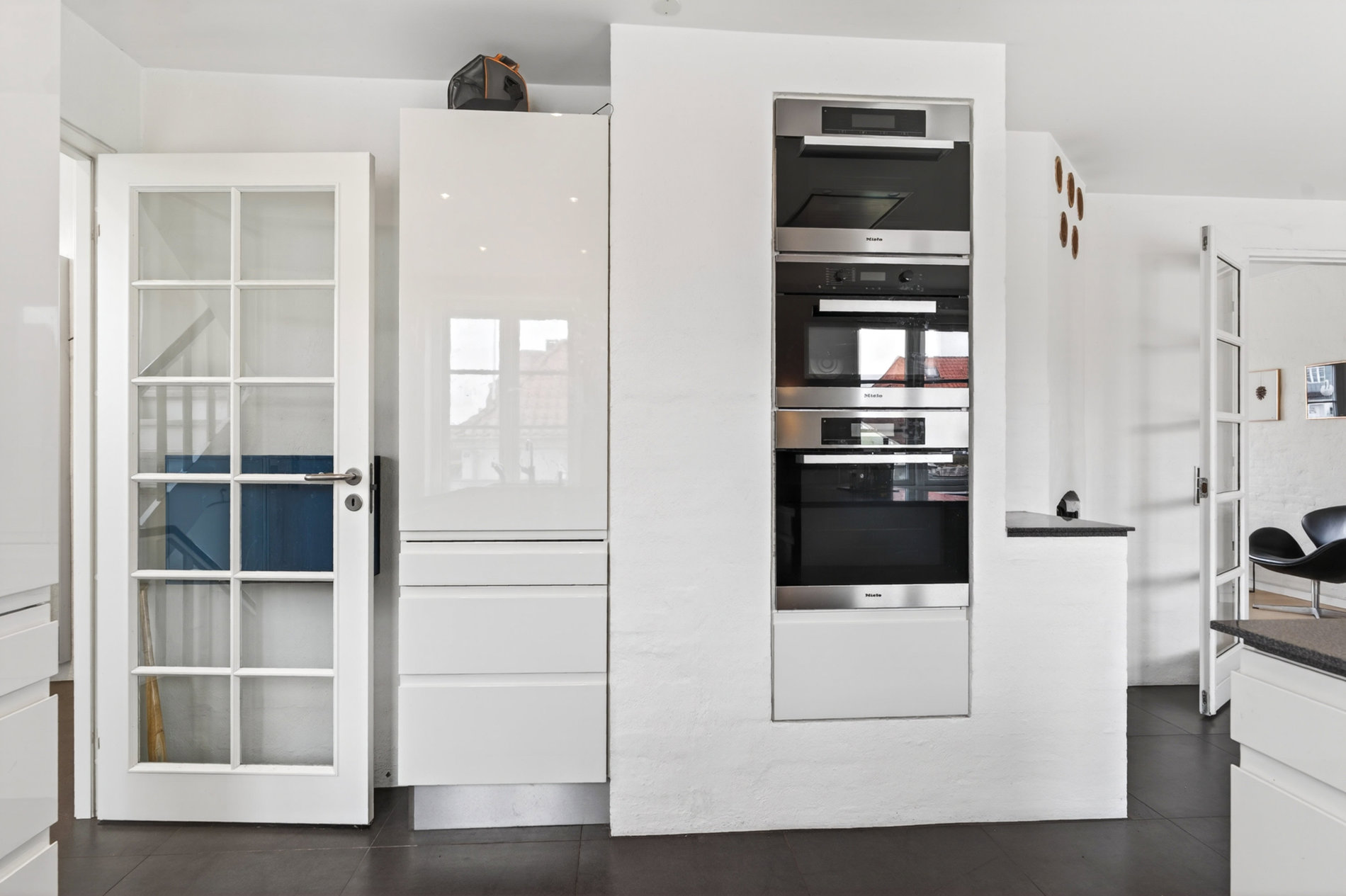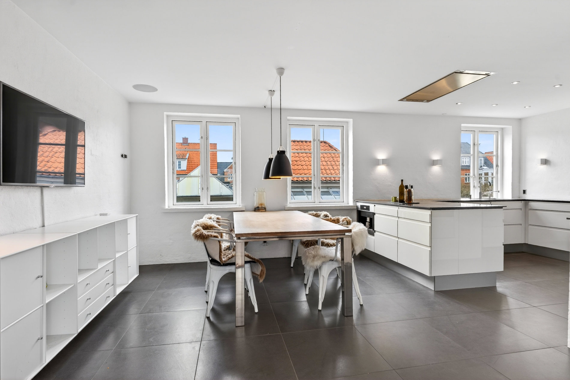 Boligens køkken er stort, åbent og særdeles rummeligt med god plads til både hverdagsliv og gæster. Den store spiseplads ligger naturligt i forlængelse af køkkenet og bindes elegant sammen med stuen via de franske glasdøre, der skaber mulighed for både åbenhed og afskærmning mellem opholdsrummene.