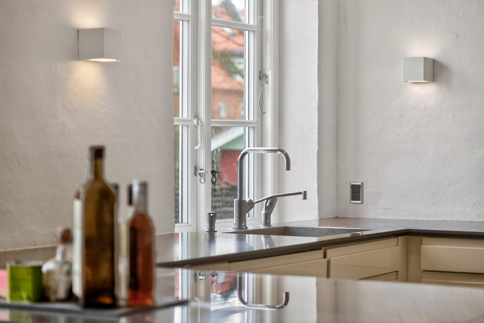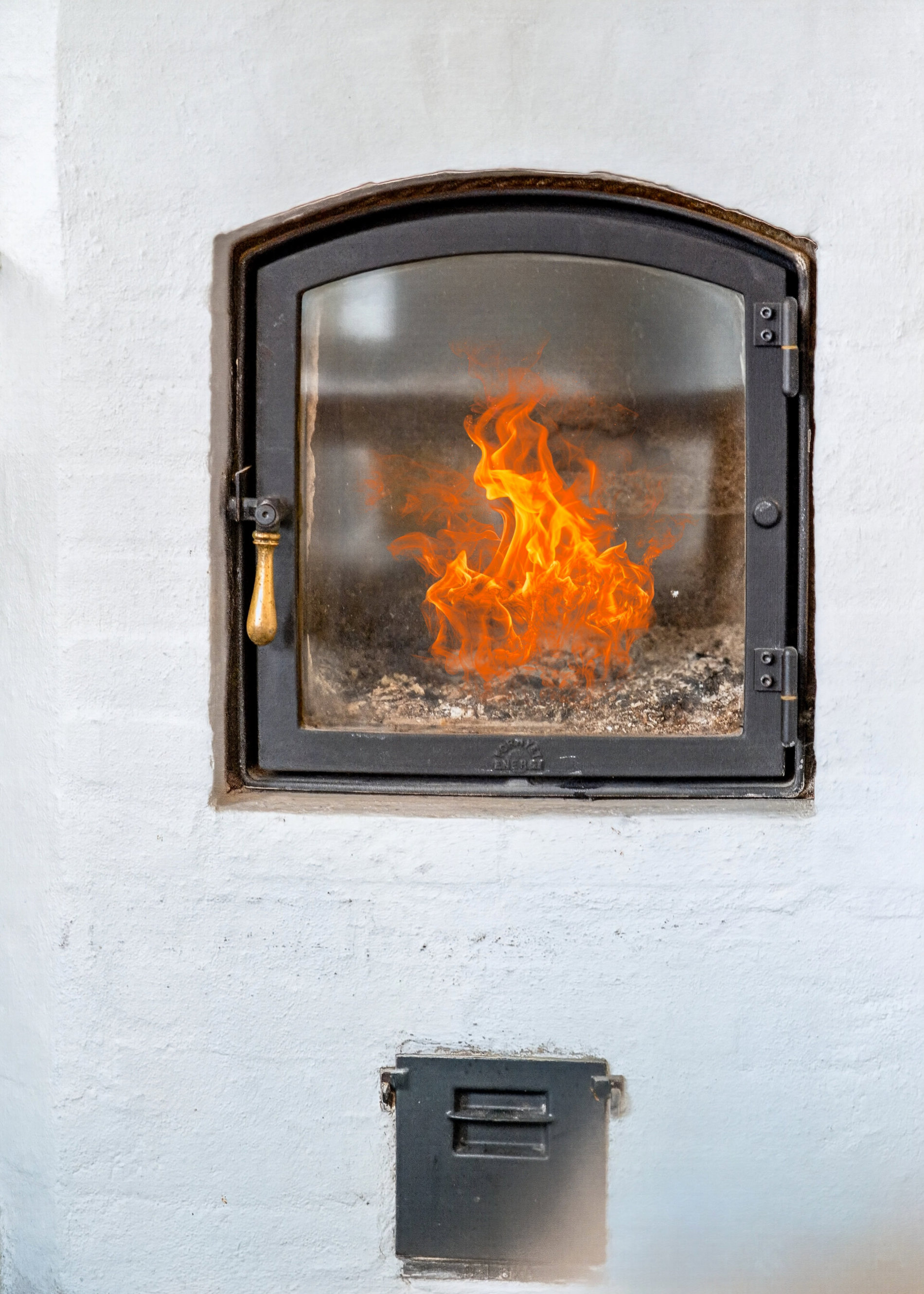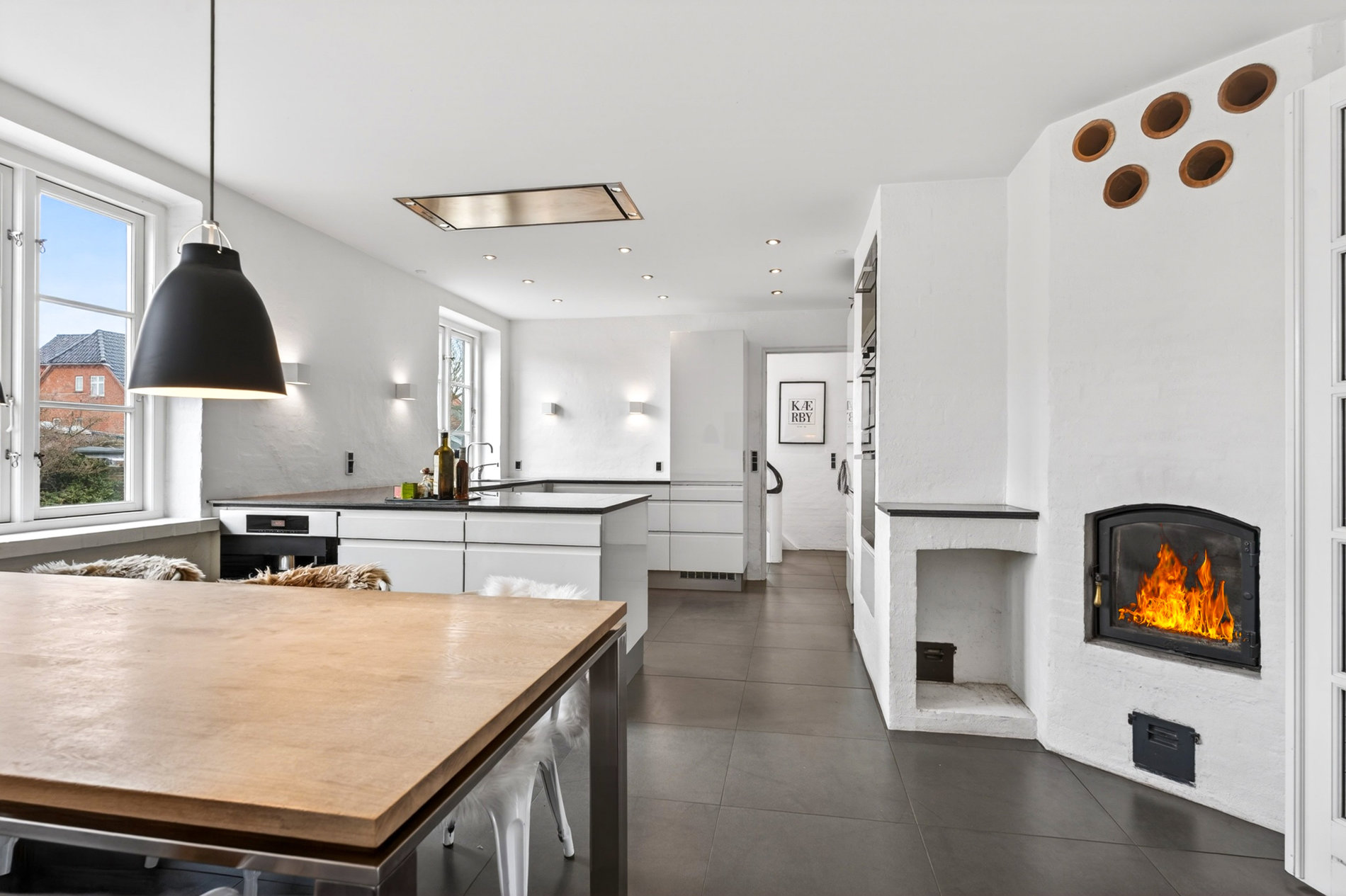 Køkkenet er indrettet med gulvvarme, integreret emhætte i loftet, spots og en markant køkkenø med masser af opbevaringsplads på begge sider. Fraværet af overskabe giver rummet luft, lys og et moderne, arkitektonisk udtryk. Ved spisepladsen står en finsk masseovn, der bidrager med både varme, stemning og en særlig tyngde i rummet.