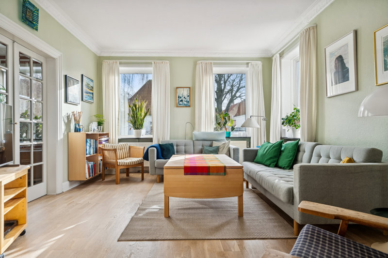 Indenfor venter 243 etagemeter, der er flot vedligeholdt og fyld af klassisk karakter: Stuklofterne tegner fine skygger i solen, rosetter pryder som små kunstværker, fyldningsdøre lukker med tyngde, og den originale trappe slynger sig opad med sit svungne træværk som husets arkitektoniske signatur. Kernen i huset har et så fint potentiale, som I sætte jeres eget personlige præg på.