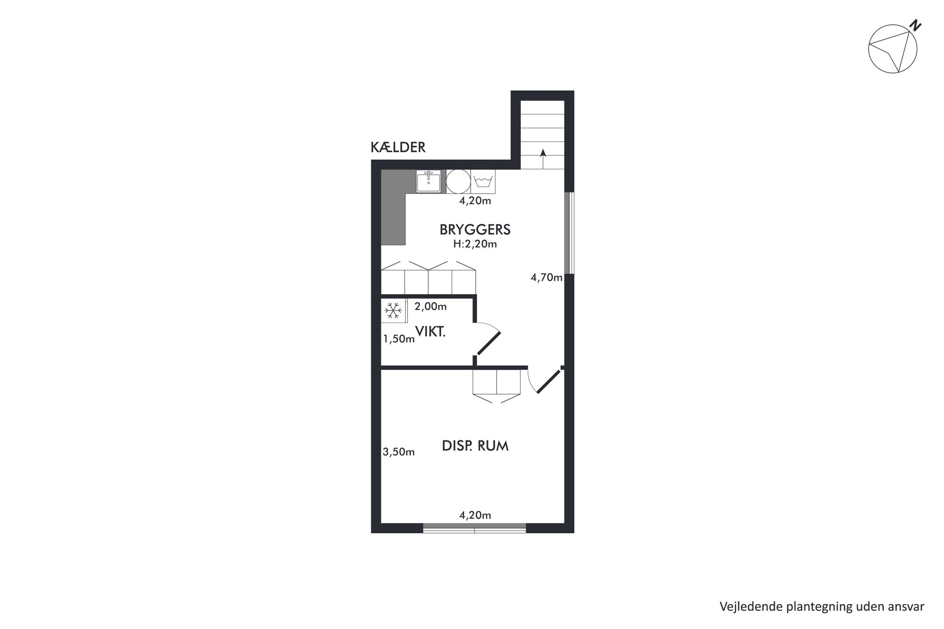 Kælderen på 35 m2 er et kæmpe aktiv med blandt andet er stort bryggers til vasketøj og hverdagens praktiske opgaver, viktualierum samt et rummeligt, disponibelt rum med mange anvendelsesmuligheder -- her kan du etablere værksted, opbevaring eller lade hobbyprojekterne blomstre.