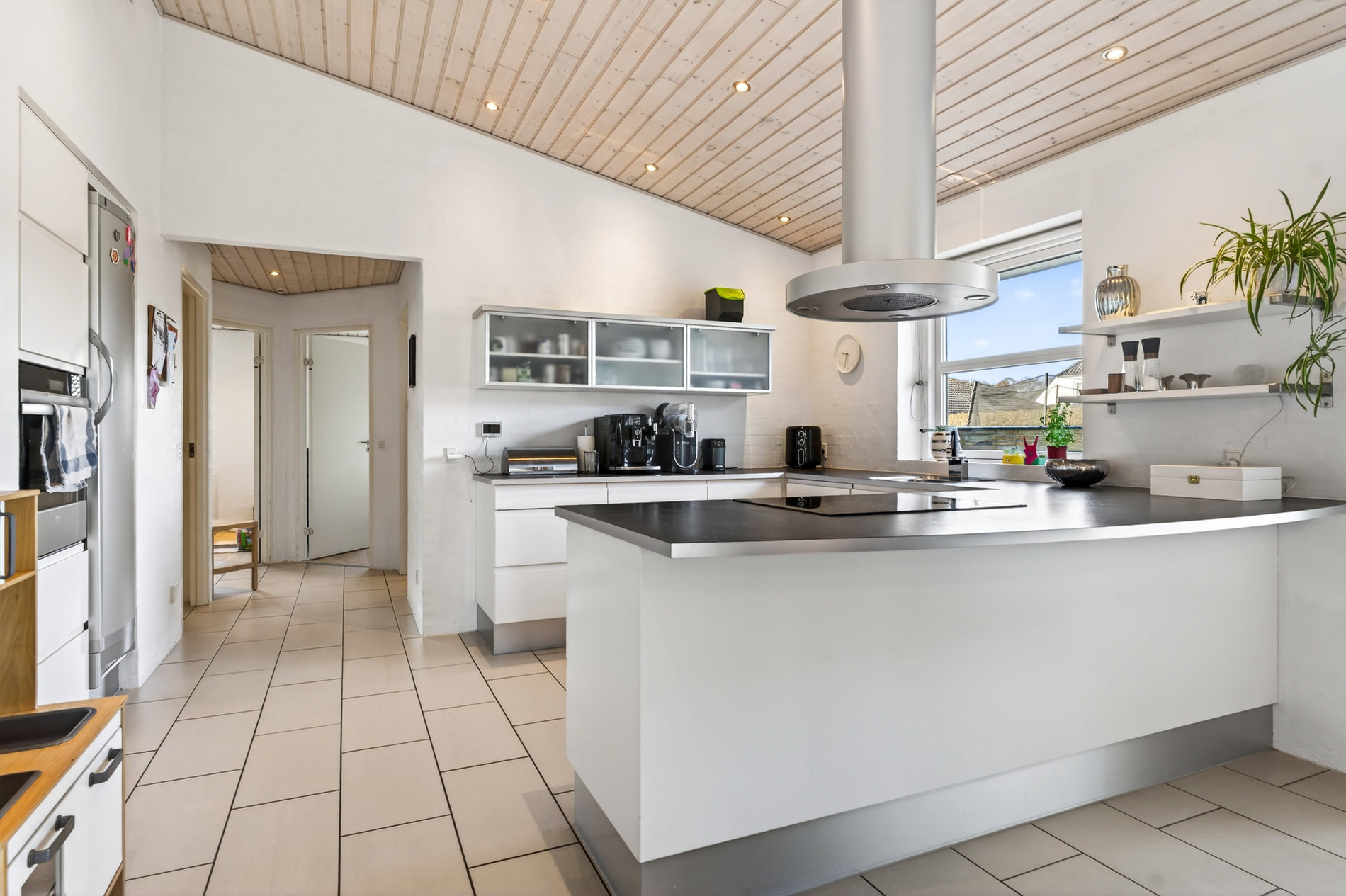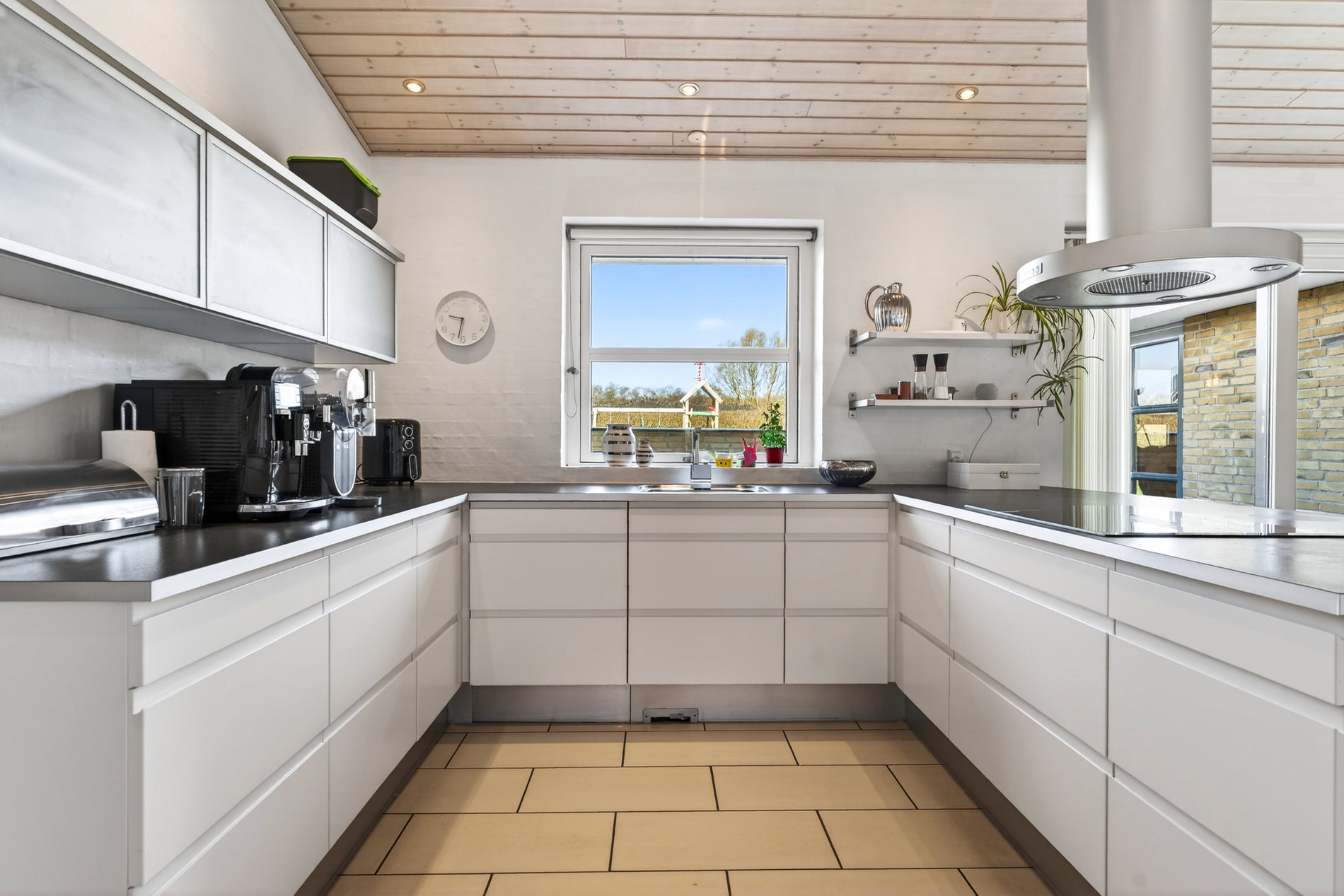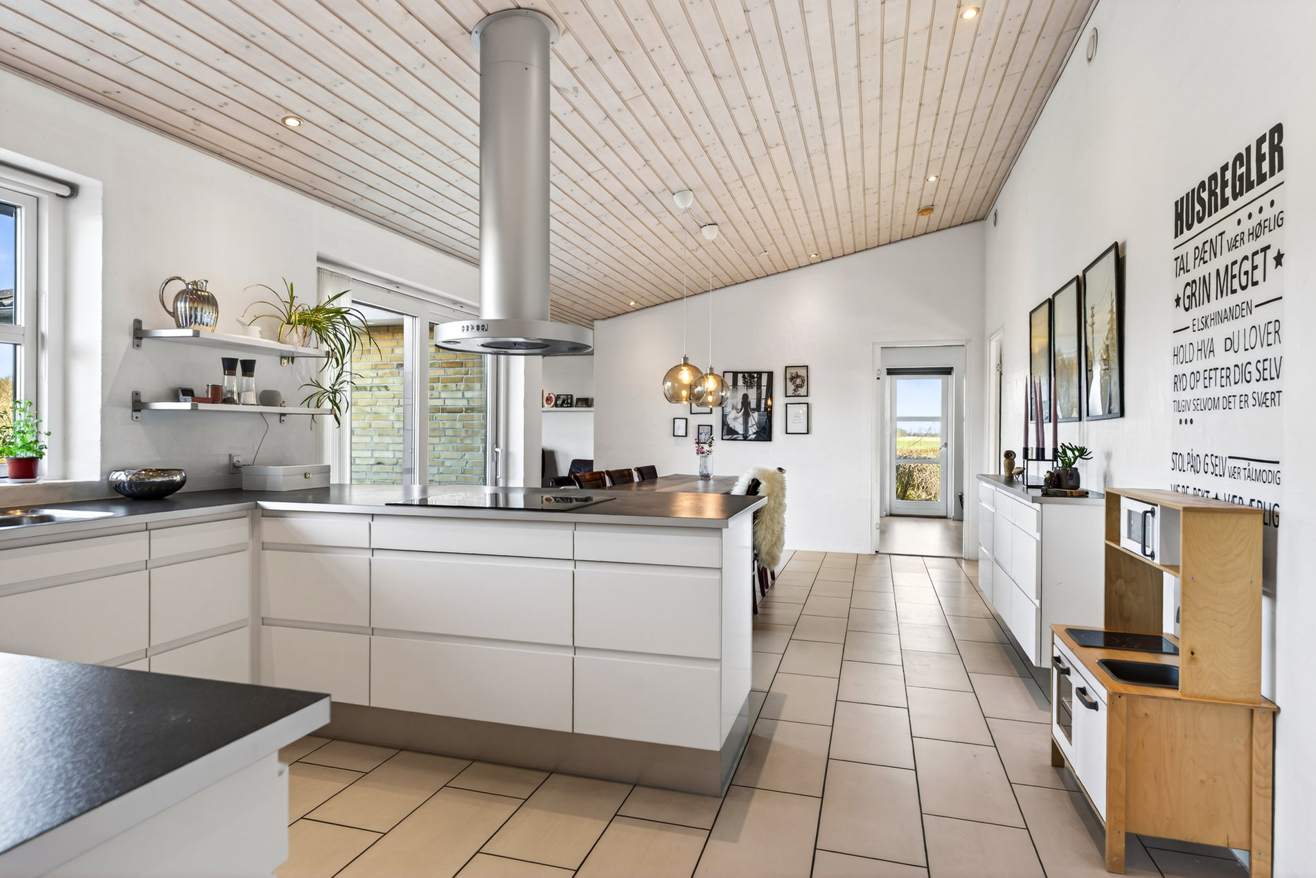 · Kæmpestort køkkenalrum med klinkegulv, store vinduespartier og direkte udgang til terrasse