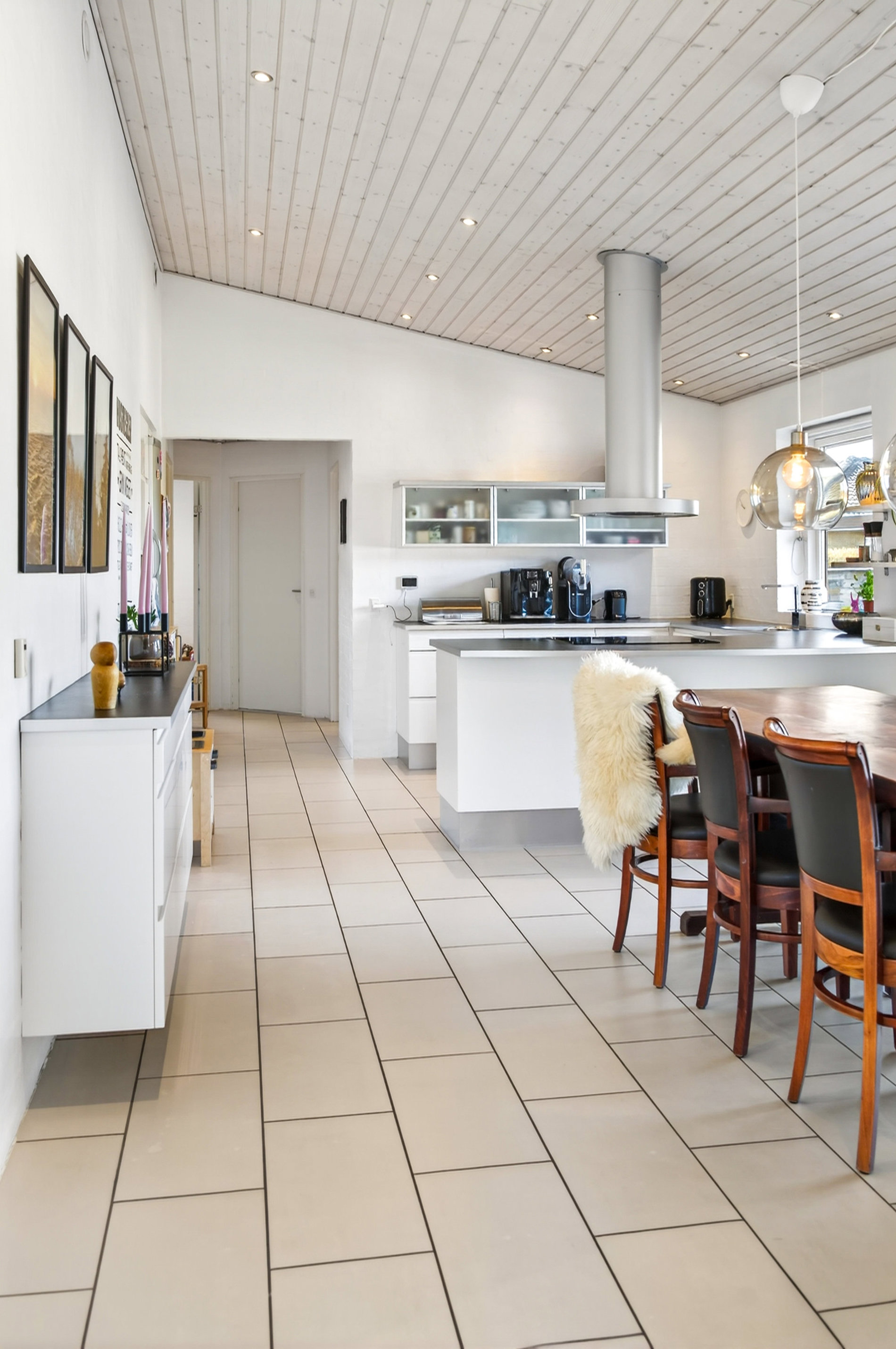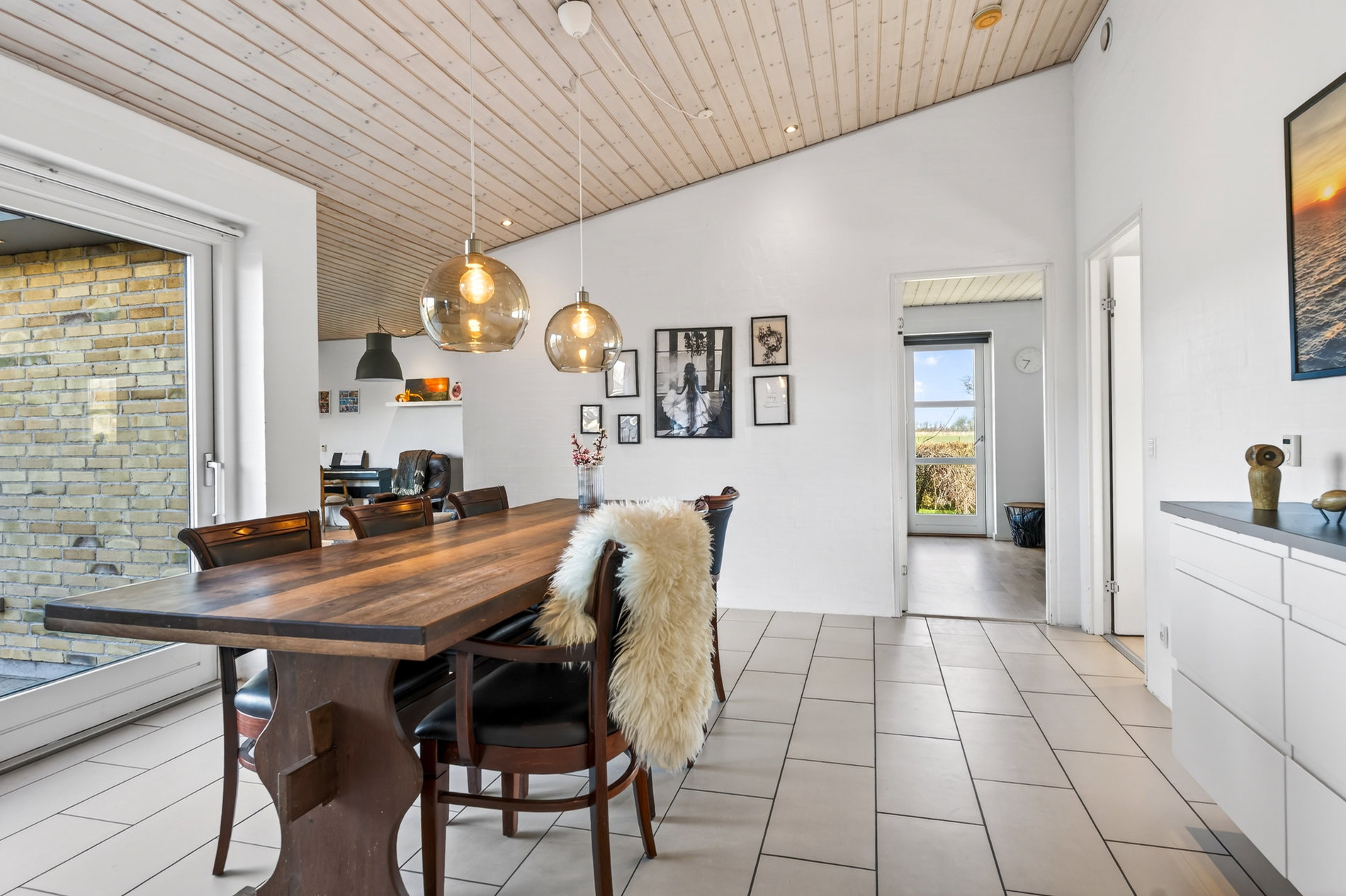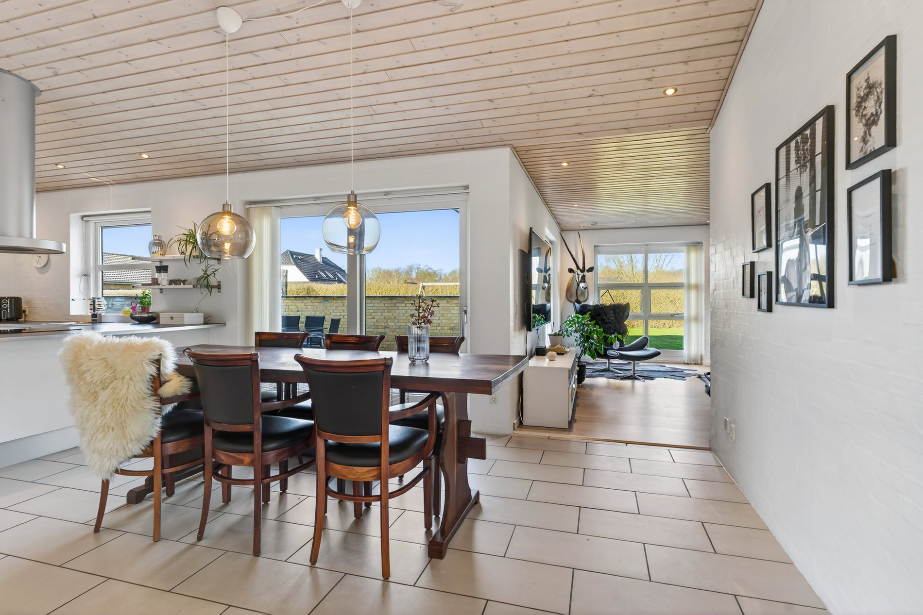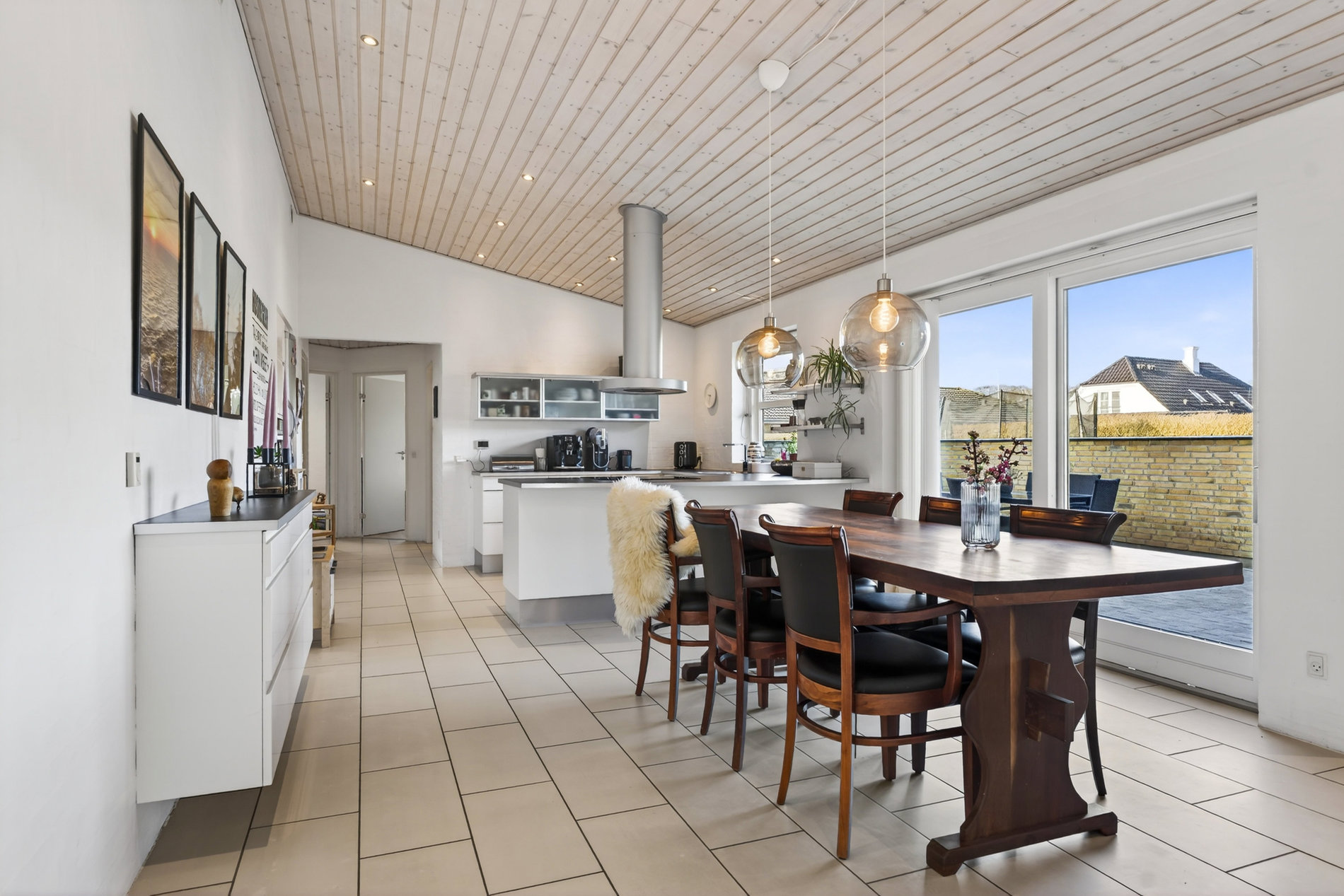 · Kæmpestort køkkenalrum med klinkegulv, store vinduespartier og direkte udgang til terrasse
