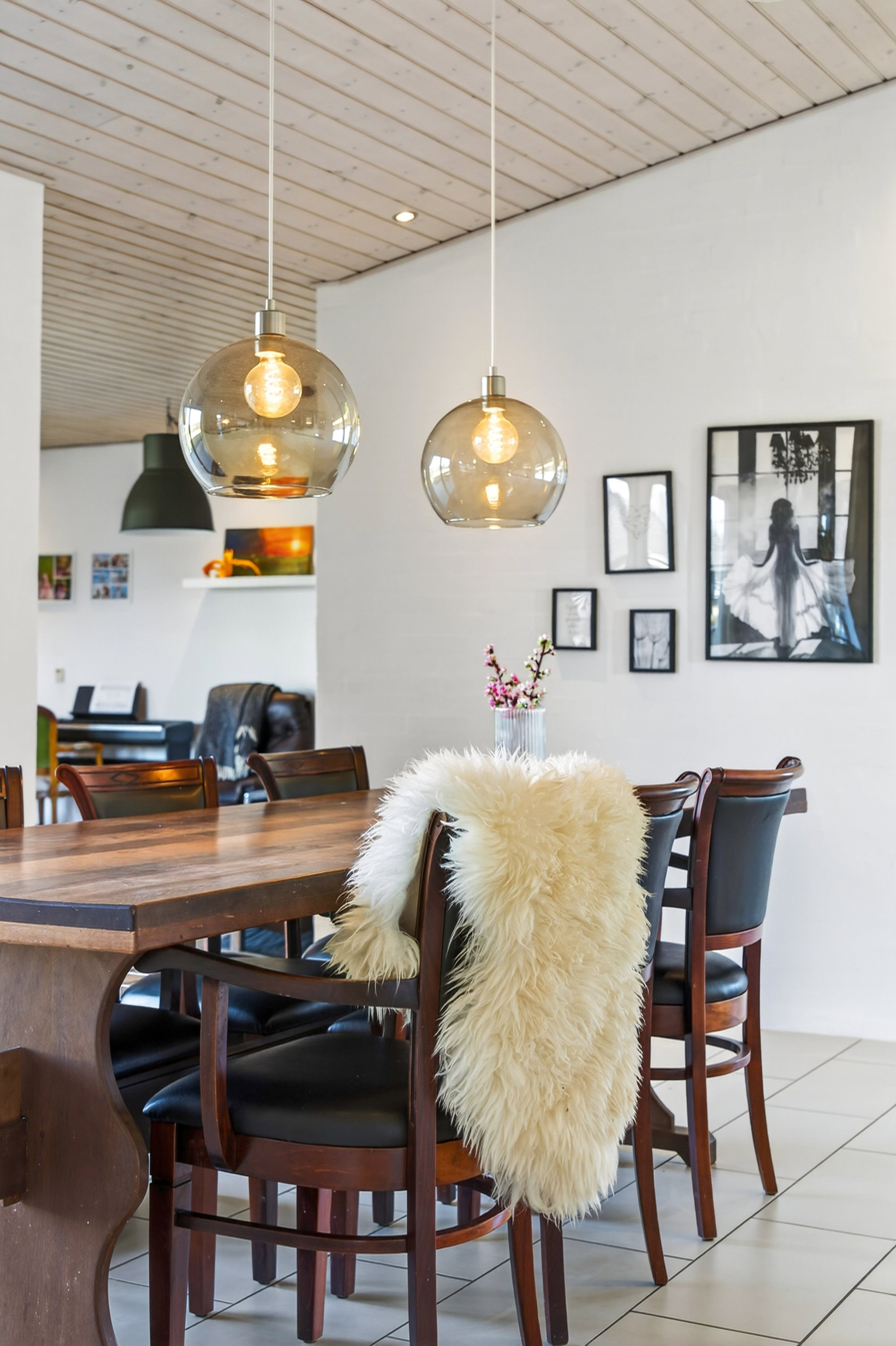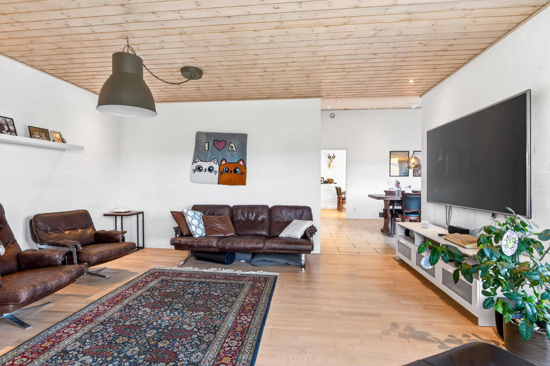 Husets naturlige opholdssted er det imponerende køkkenalrum, hvor plads, lys og funktionalitet går op i en højere enhed. Her er praktiske klinker på gulvet, store vinduespartier og mulighed for at åbne rummet helt op mod den lukkede terrasse. Køkkenalrummet indbyder til både hverdagsliv, gæster og større sammenkomster. I forlængelse heraf ligger den hyggelige stue, som skaber et mere tilbagetrukket opholdsrum, hvor du kan nyde et smukt kig til haven og det grønne landskab udenfor.