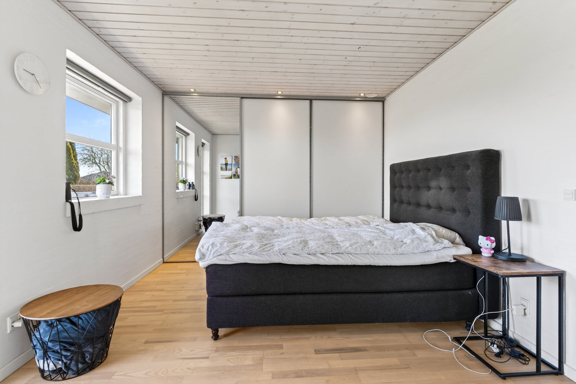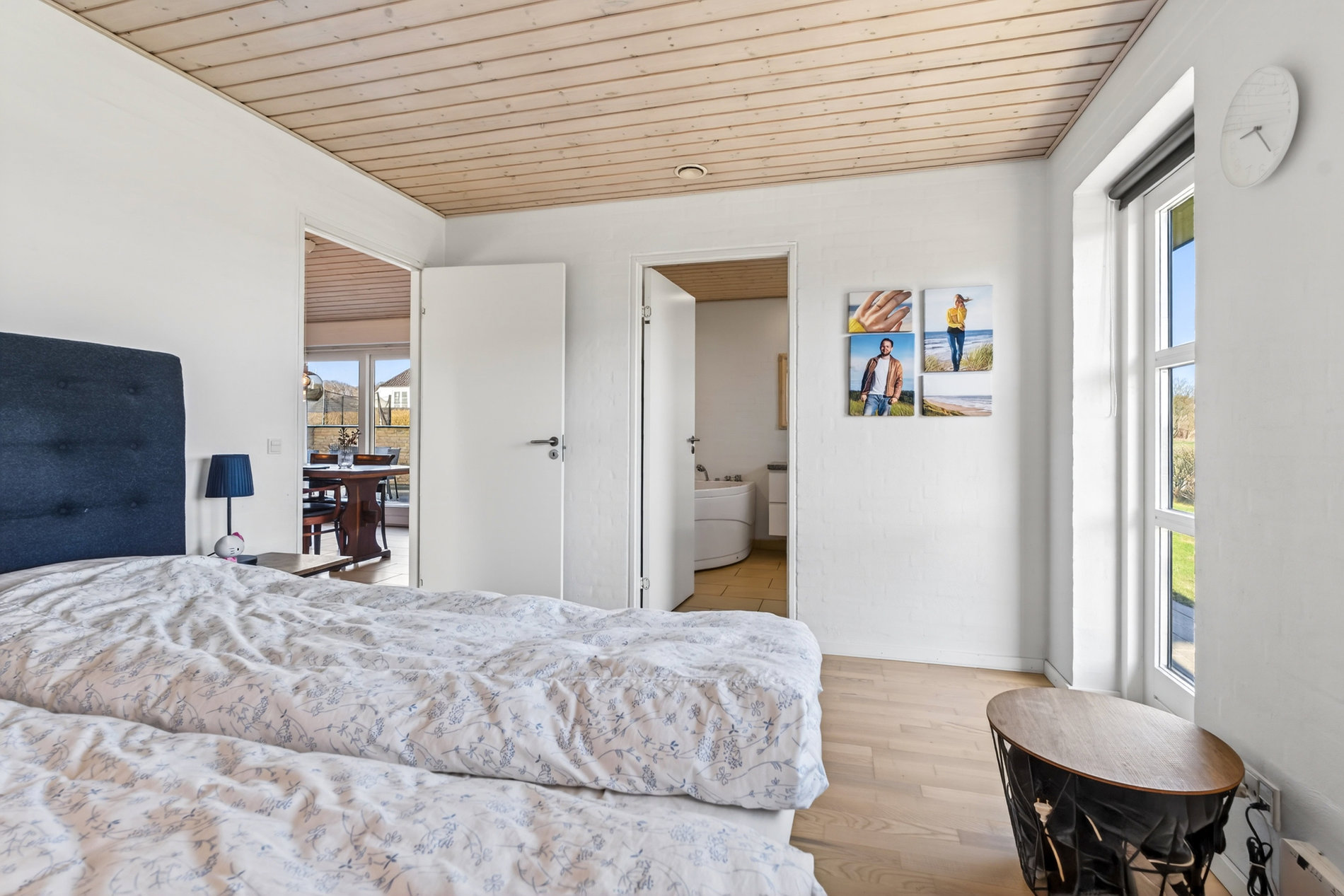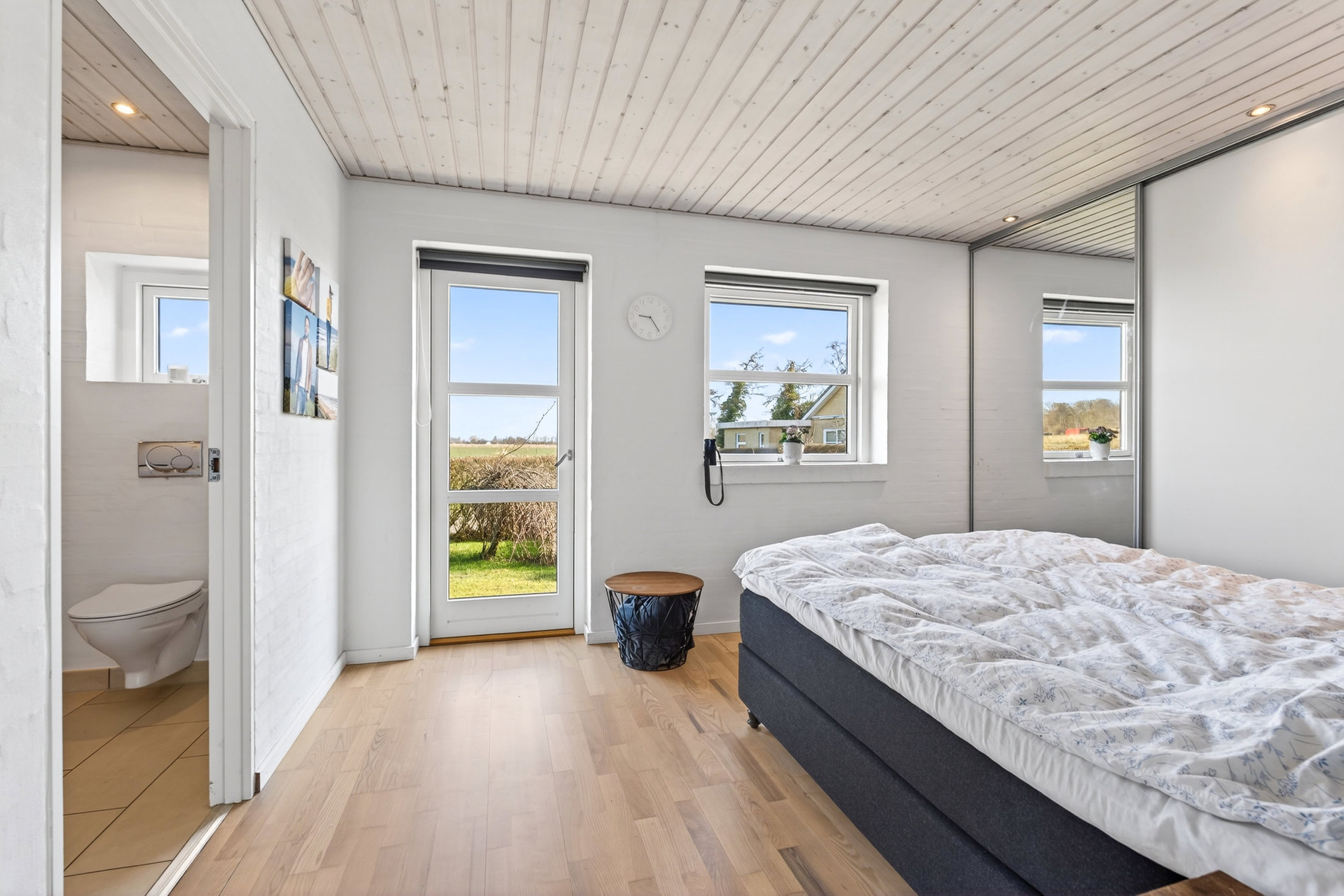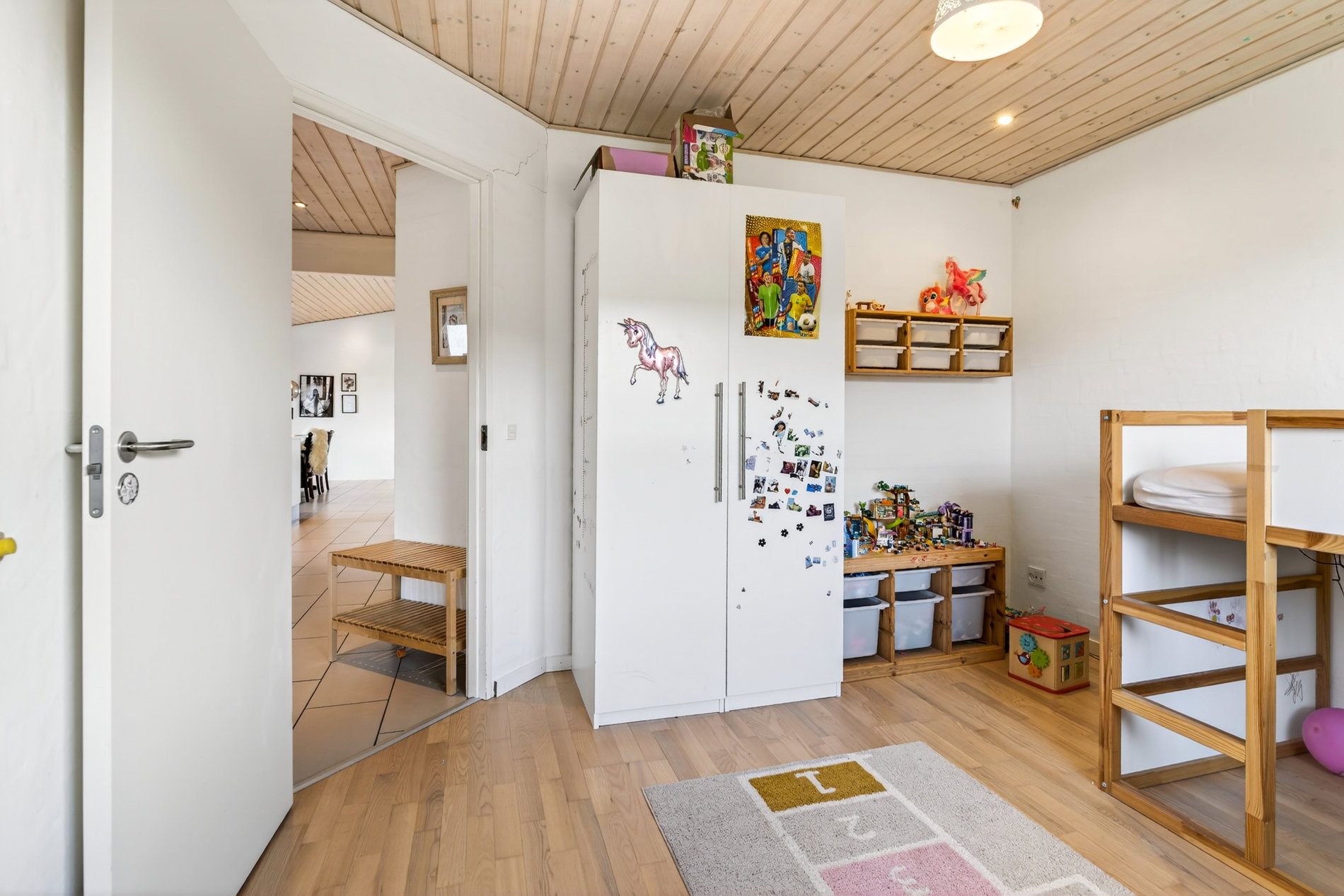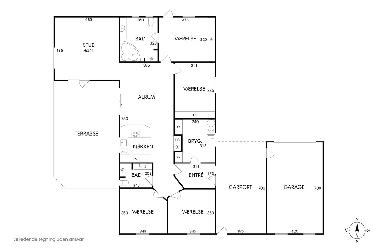 Planløsningen er ideel til familien, der ønsker både fællesskab og privatliv. Voksenafdelingen ligger afskærmet og byder på et stort soveværelse med direkte udgang til haven samt eget badeværelse med hjørnebadekar og spa, som du har adgang til via soveværelset. I modsatte ende af huset finder du tre store værelser, hvoraf ét i dag anvendes som kontor, samt endnu et pænt badeværelse med bruseniche. Alle værelser har gode opbevaringsløsninger, og bryggerset fremstår særdeles funktionelt med langt bord, skabe og god plads til hverdagens praktiske gøremål.