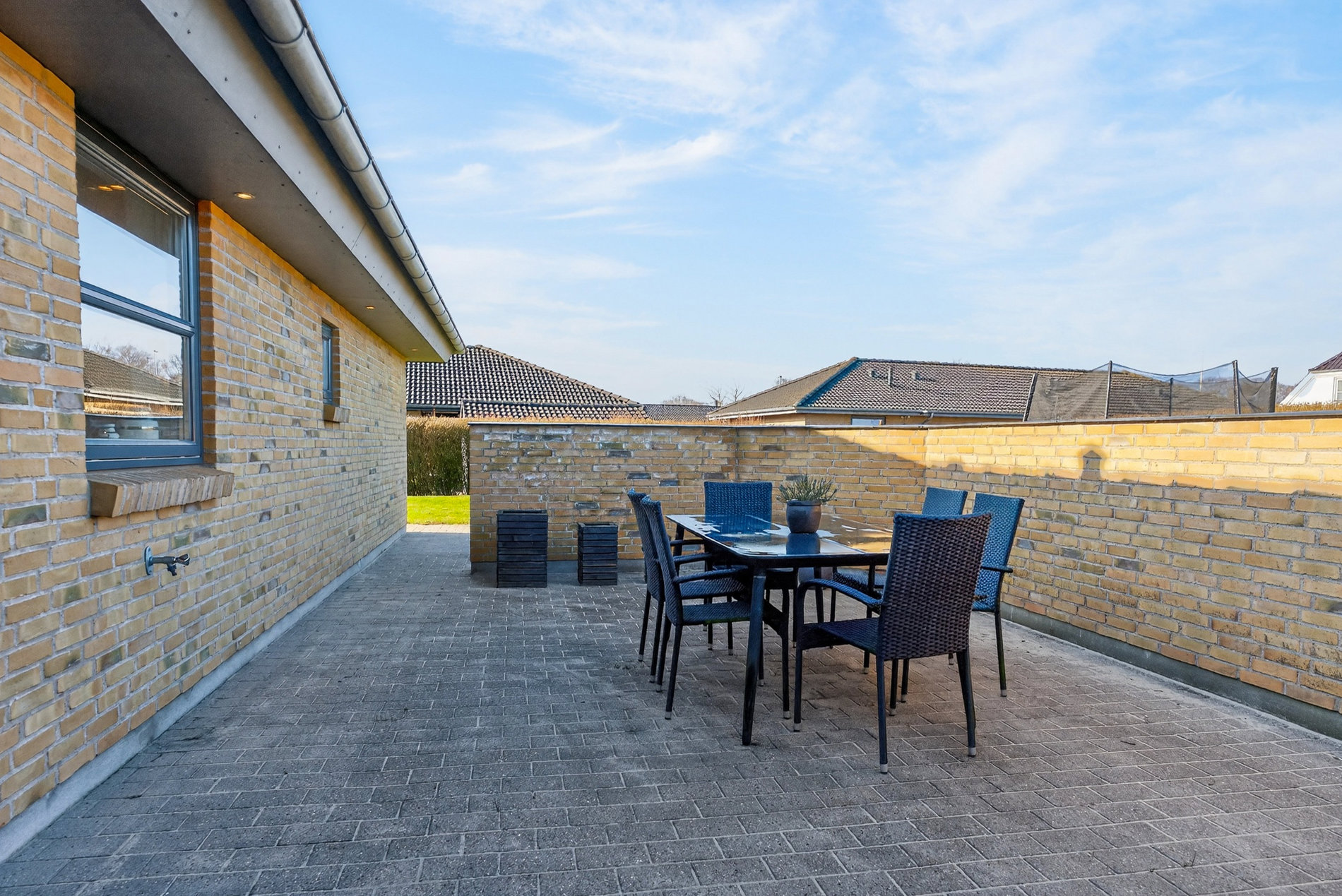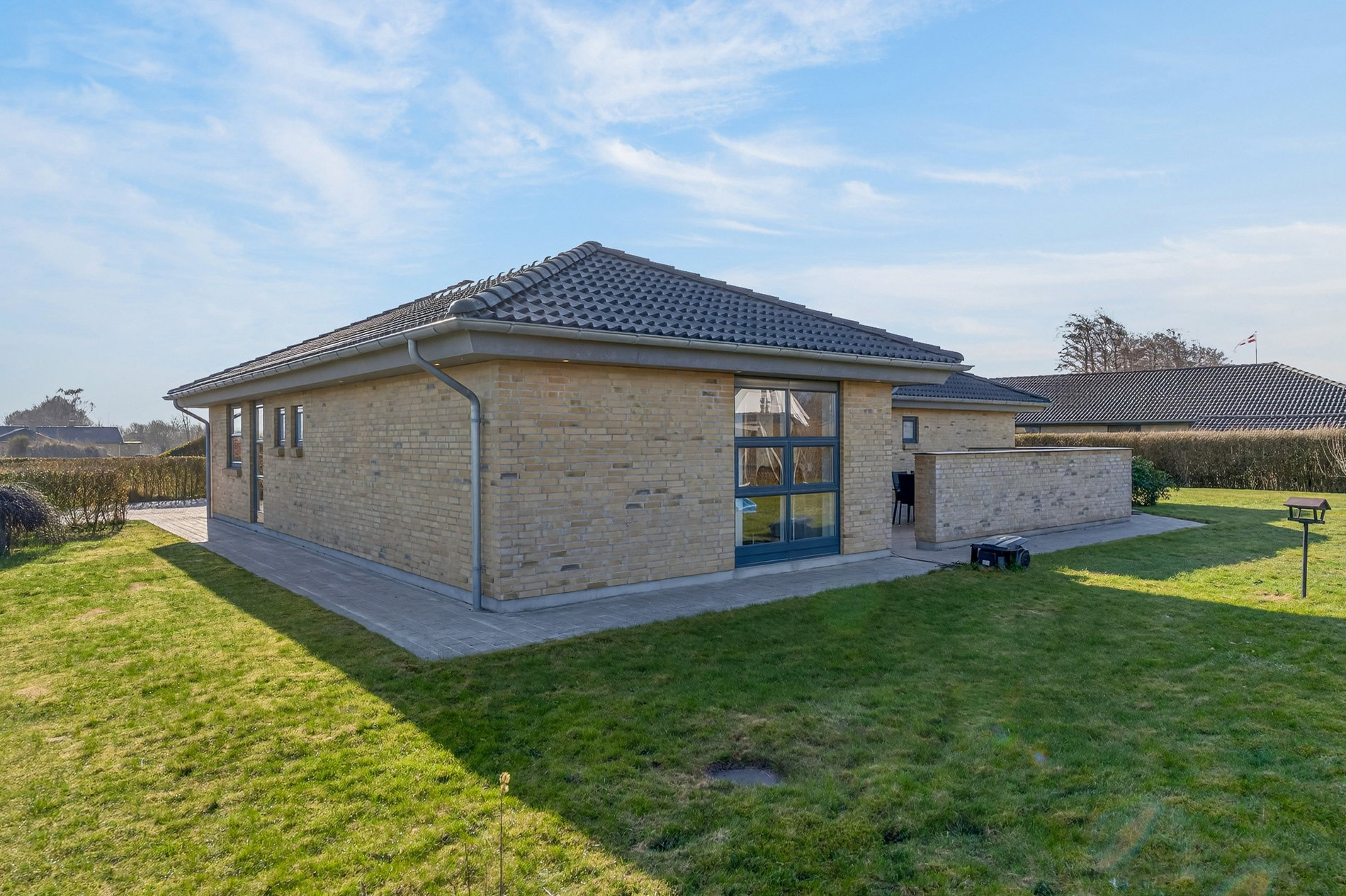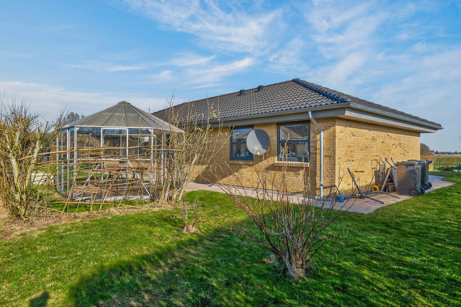 Haven er velanlagt og indbydende med drivhus/orangeri, der forlænger sæsonen og giver mulighed for både dyrkning og afslapning. Den store, lukkede terrasse med halvmur skaber læ, privatliv og et skønt uderum, hvor måltider og sommerdage kan nydes uforstyrret.