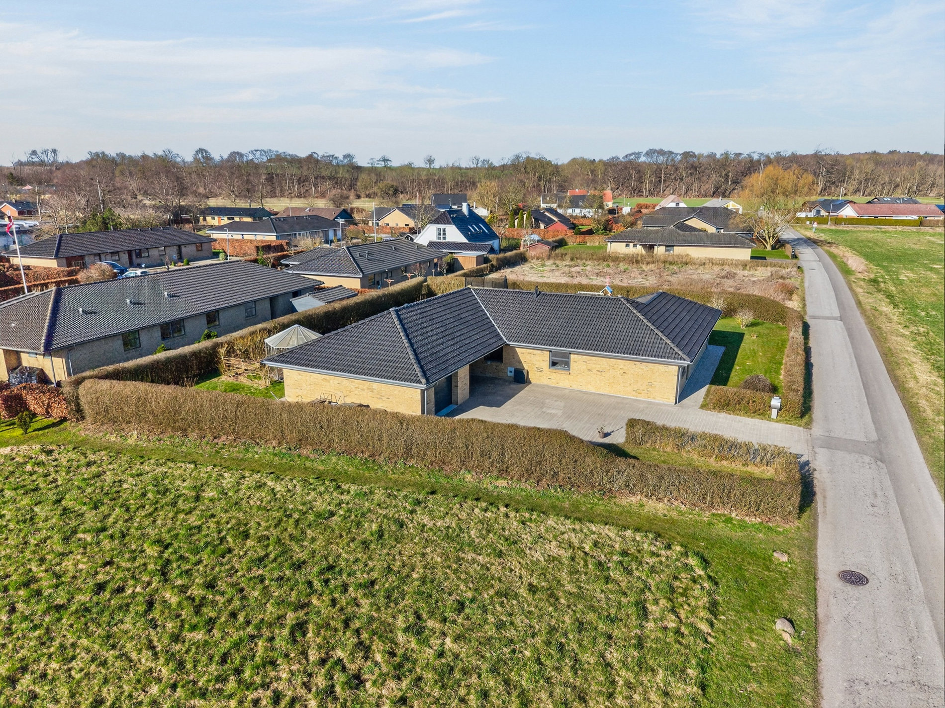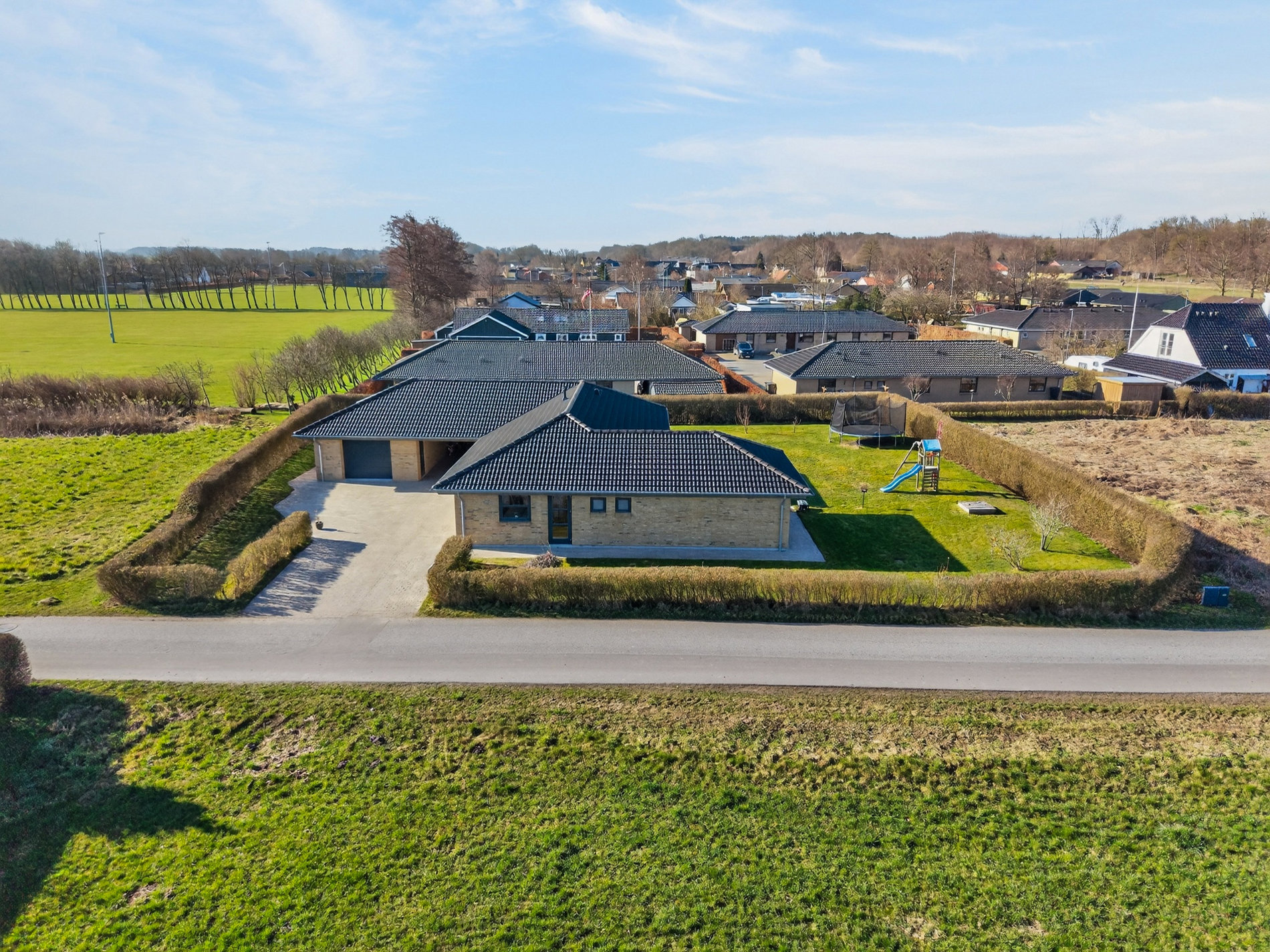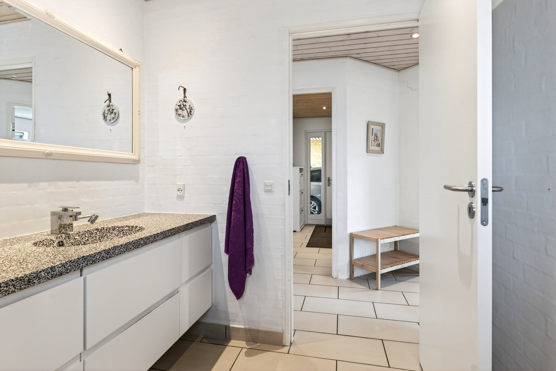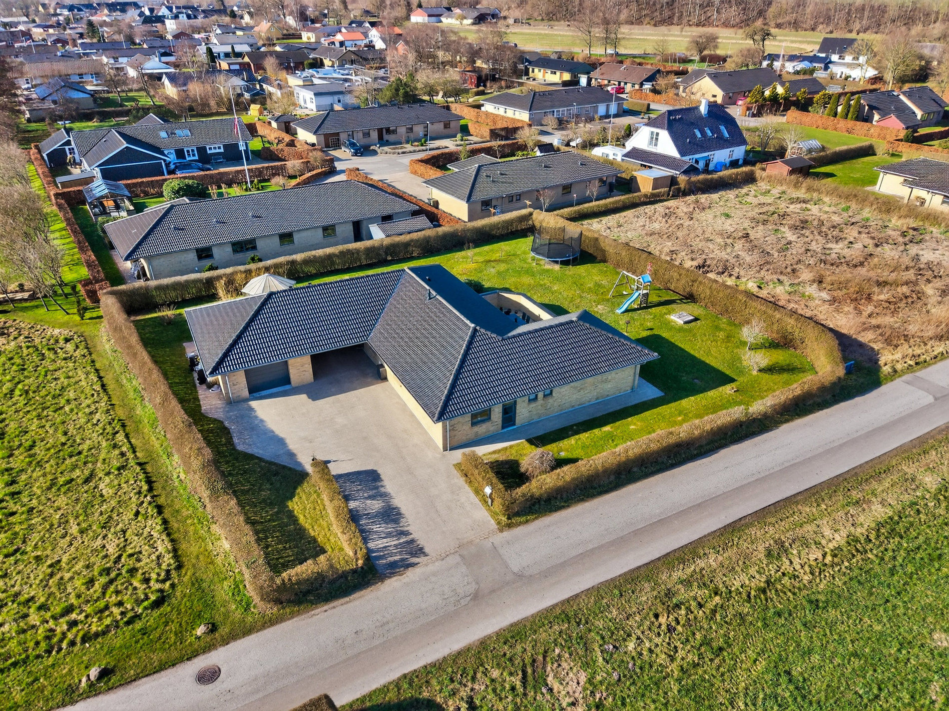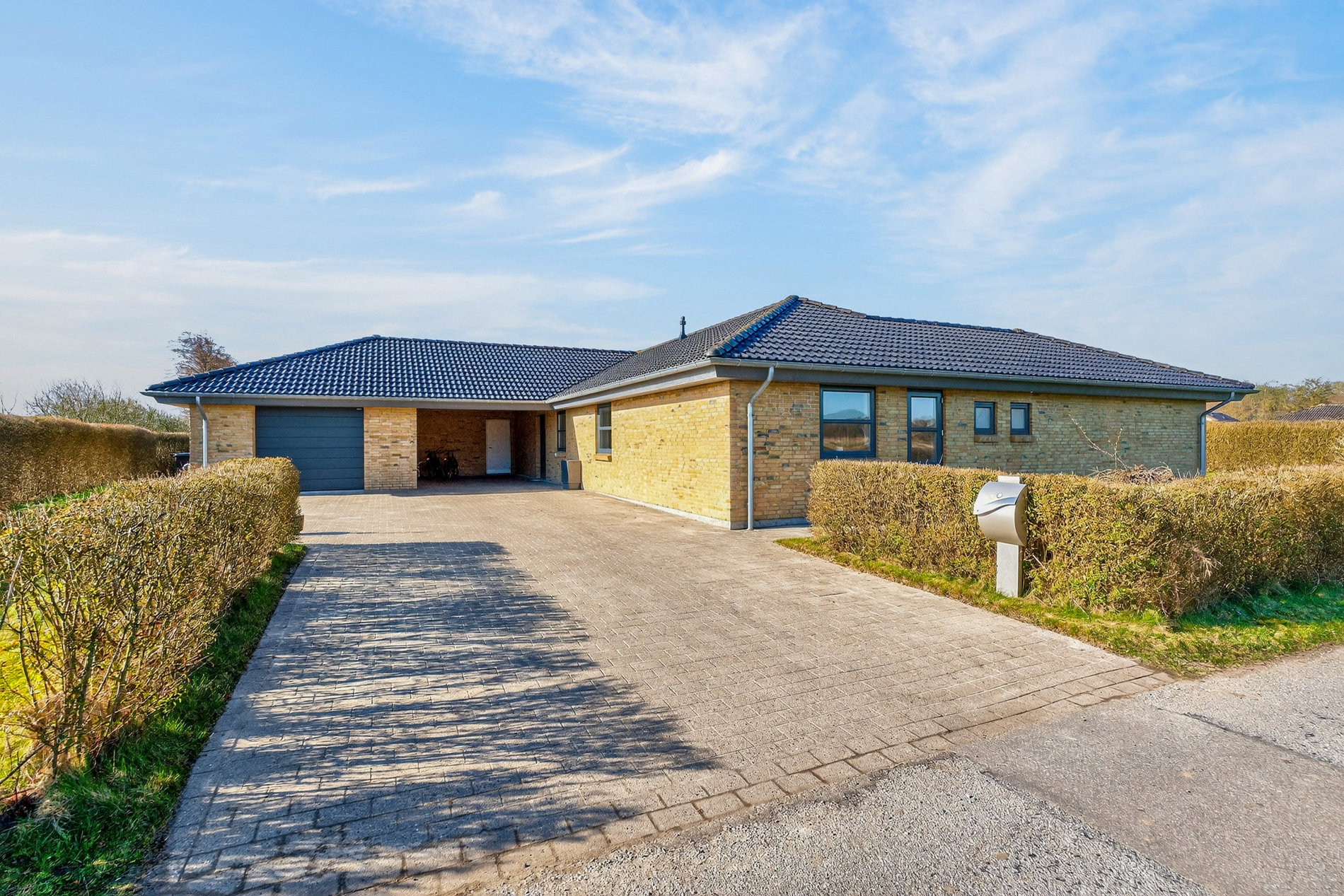 Indkørslen er stor og flot anlagt med både lukket garage og carport, så der er plads til både biler, cykler og opbevaring, og herfra er der direkte adgang til entréen, hvilket gør hverdagen ekstra bekvem.