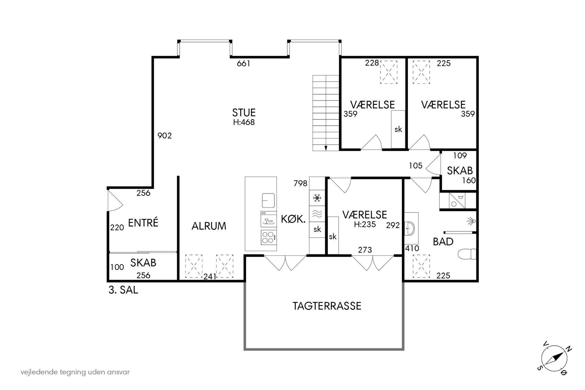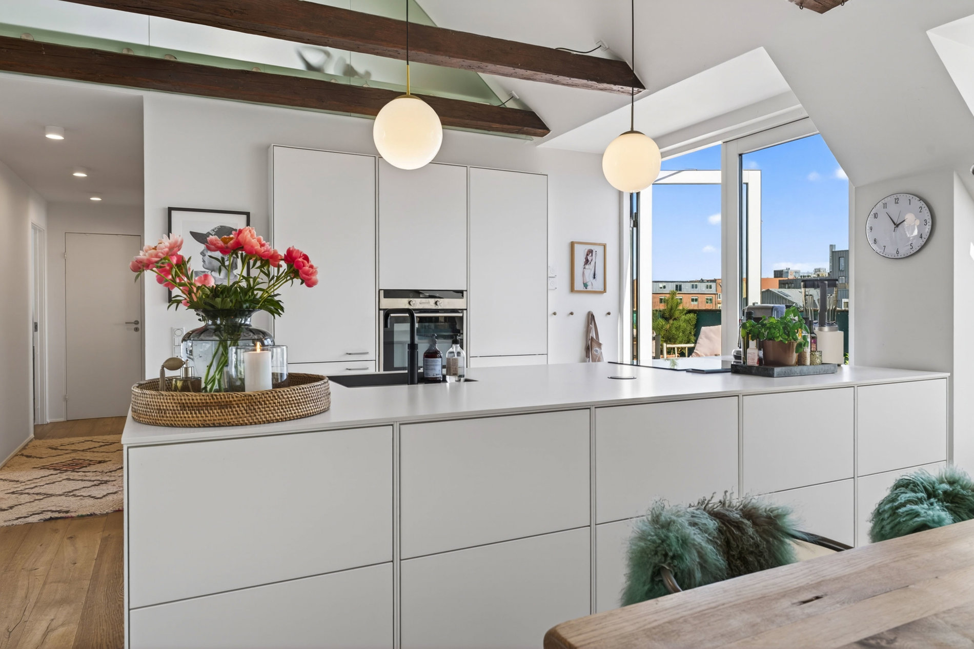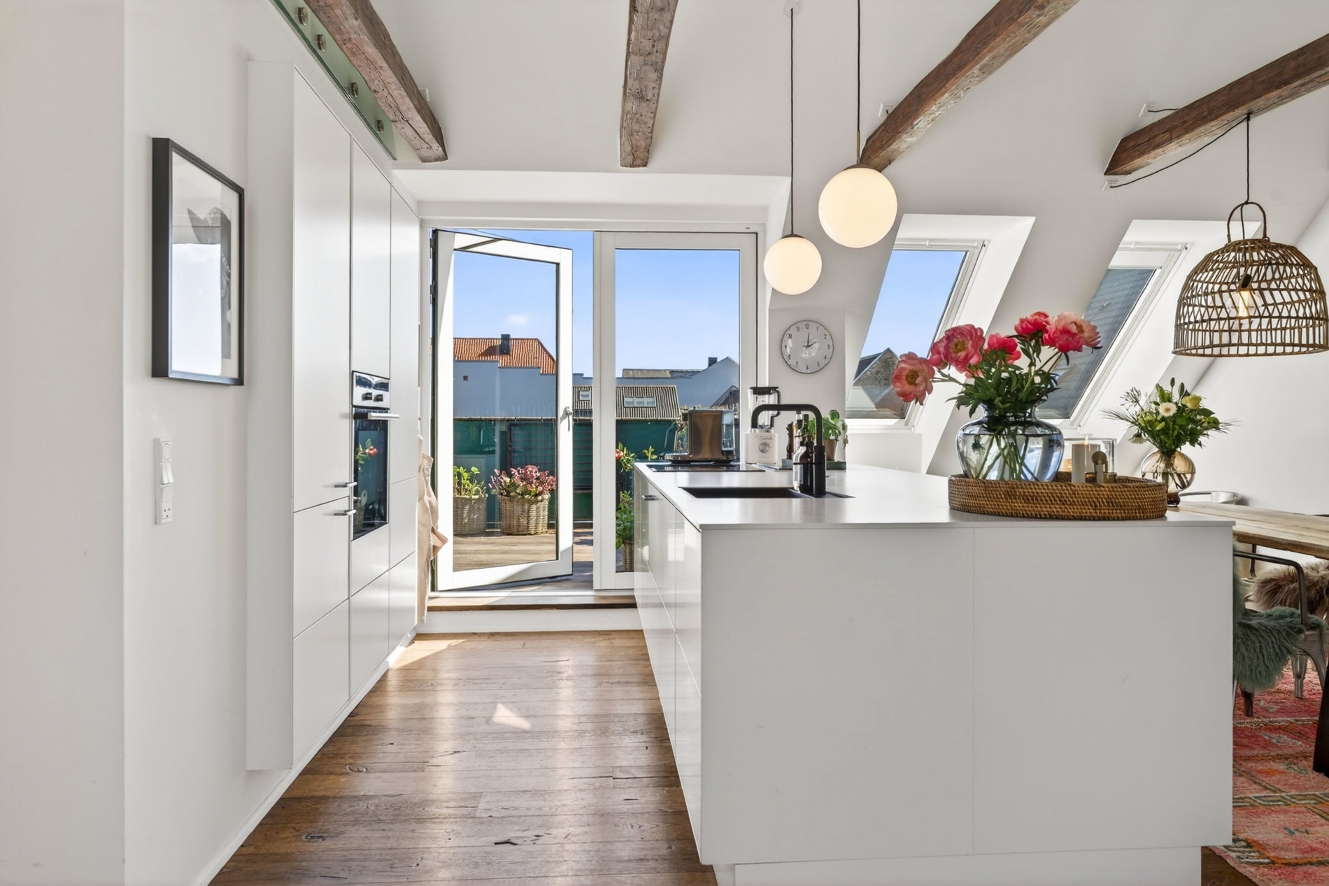 Boligen er indrettet med fokus på moderne komfort og funktionalitet. Gulvvarme sikrer en behagelig temperatur året rundt, mens planløsningen skaber et naturligt forløb mellem opholdsrum og køkkenalrum. Fra alrummet er der direkte udgang til tagterrassen, hvilket gør udelivet til en integreret del af boligen. Her flyder inde og ude sammen på smukkeste vis og skaber ideelle rammer for både hverdagsliv og gæstfri aftener.