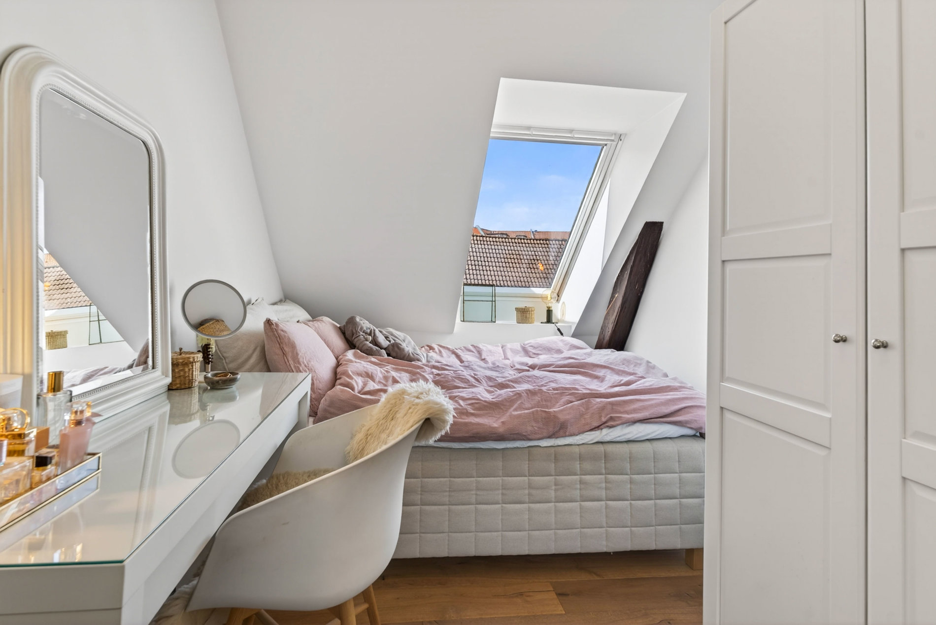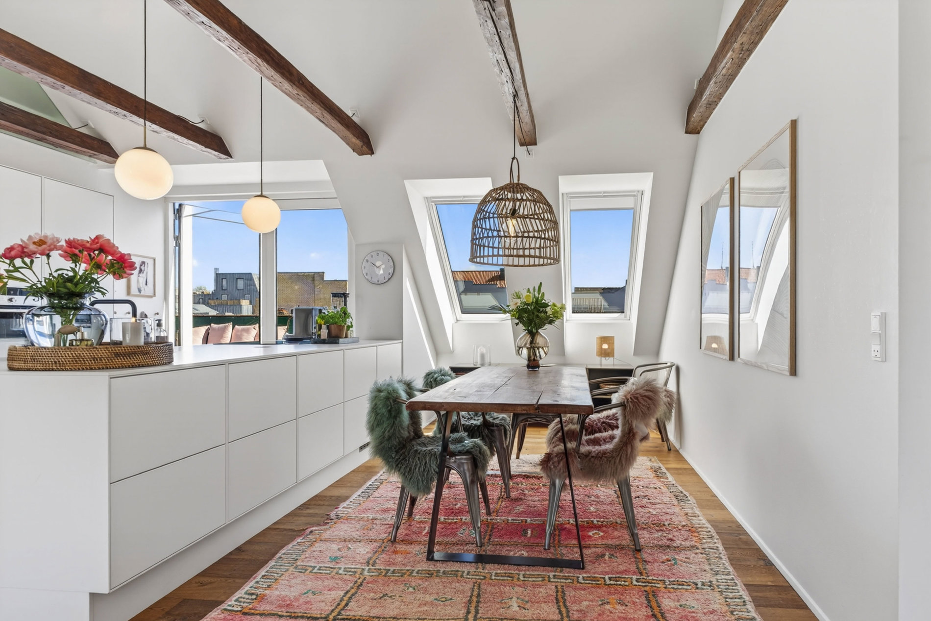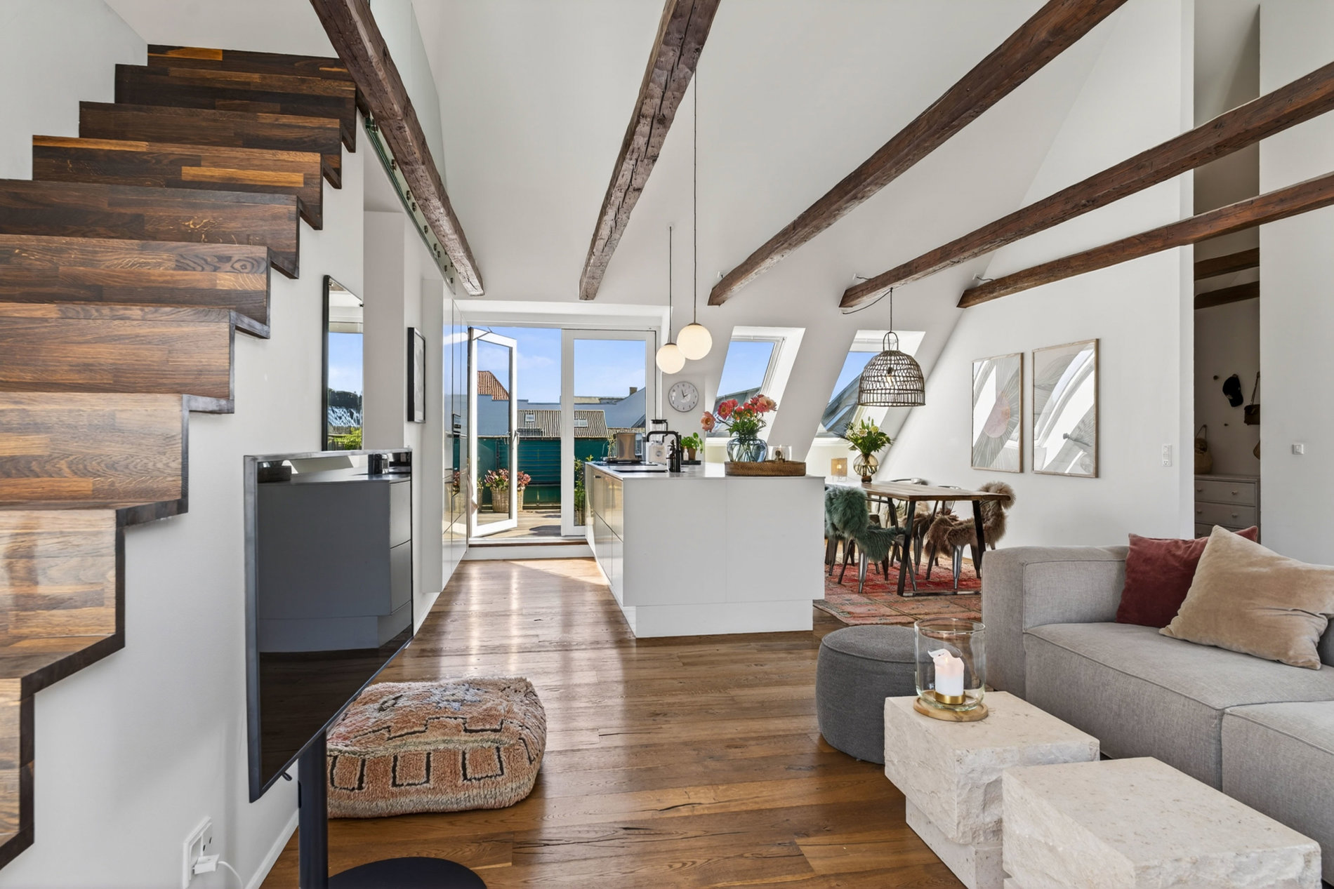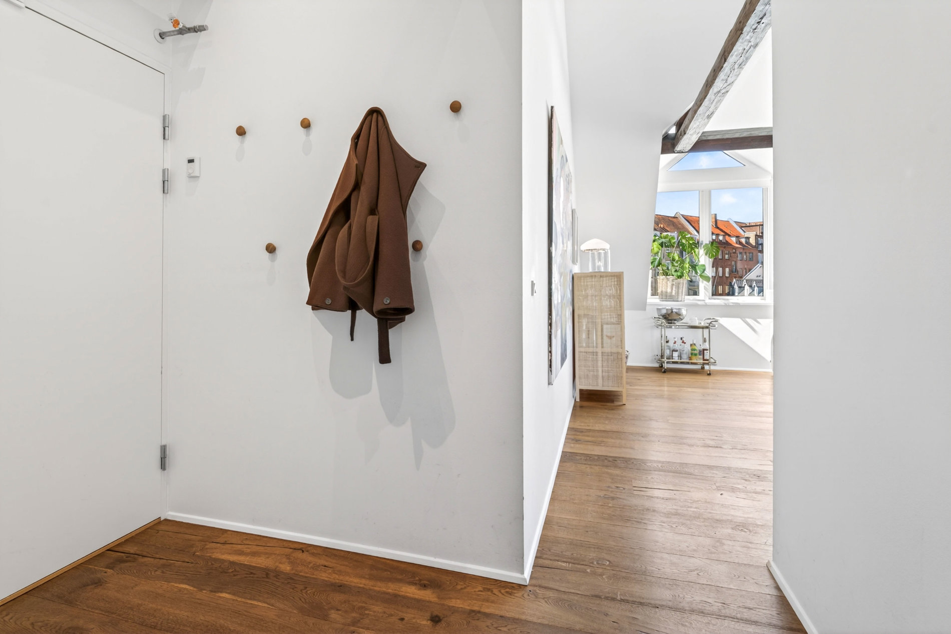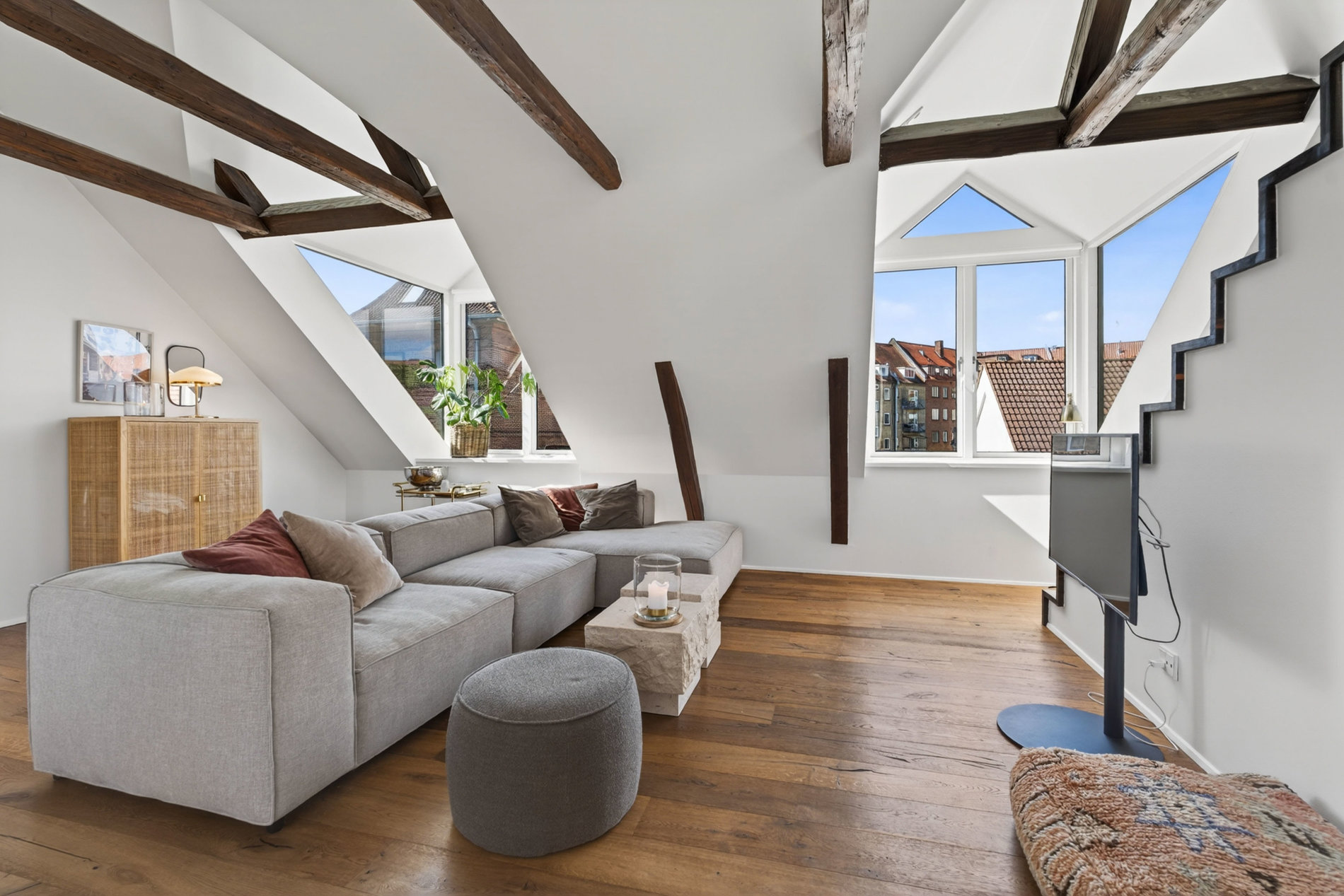 Lejligheden er placeret på toppen af ejendommen og tilbyder en sjælden penthousefornemmelse midt i Aalborg. Lofterne går helt til kip og skaber en fantastisk rumhøjde, hvor lyset strømmer ind gennem de store kviste, der nærmest opleves som elegante glaskarnapper med panoramaudsigt over byen. Her er et imponerende lysindfald dagen igennem og en stemning, der skifter med himlen, årstiderne og byens liv set fra første parket, men i rolige og private rammer.