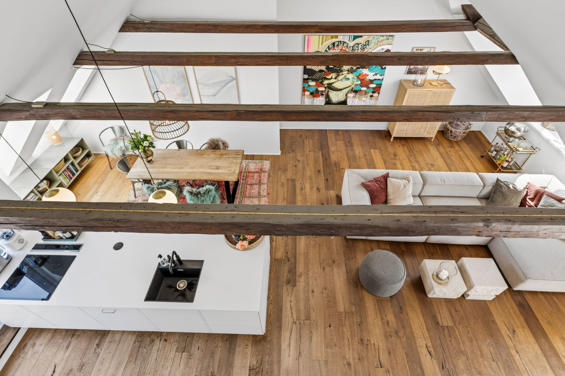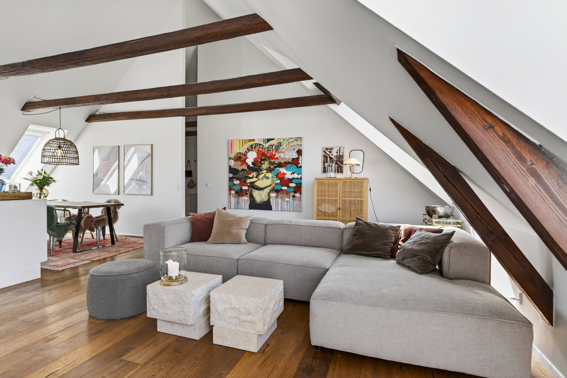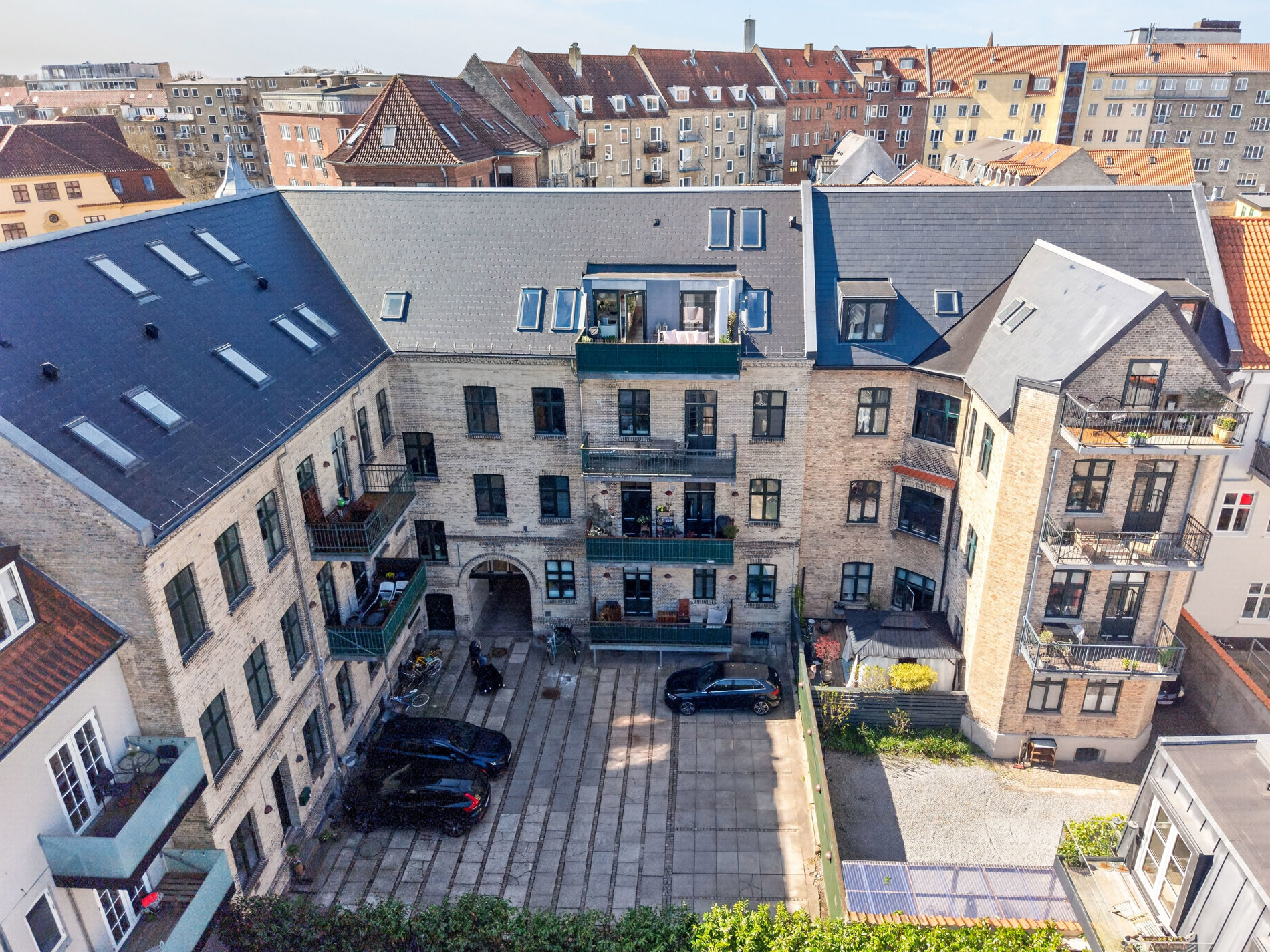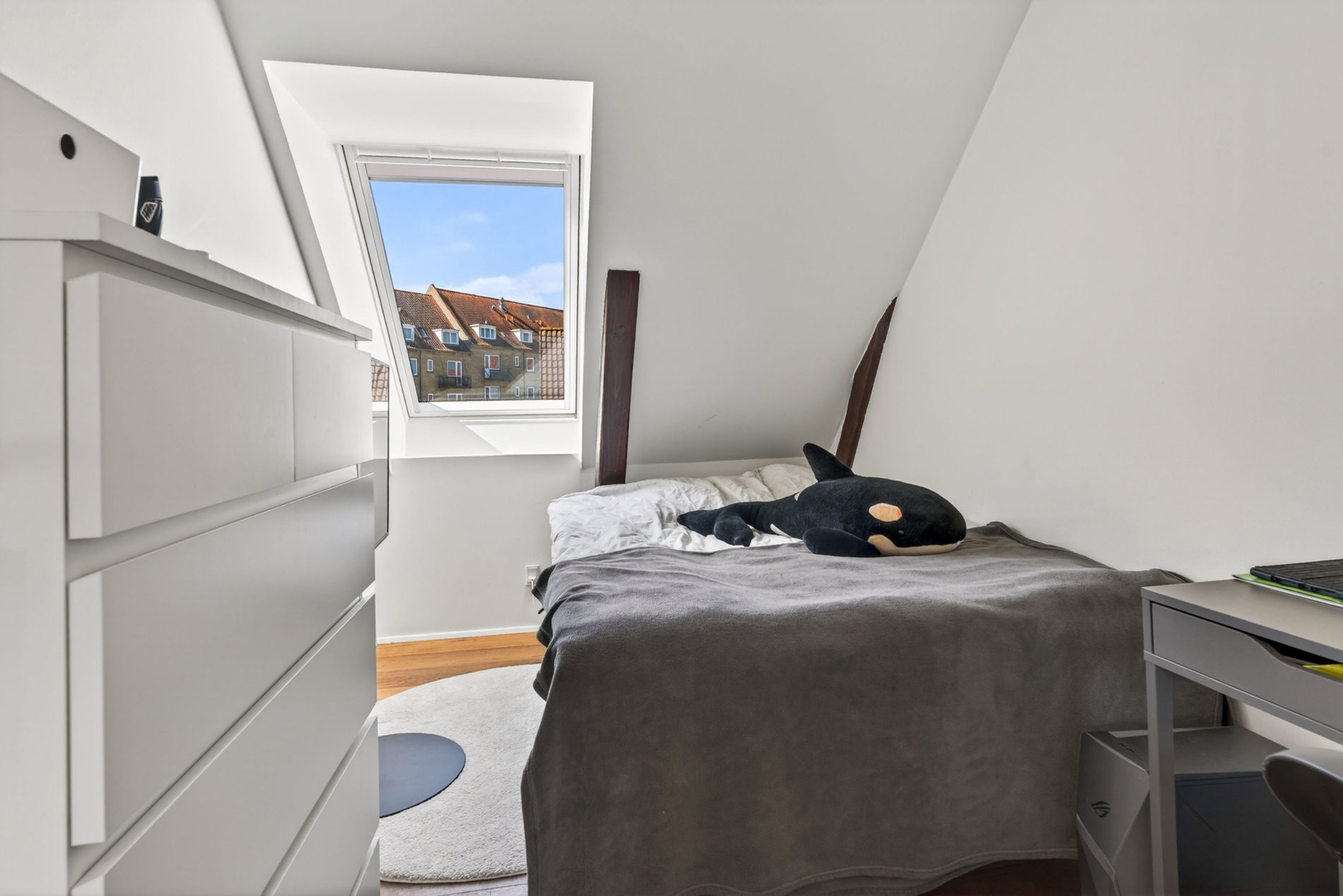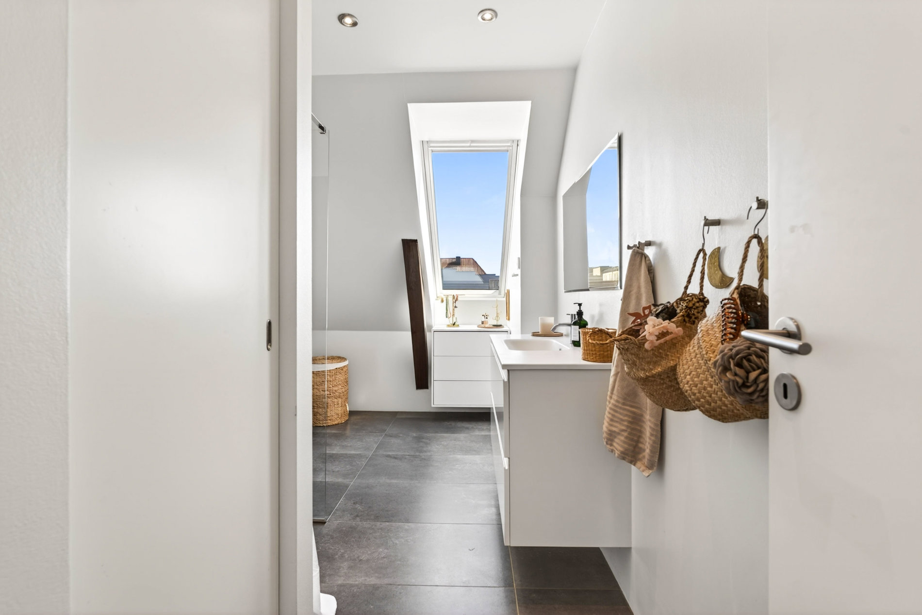 Lejligheden er placeret på toppen af ejendommen og tilbyder en sjælden penthousefornemmelse midt i Aalborg. Lofterne går helt til kip og skaber en fantastisk rumhøjde, hvor lyset strømmer ind gennem de store kviste, der nærmest opleves som elegante glaskarnapper med panoramaudsigt over byen. Her er et imponerende lysindfald dagen igennem og en stemning, der skifter med himlen, årstiderne og byens liv set fra første parket, men i rolige og private rammer.