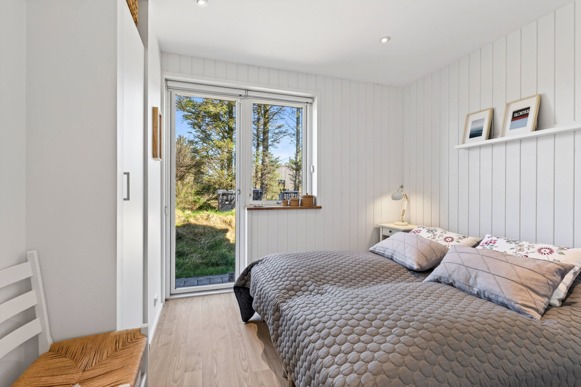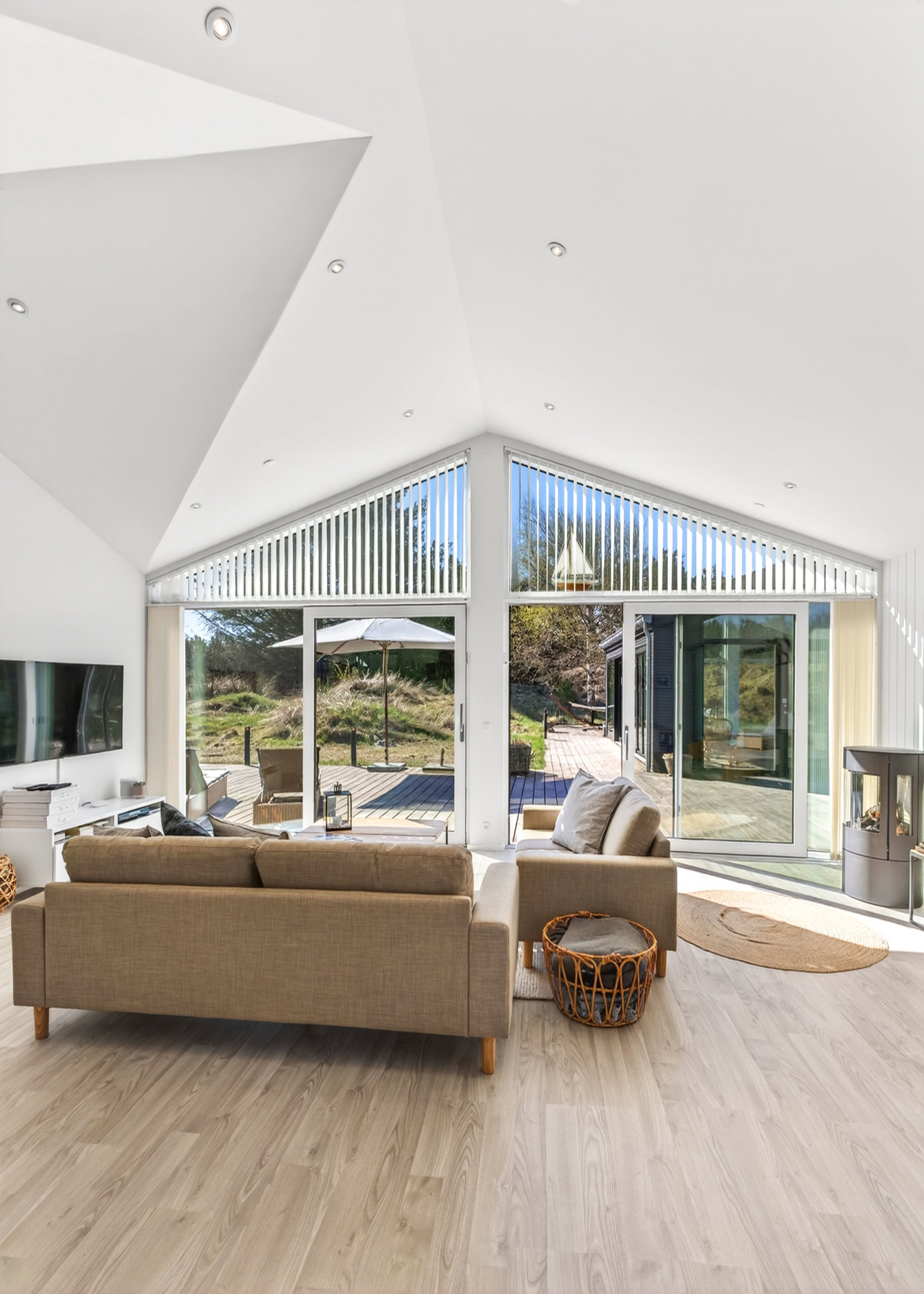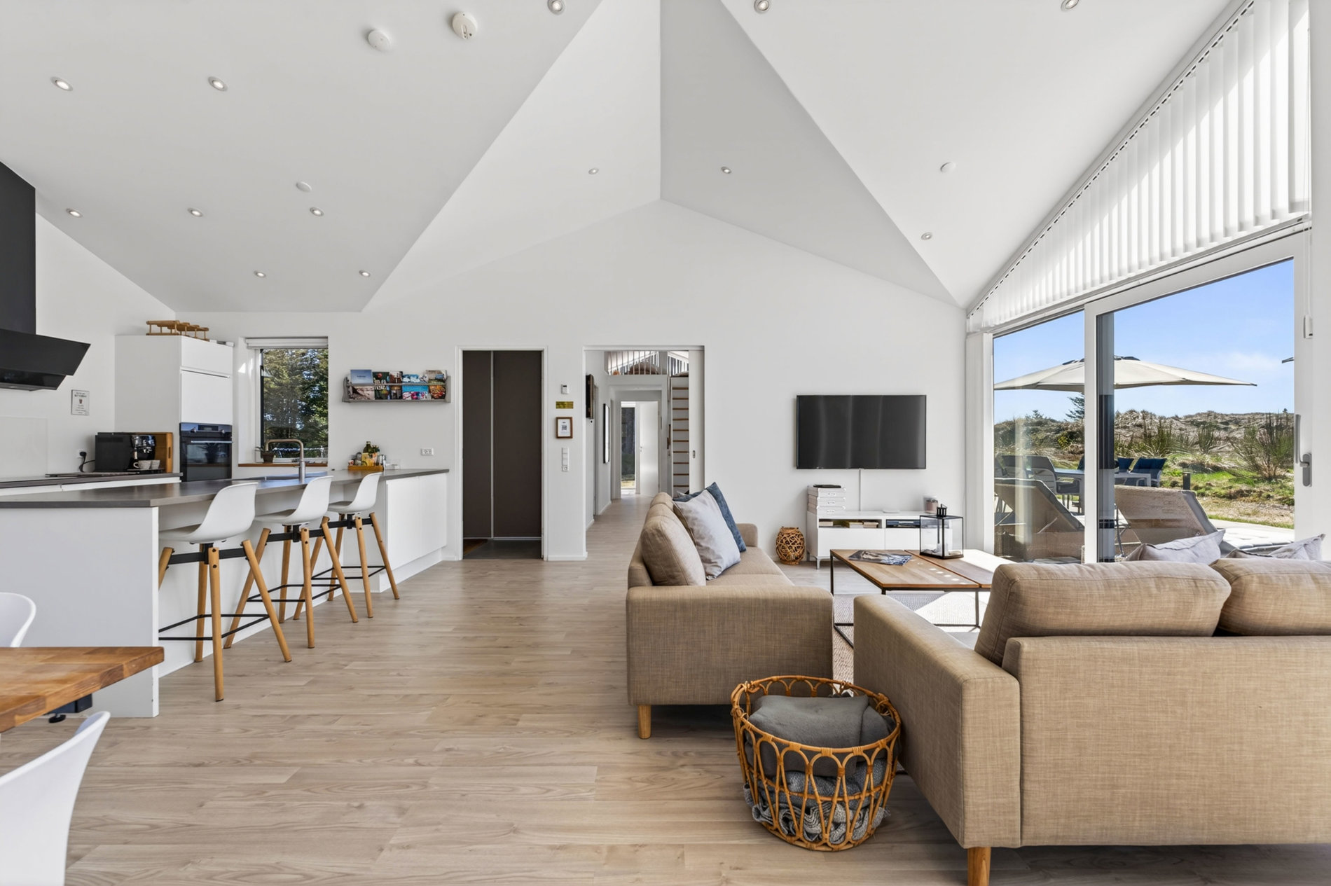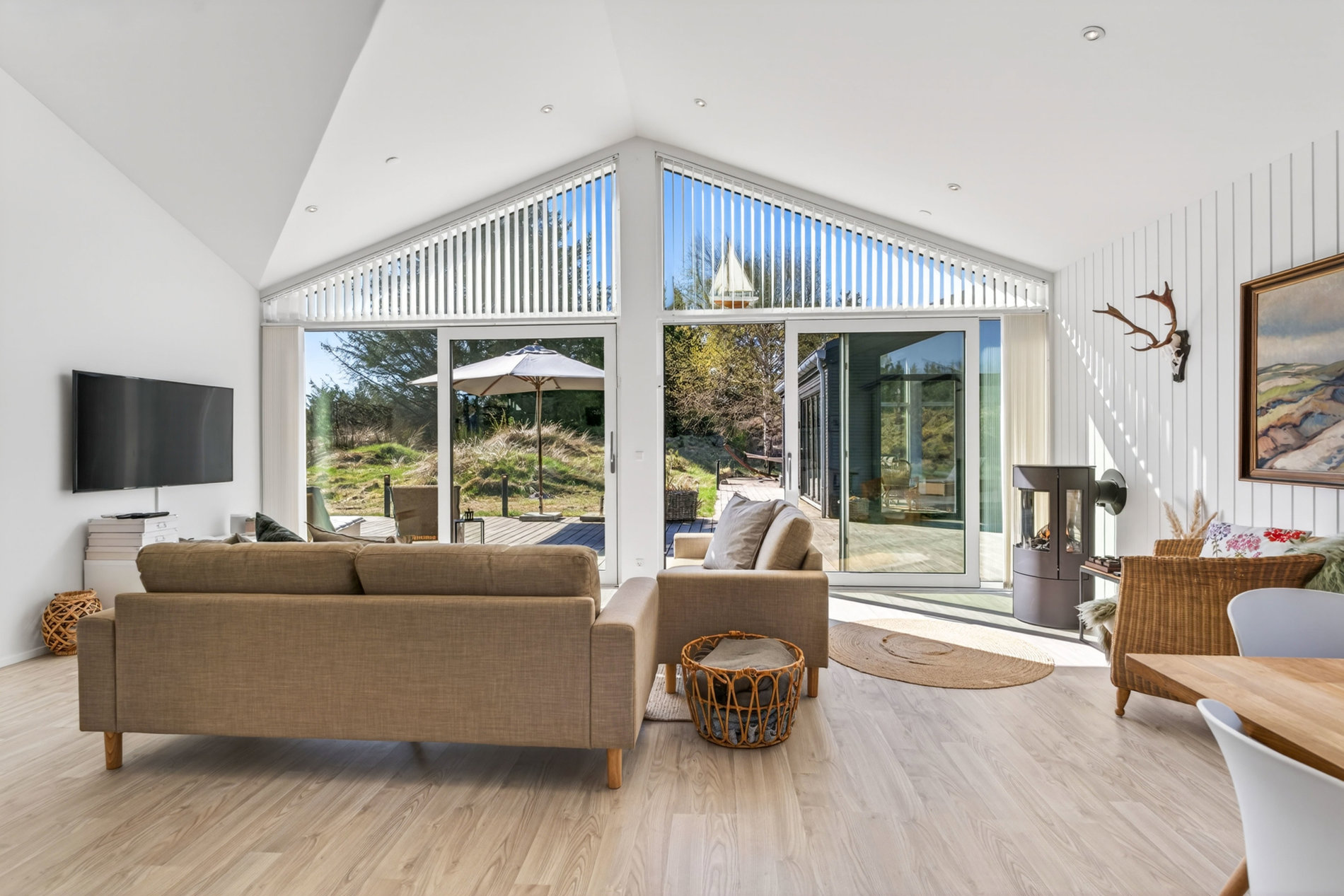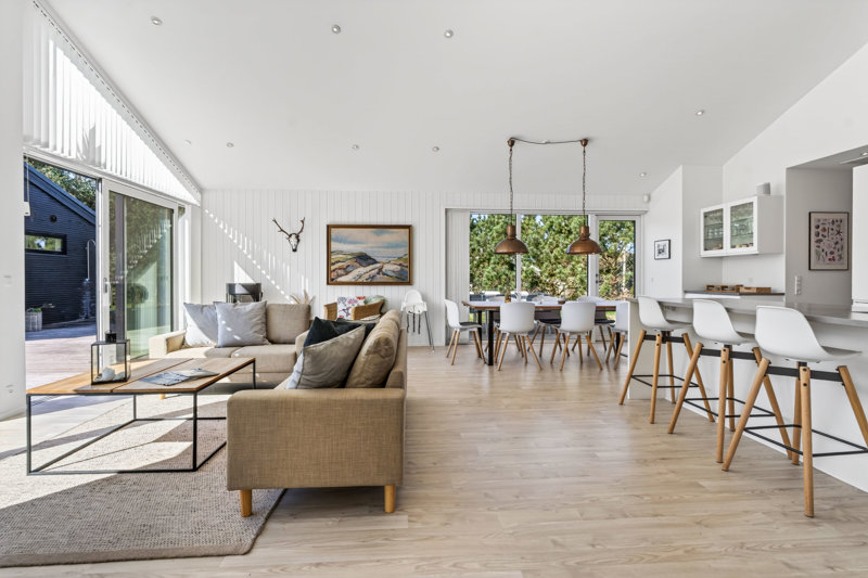 Stuen er indrettet med fokus på hygge og afslapning. Brændeovnen skaber varme og stemning på kølige aftener, mens blikket trækkes mod landskabet udenfor. Materialevalget er stilrent og moderne, og indretningen balancerer komfort og æstetik på fornem vis. Køkkenet er fuldt udstyret med kvalitets-hvidevarer. Her er plads til både den hurtige feriemorgen og de lange middage, der trækker ud i de lyse sommeraftener.