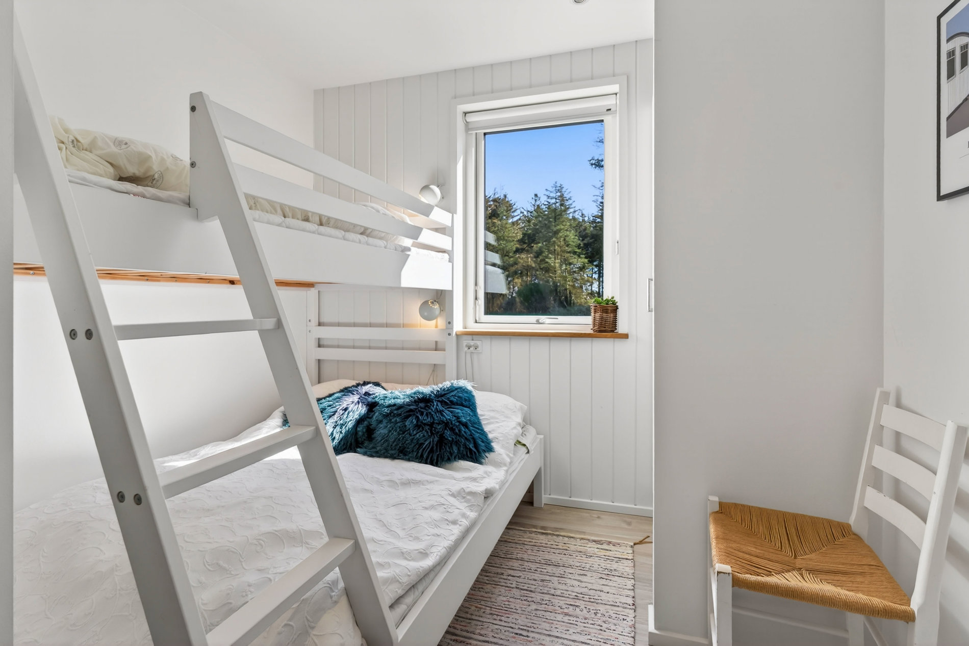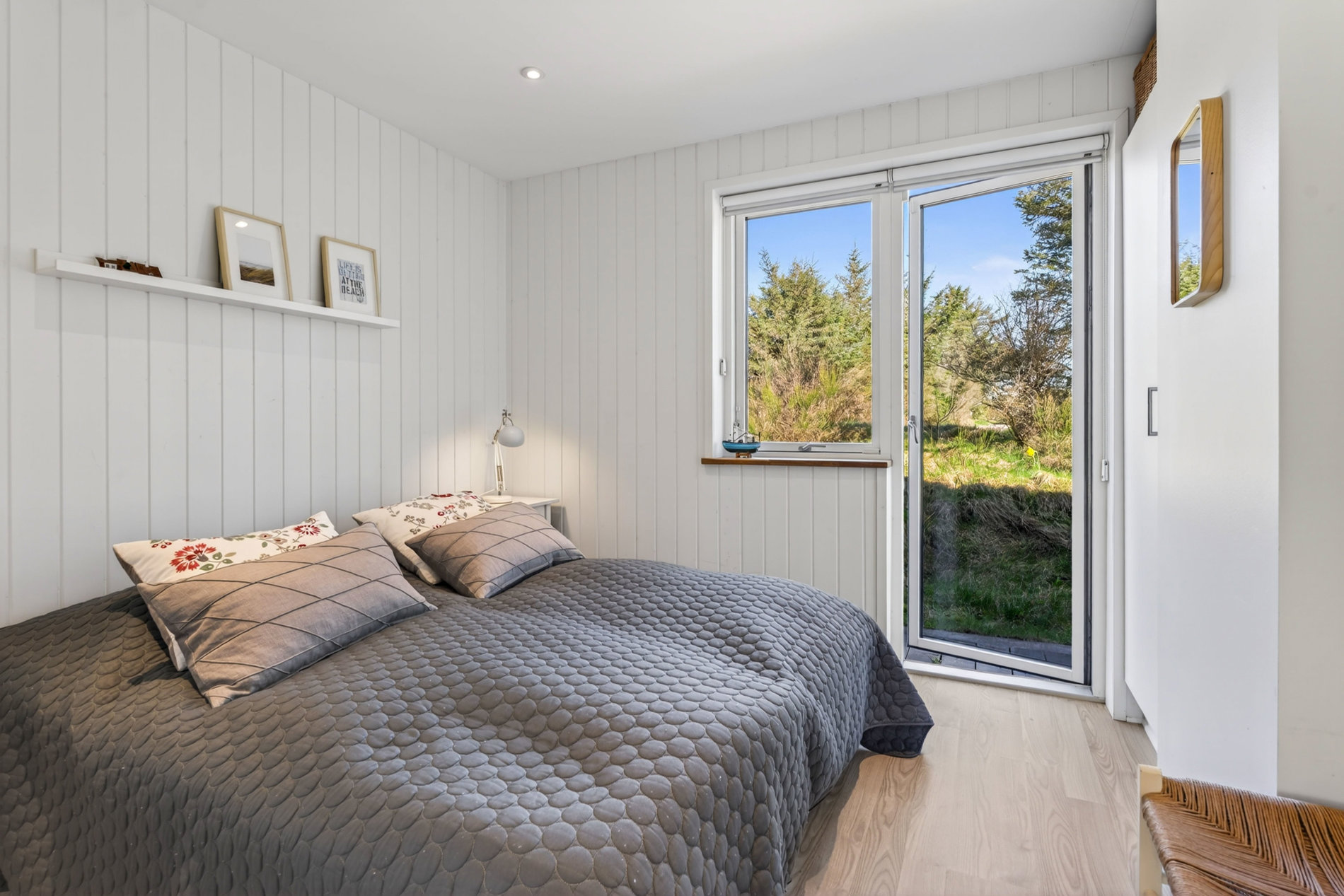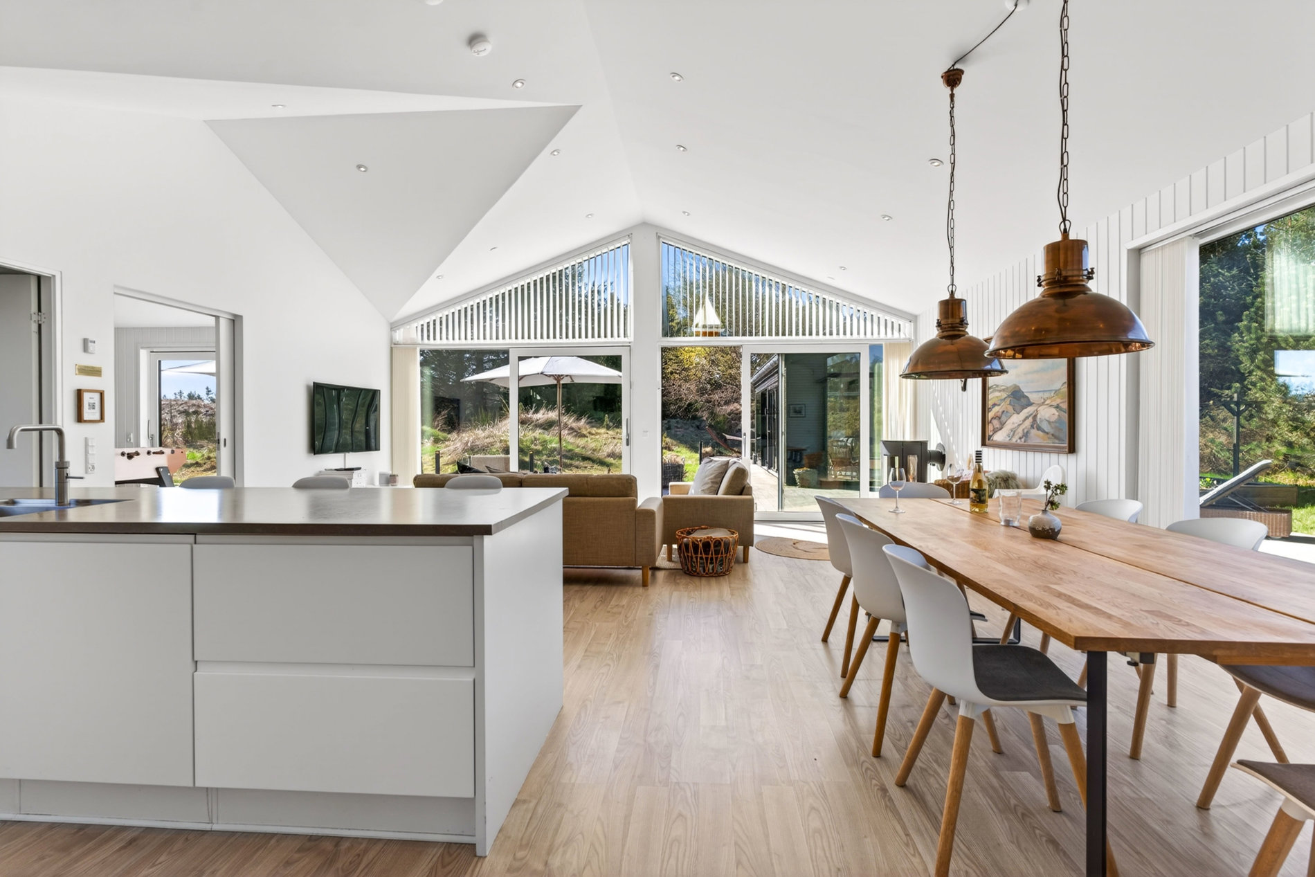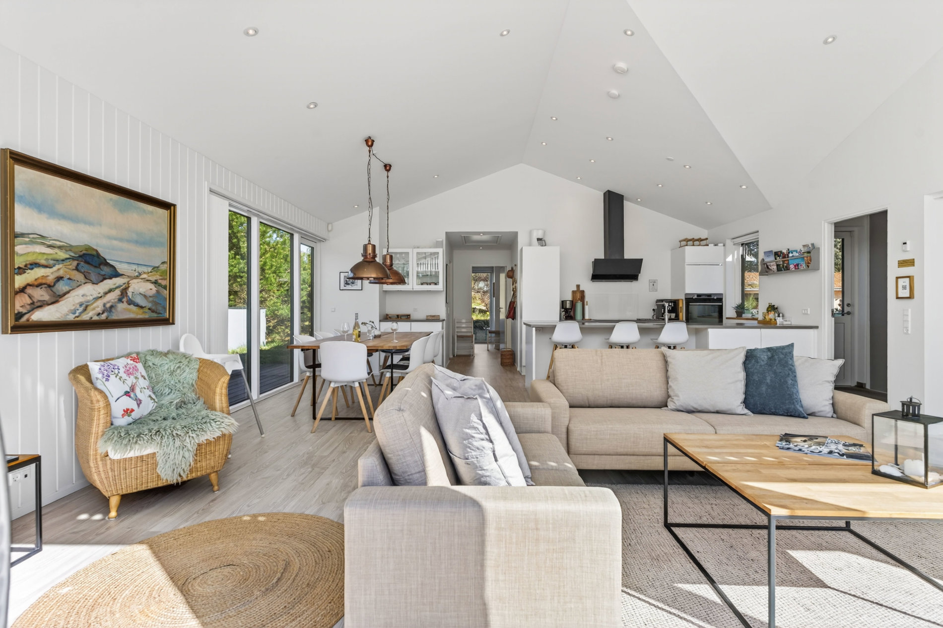 Stuen er indrettet med fokus på hygge og afslapning. Brændeovnen skaber varme og stemning på kølige aftener, mens blikket trækkes mod landskabet udenfor. Materialevalget er stilrent og moderne, og indretningen balancerer komfort og æstetik på fornem vis. Køkkenet er fuldt udstyret med kvalitets-hvidevarer. Her er plads til både den hurtige feriemorgen og de lange middage, der trækker ud i de lyse sommeraftener.