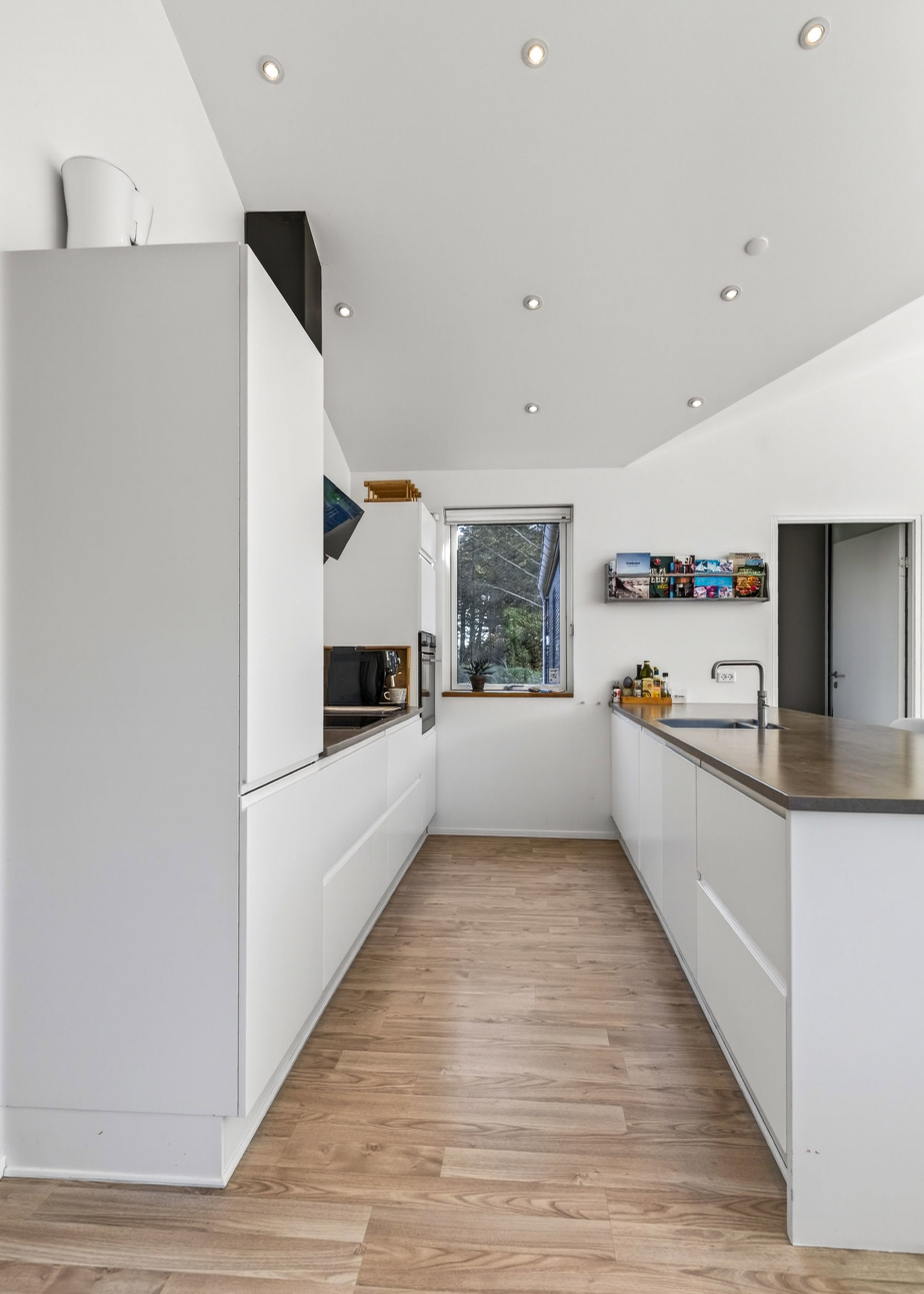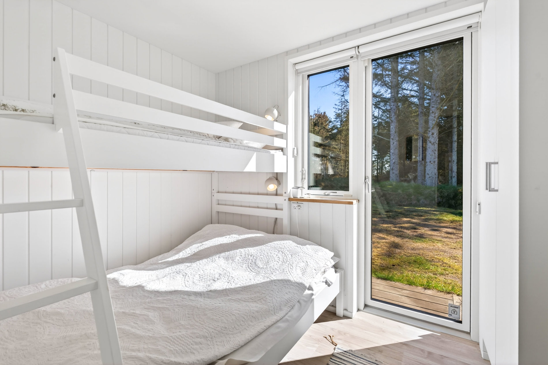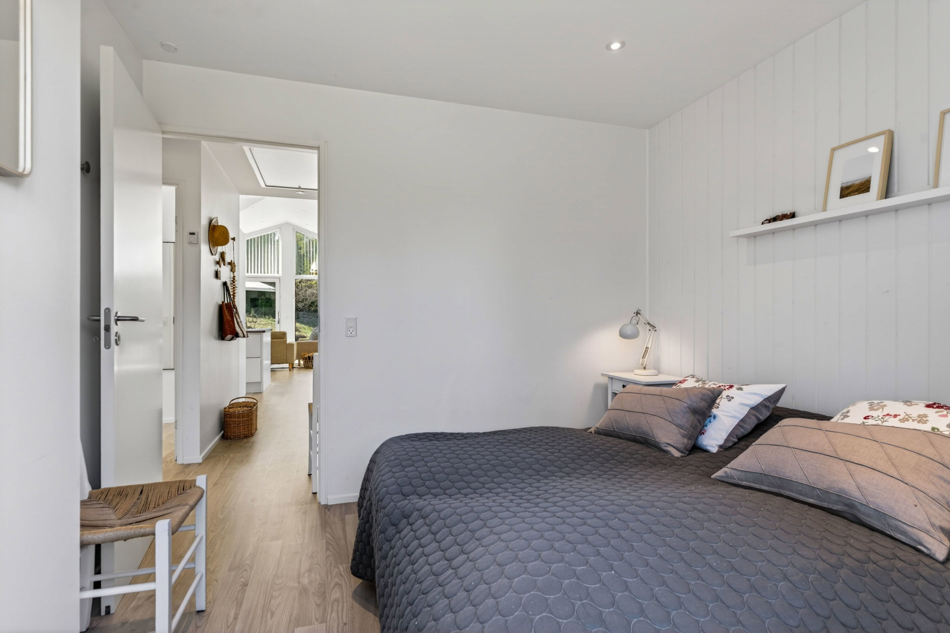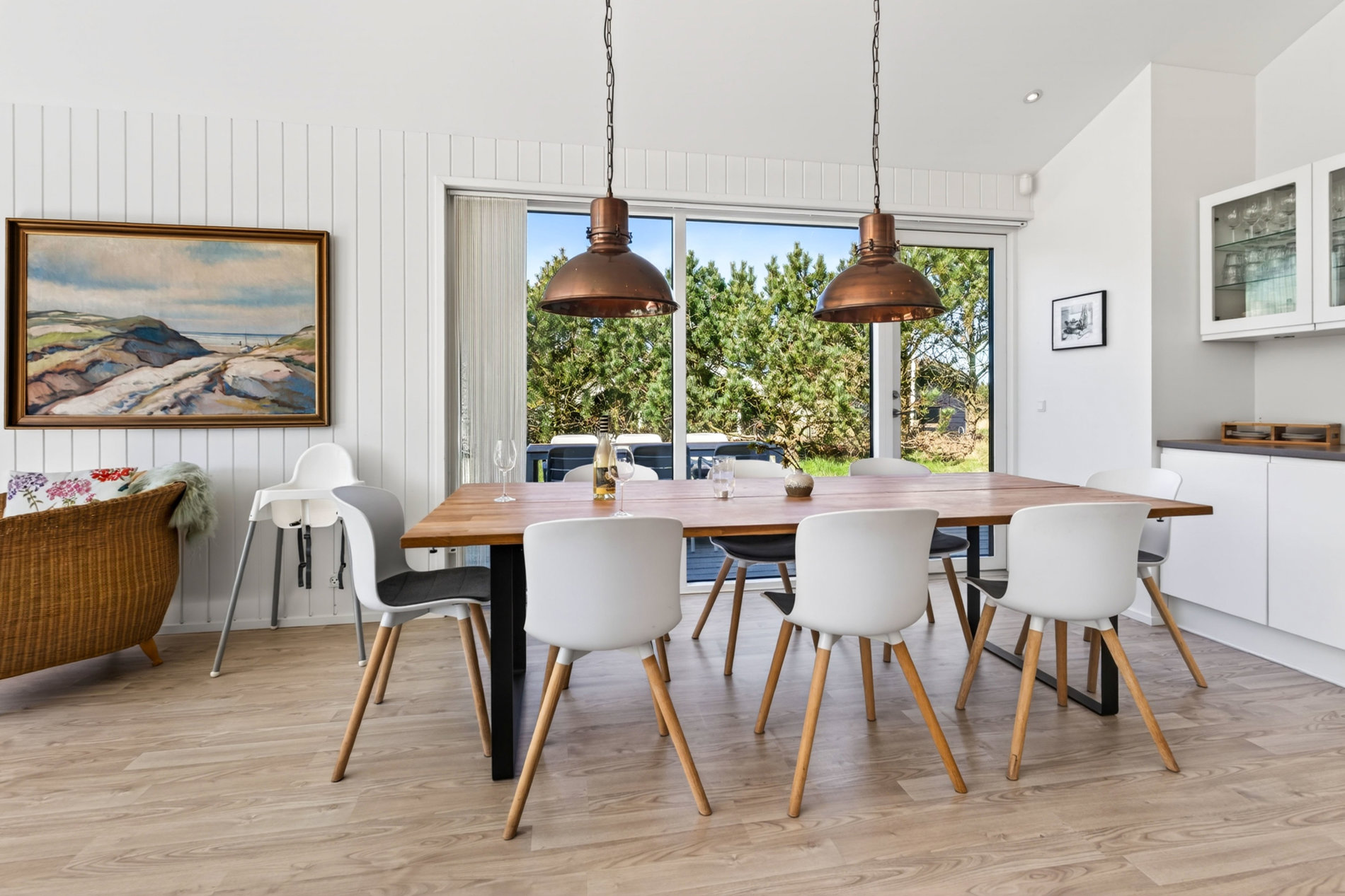 Stuen er indrettet med fokus på hygge og afslapning. Brændeovnen skaber varme og stemning på kølige aftener, mens blikket trækkes mod landskabet udenfor. Materialevalget er stilrent og moderne, og indretningen balancerer komfort og æstetik på fornem vis. Køkkenet er fuldt udstyret med kvalitets-hvidevarer. Her er plads til både den hurtige feriemorgen og de lange middage, der trækker ud i de lyse sommeraftener.