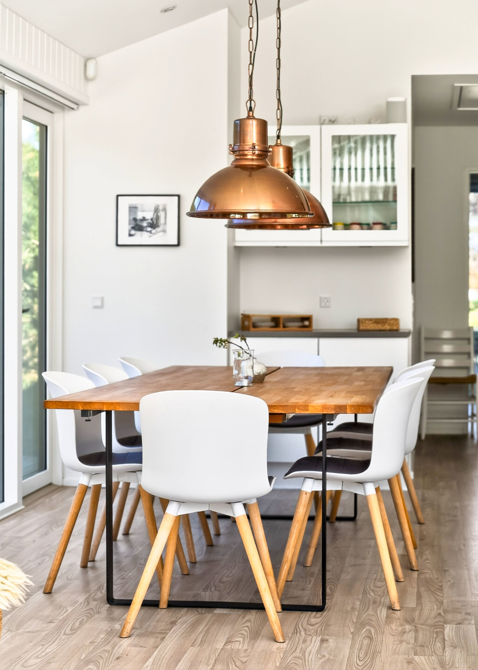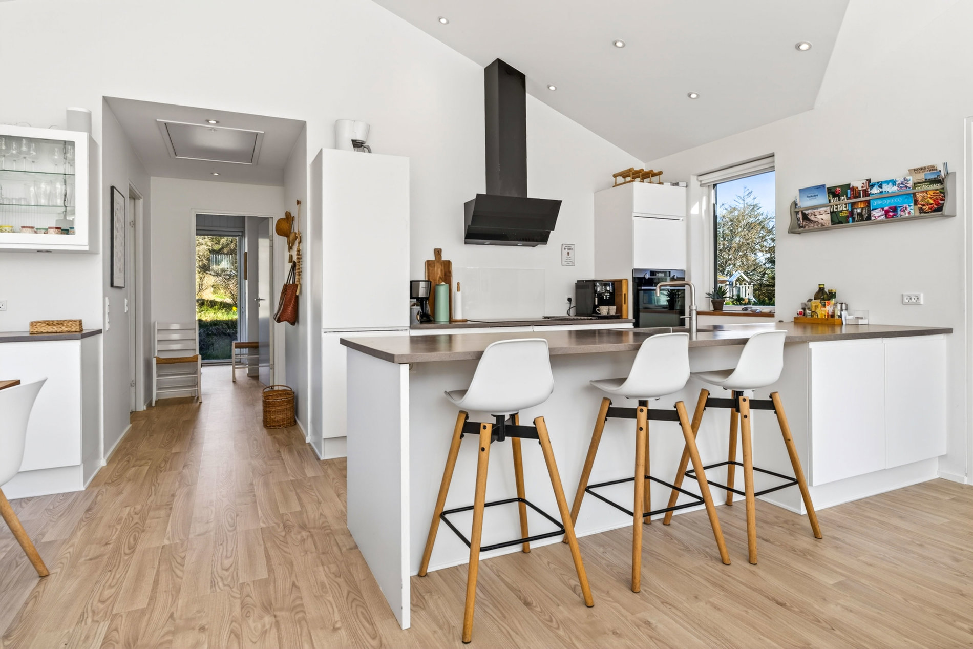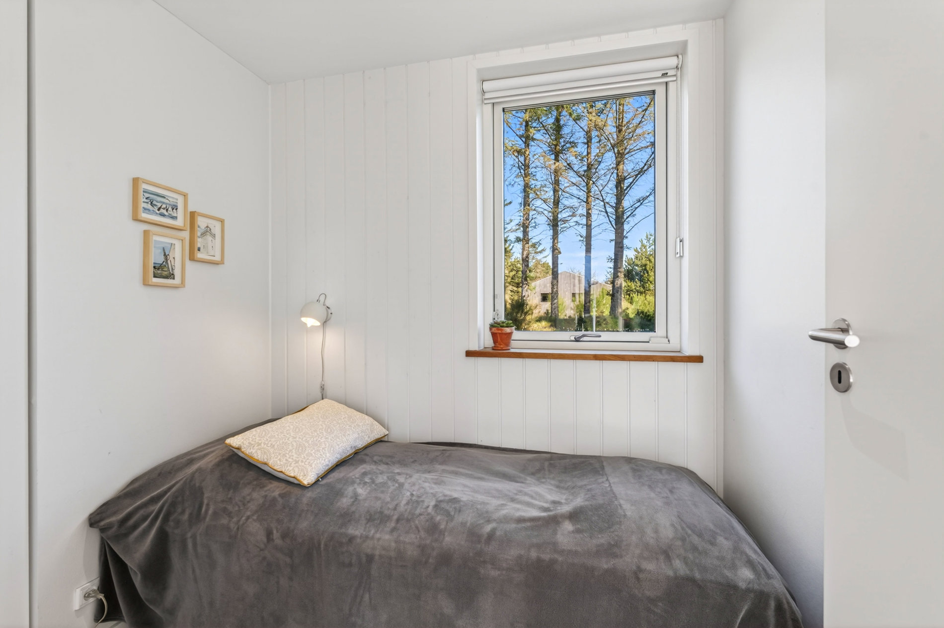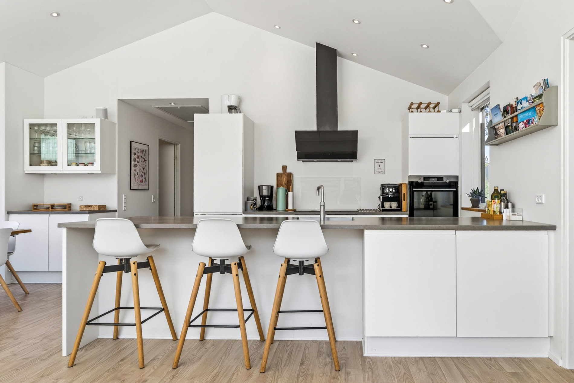 Stuen er indrettet med fokus på hygge og afslapning. Brændeovnen skaber varme og stemning på kølige aftener, mens blikket trækkes mod landskabet udenfor. Materialevalget er stilrent og moderne, og indretningen balancerer komfort og æstetik på fornem vis. Køkkenet er fuldt udstyret med kvalitets-hvidevarer. Her er plads til både den hurtige feriemorgen og de lange middage, der trækker ud i de lyse sommeraftener.