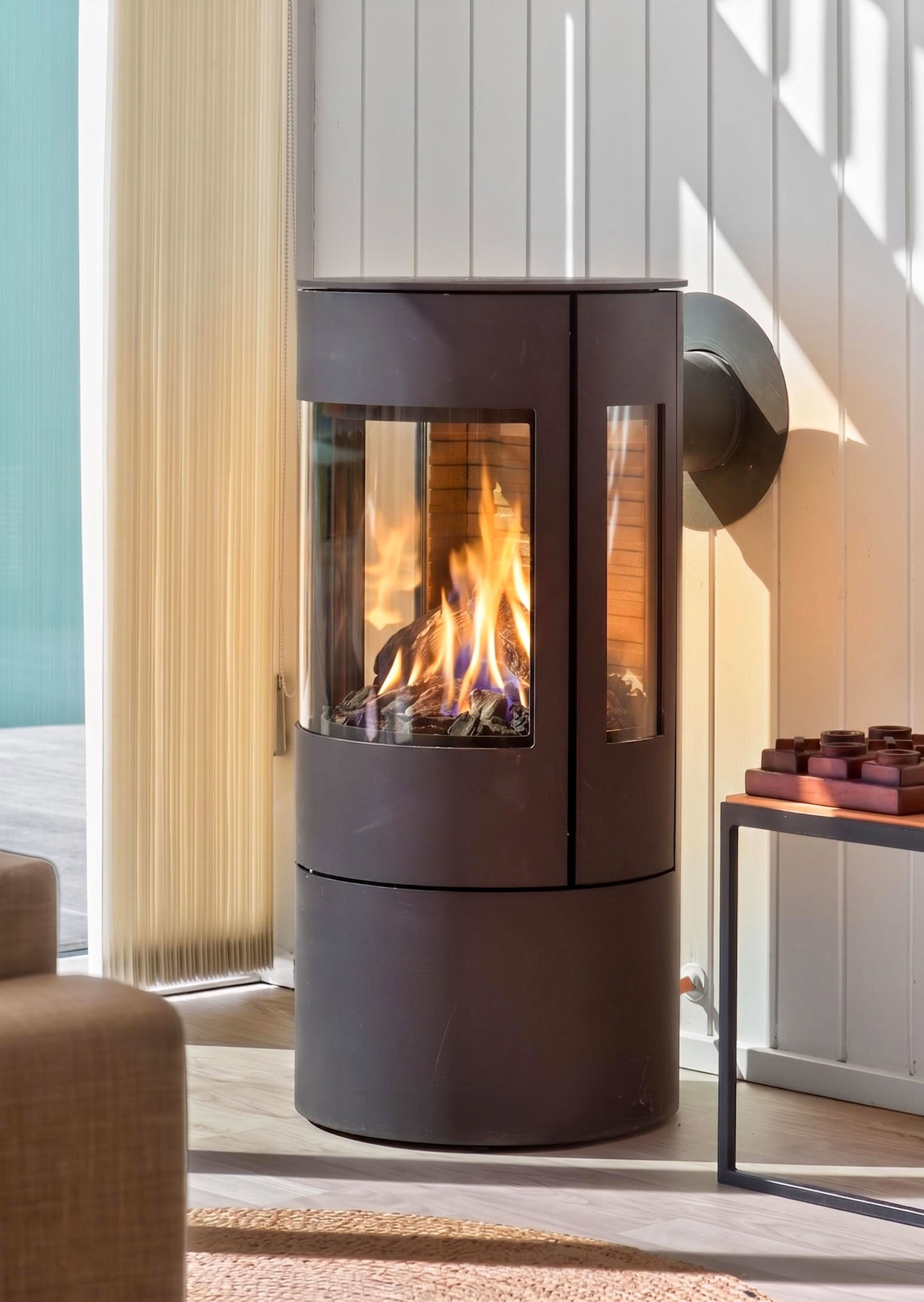 Opholdsrum med brændeovn og udsigt til det åbne landskab