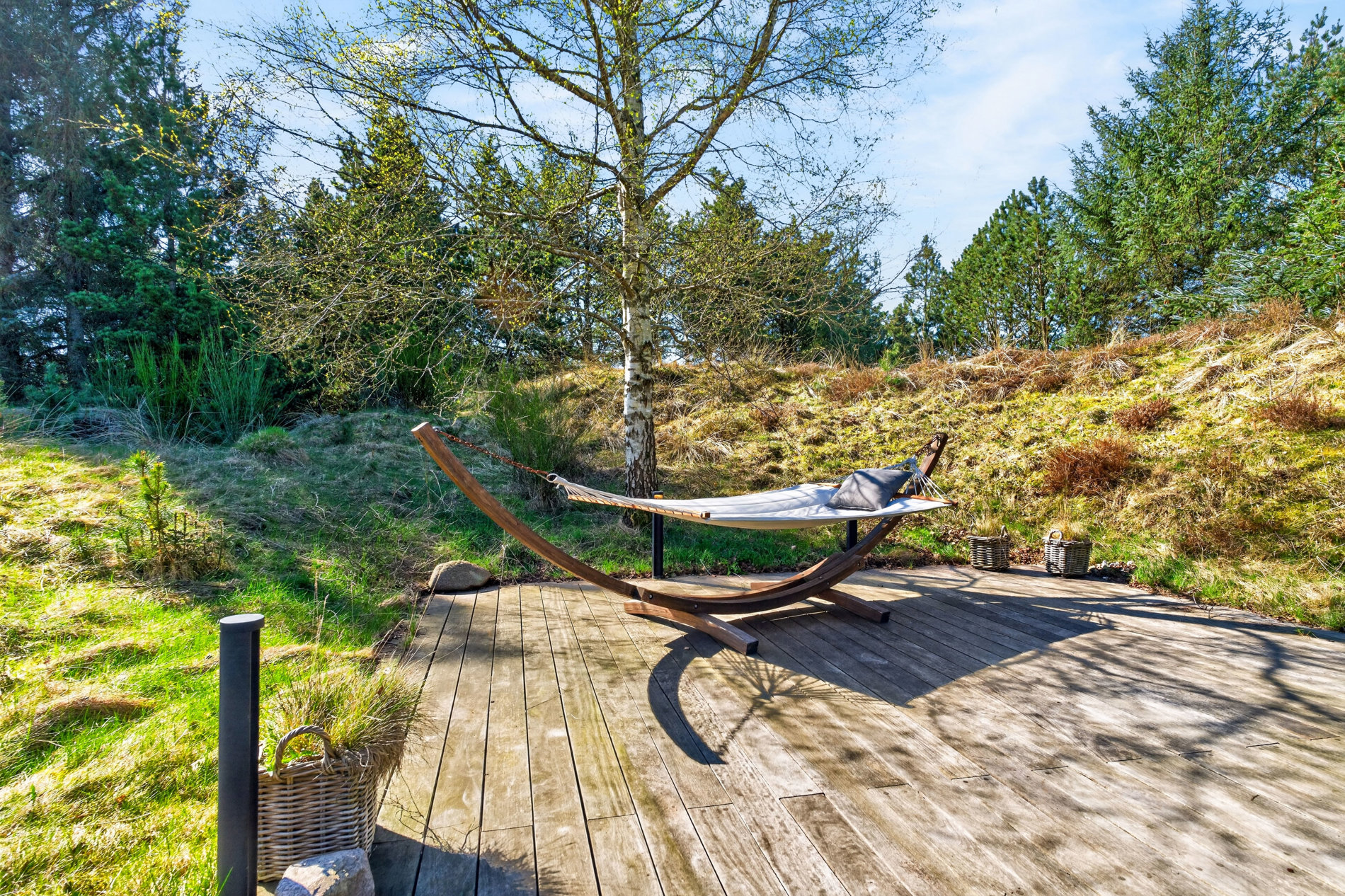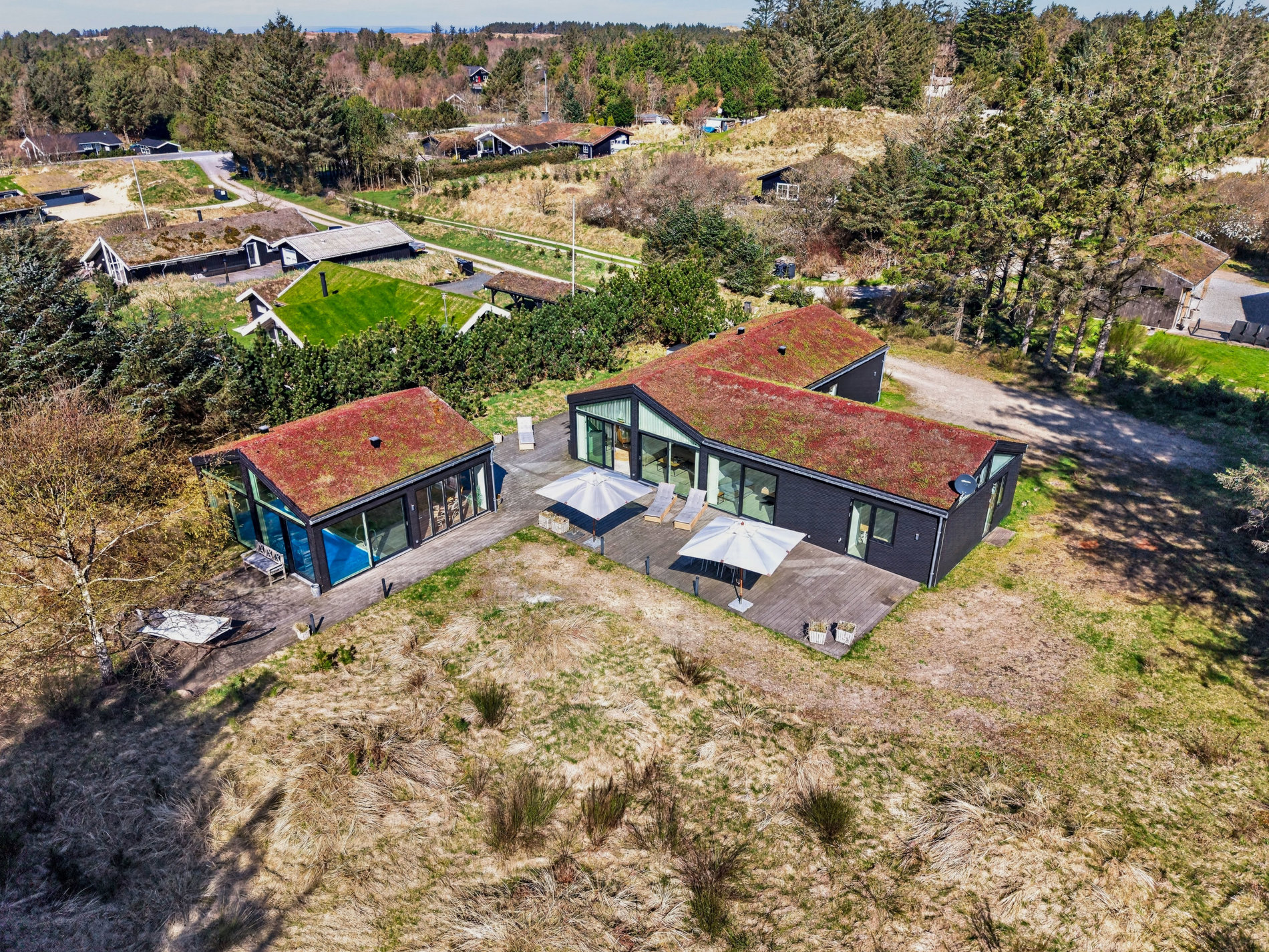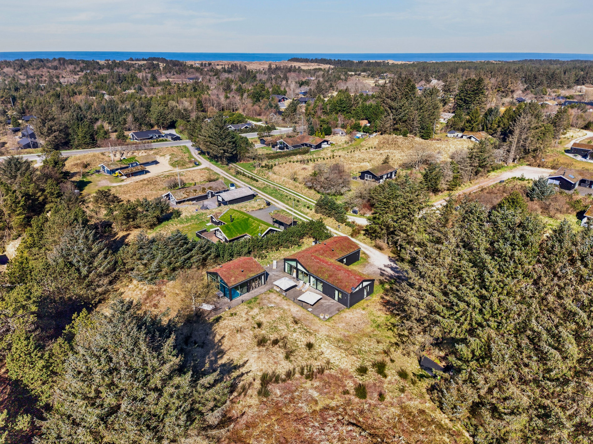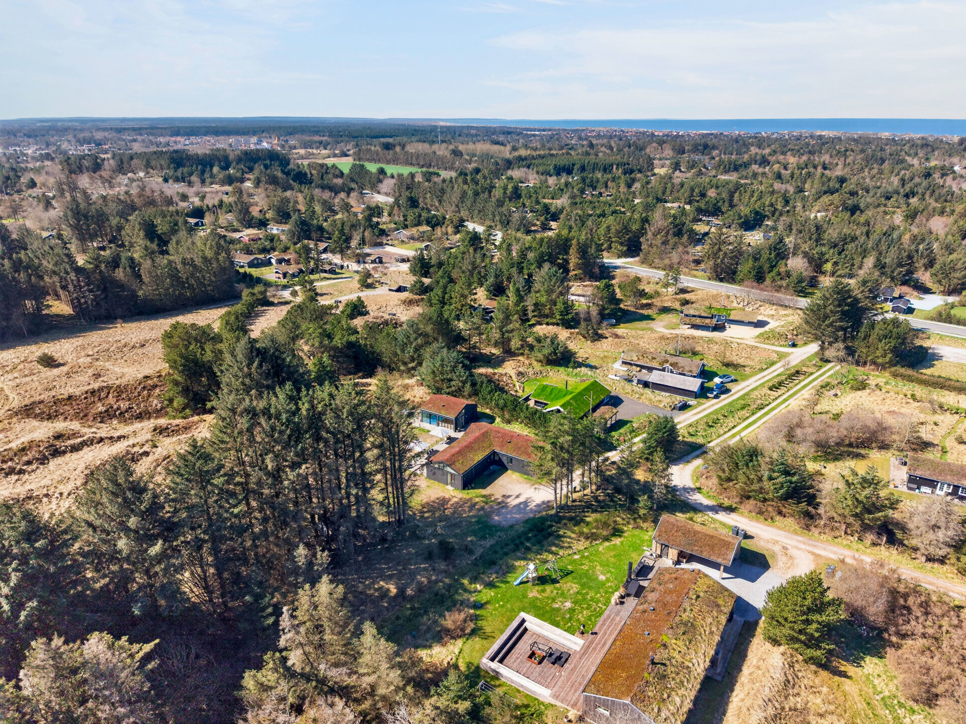 Grunden er en smuk naturgrund på 1.776 m², som giver både privatliv og udsigt over det åbne landskab – en sjælden kombination i Blokhus.