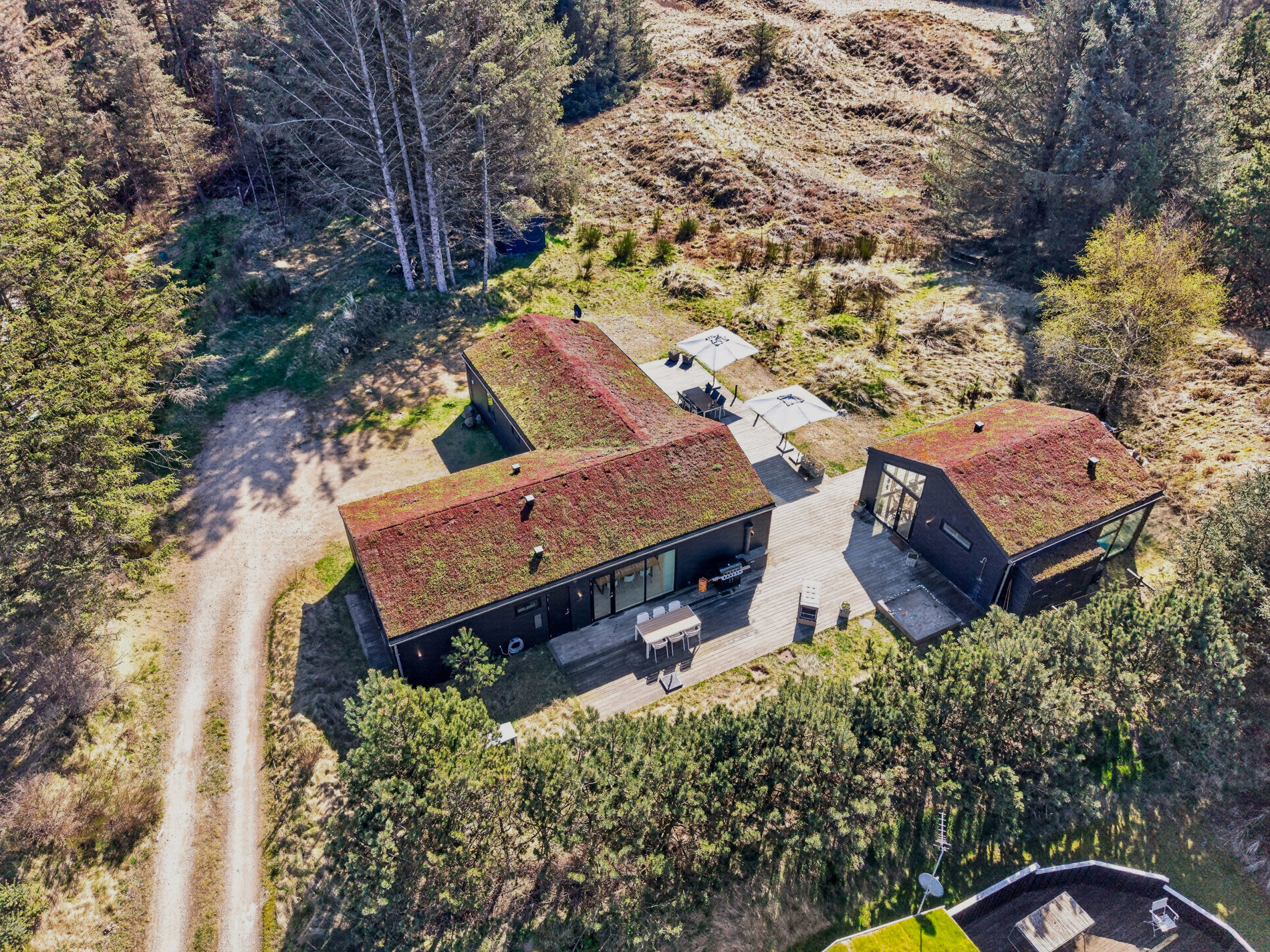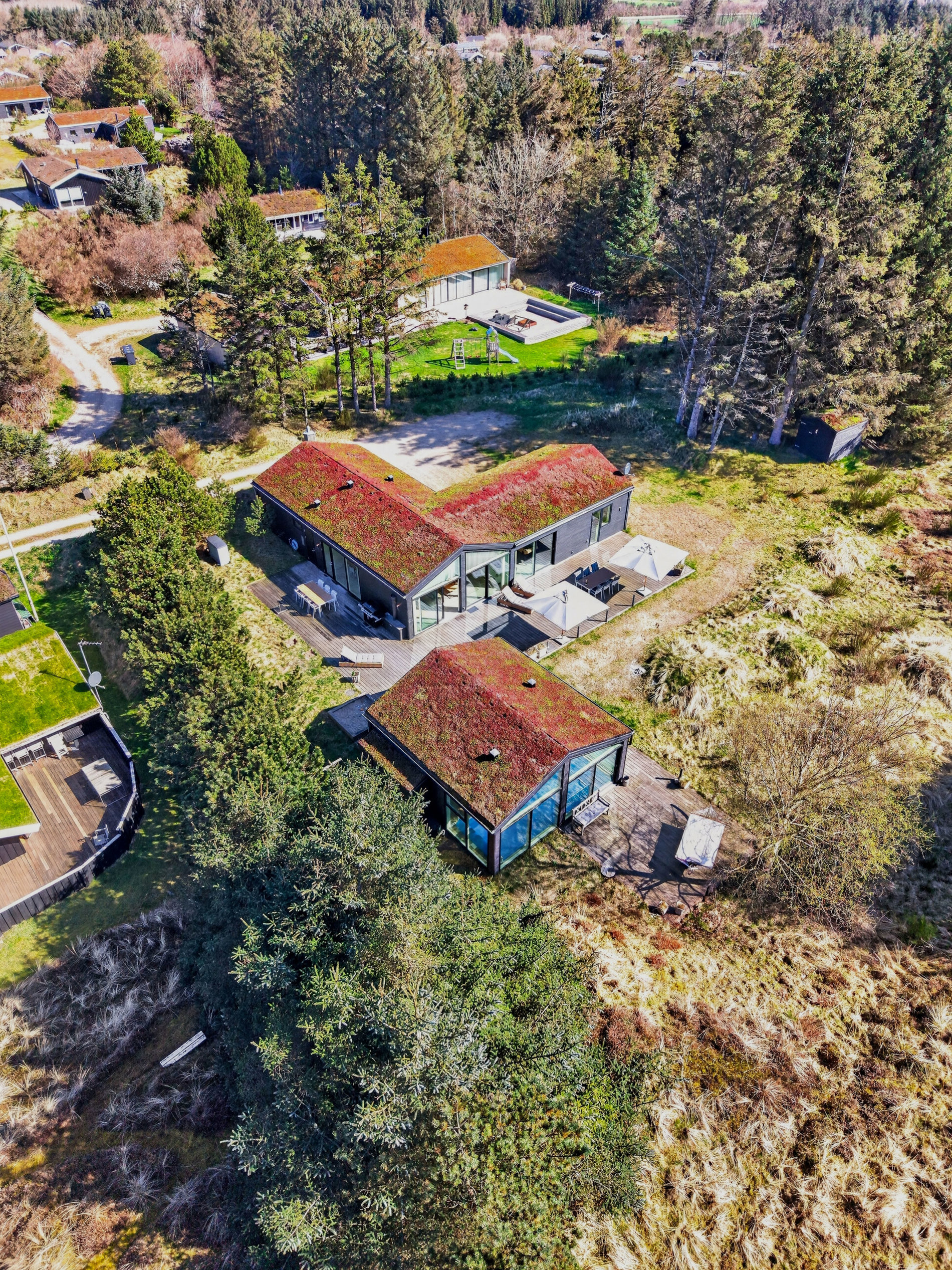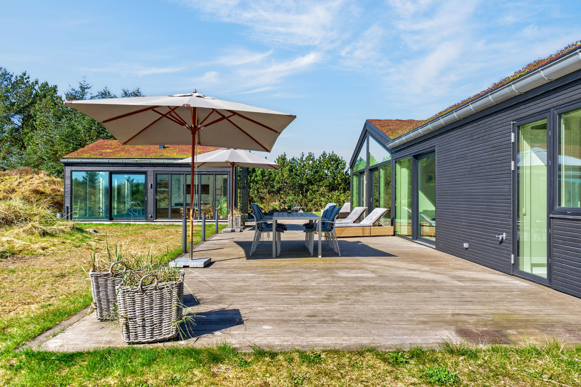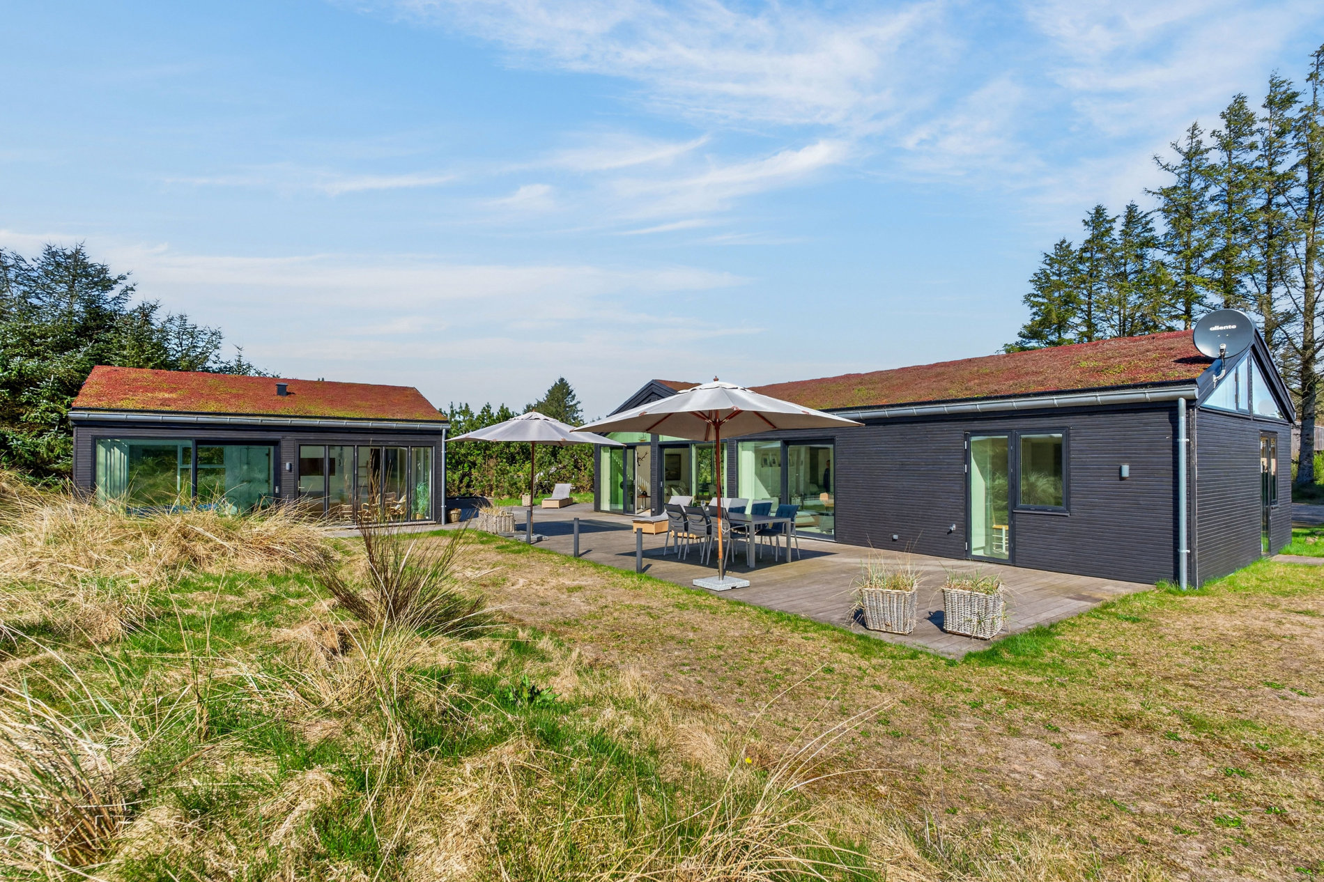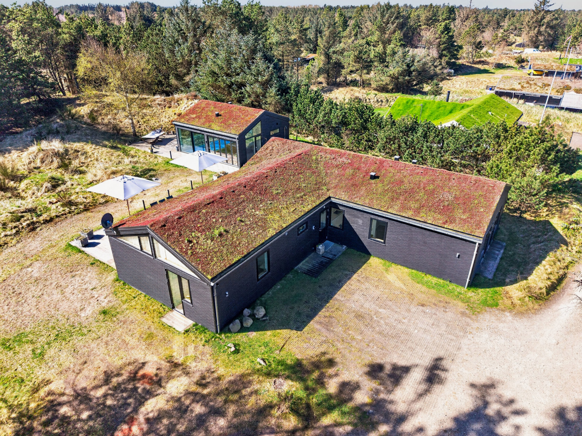 Grunden er en smuk naturgrund på 1.776 m², som giver både privatliv og udsigt over det åbne landskab – en sjælden kombination i Blokhus.
