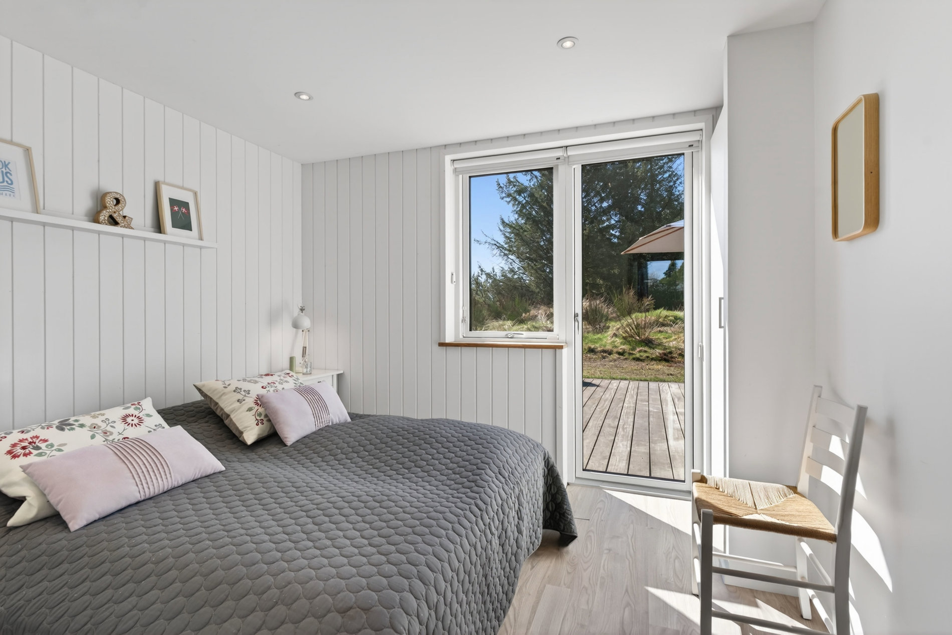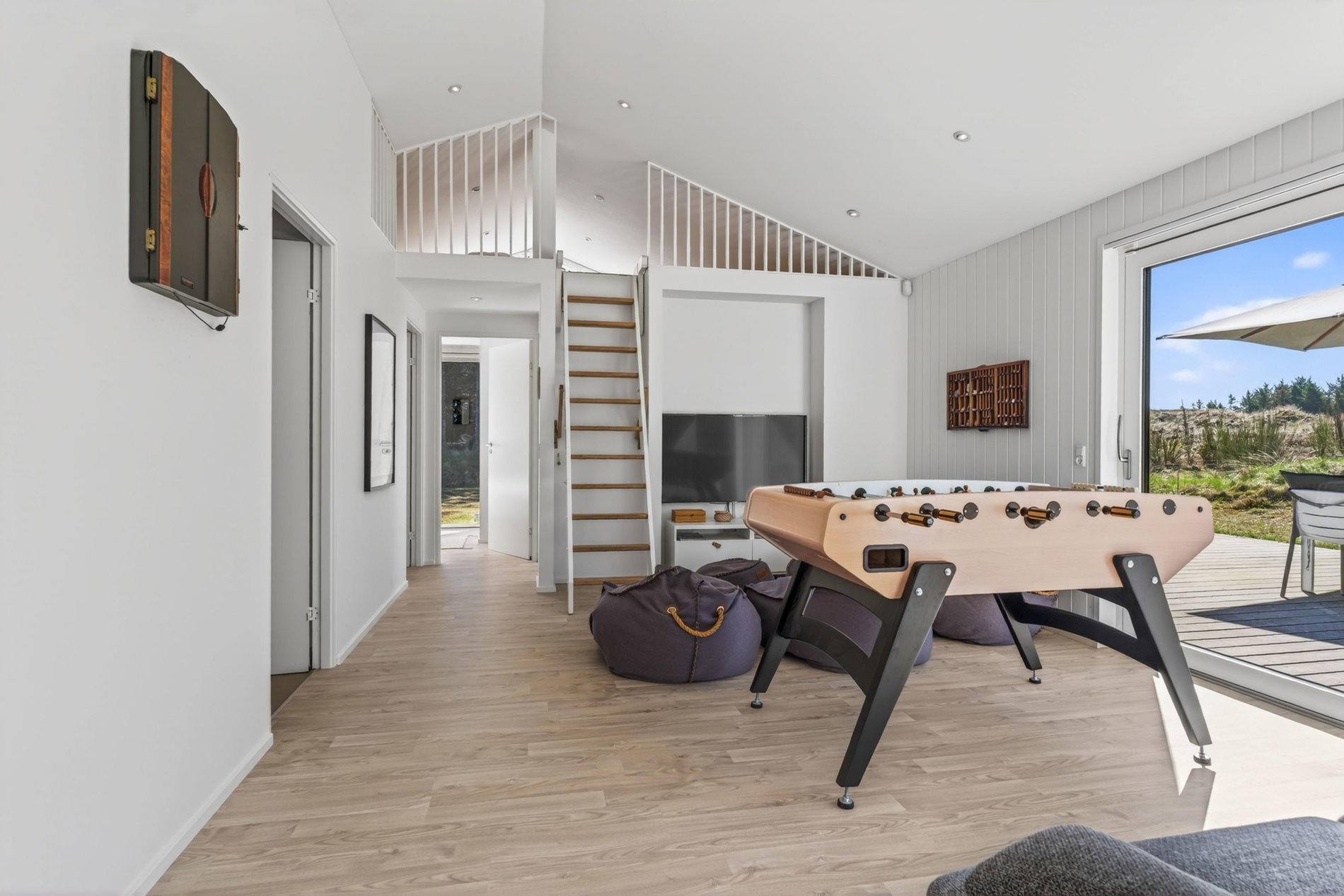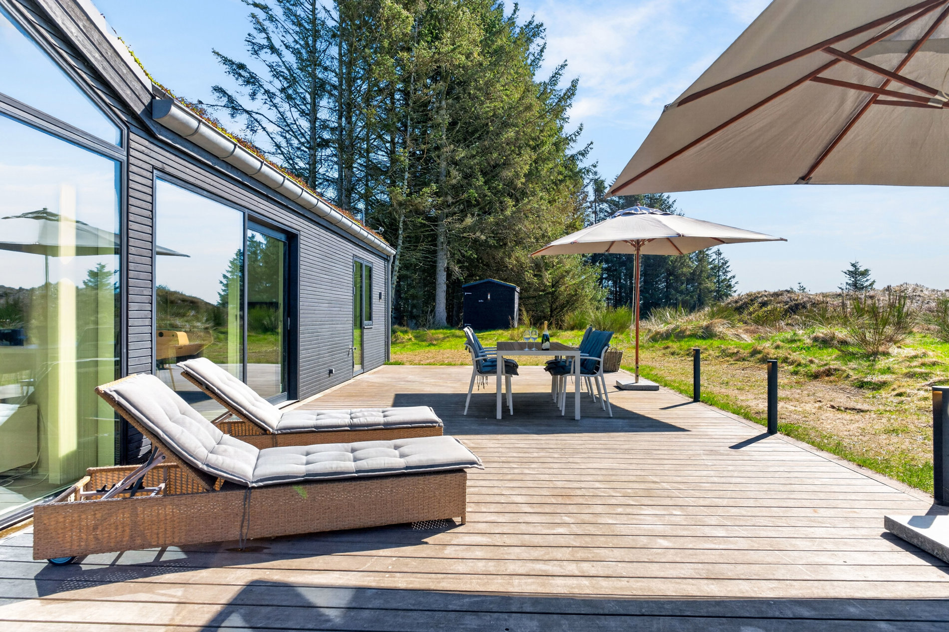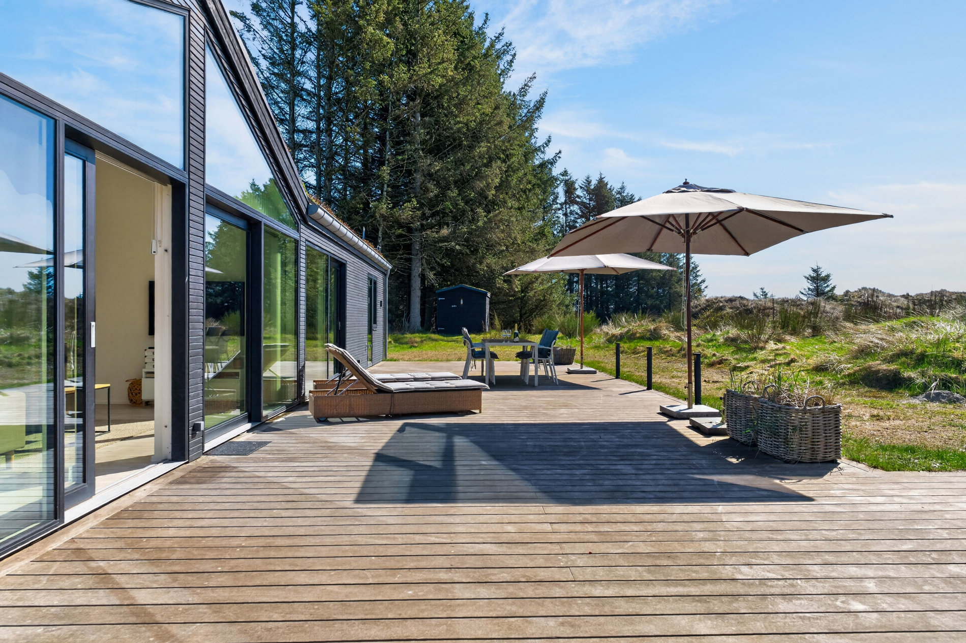 Udelivet folder sig naturligt ud på den store, åbne terrasse, hvor solen kan nydes hele dagen. Terrassen er indrettet med flere zoner til både loungemøbler, liggestole og spiseplads, og den udendørs bruser fuldender sommerhusoplevelsen efter strandture og varme dage.