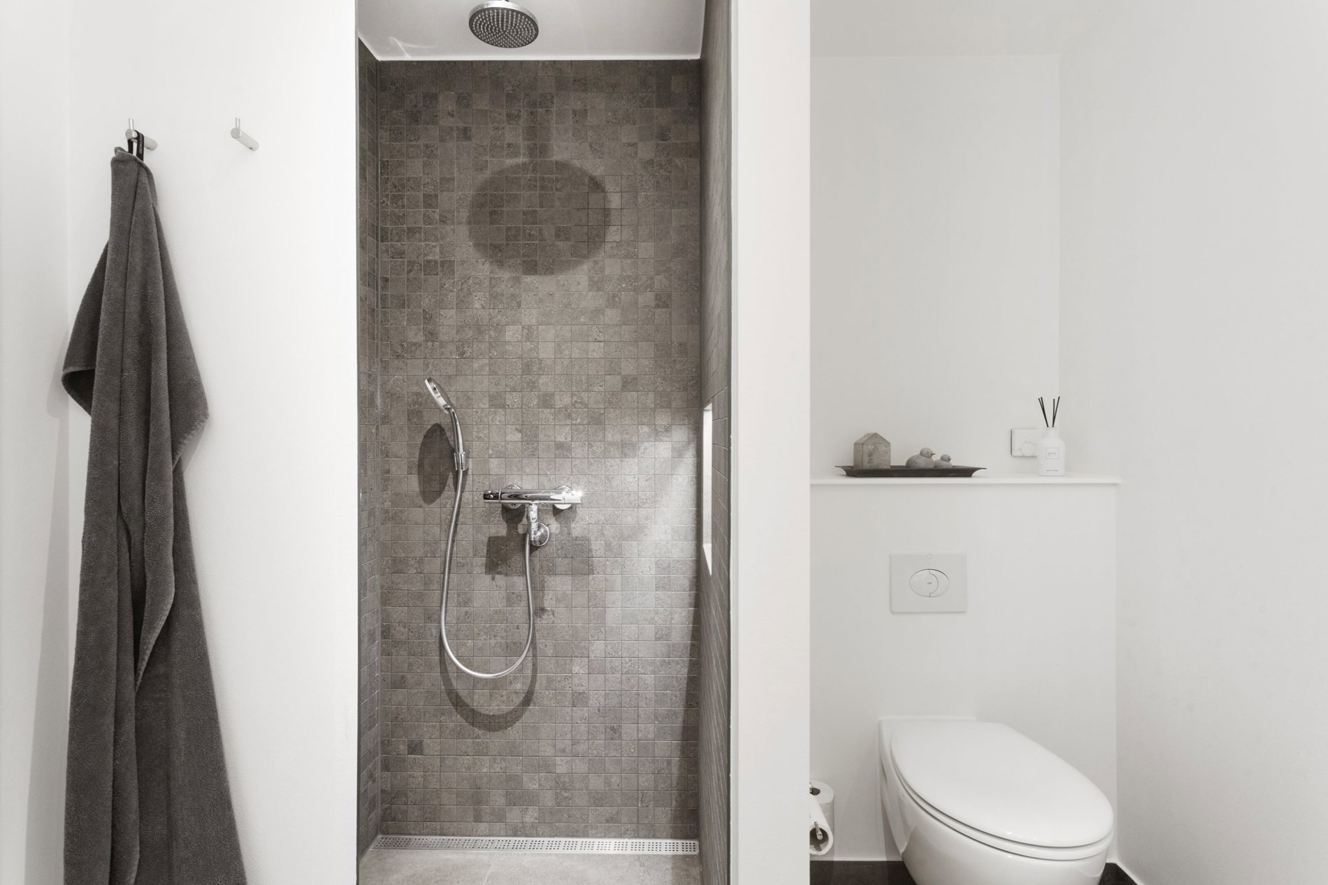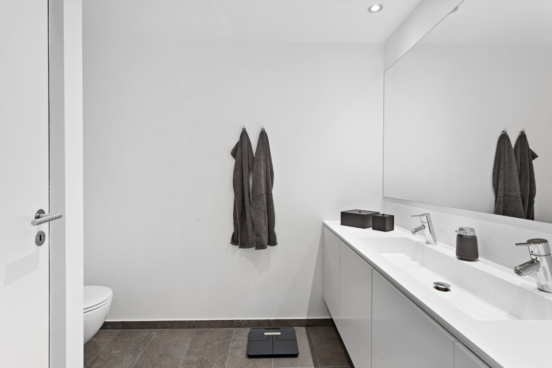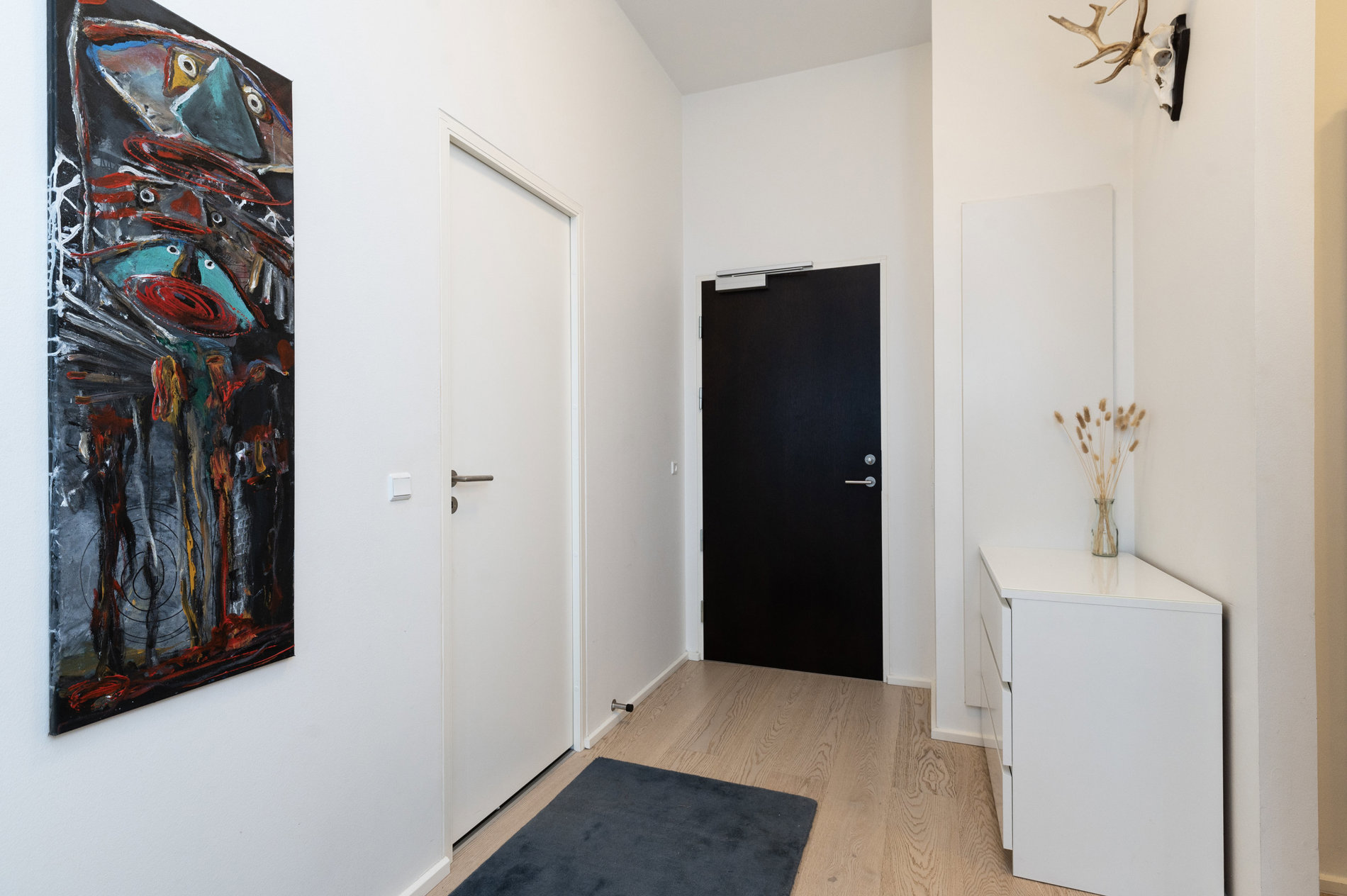 Lejlighedens private afdeling er diskret placeret væk fra de mest aktive opholdsrum og skaber en naturlig opdeling mellem liv og hvile. Gode værelser og to stilrene badeværelser med indbyggede skabe sikrer komfortable og funktionelle rammer om hverdagen.