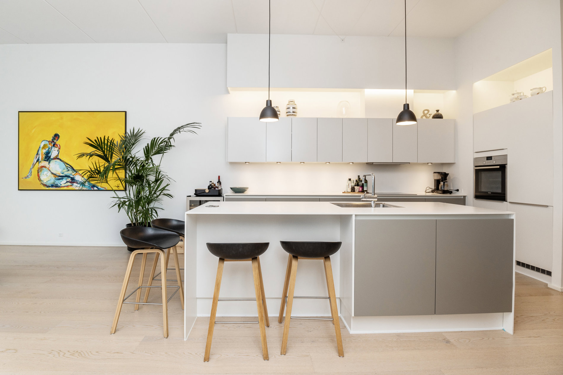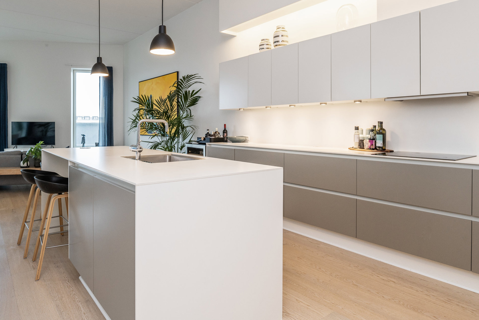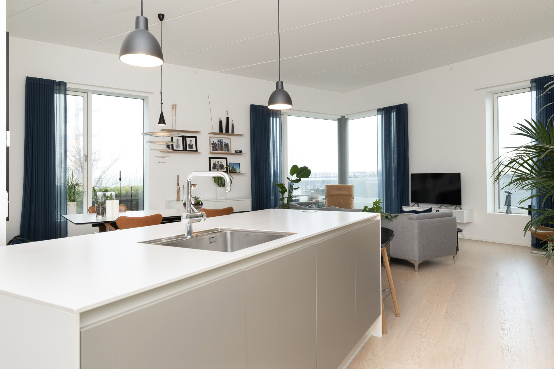 Indenfor fortsætter den gennemførte stil. Det elegante køkken-alrum danner rammen om både hverdag og gæstebud. Det eksklusive køkken med køkkenø indbyder til madlavning, samtaler og samvær, mens de store vinduespartier trækker lyset og udsigten helt ind i rummet. Her smelter funktionalitet og æstetik sammen i perfekte rammer.
