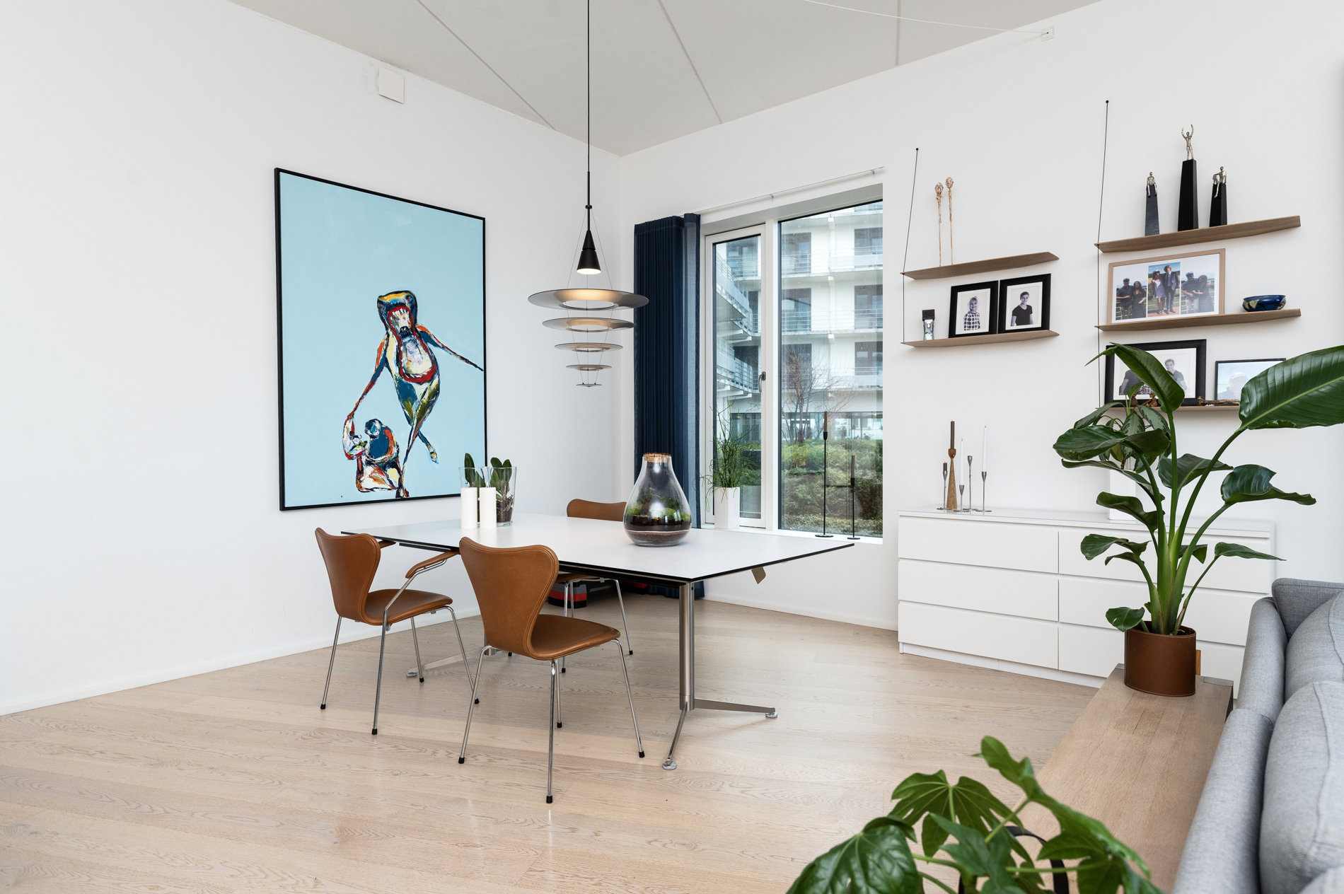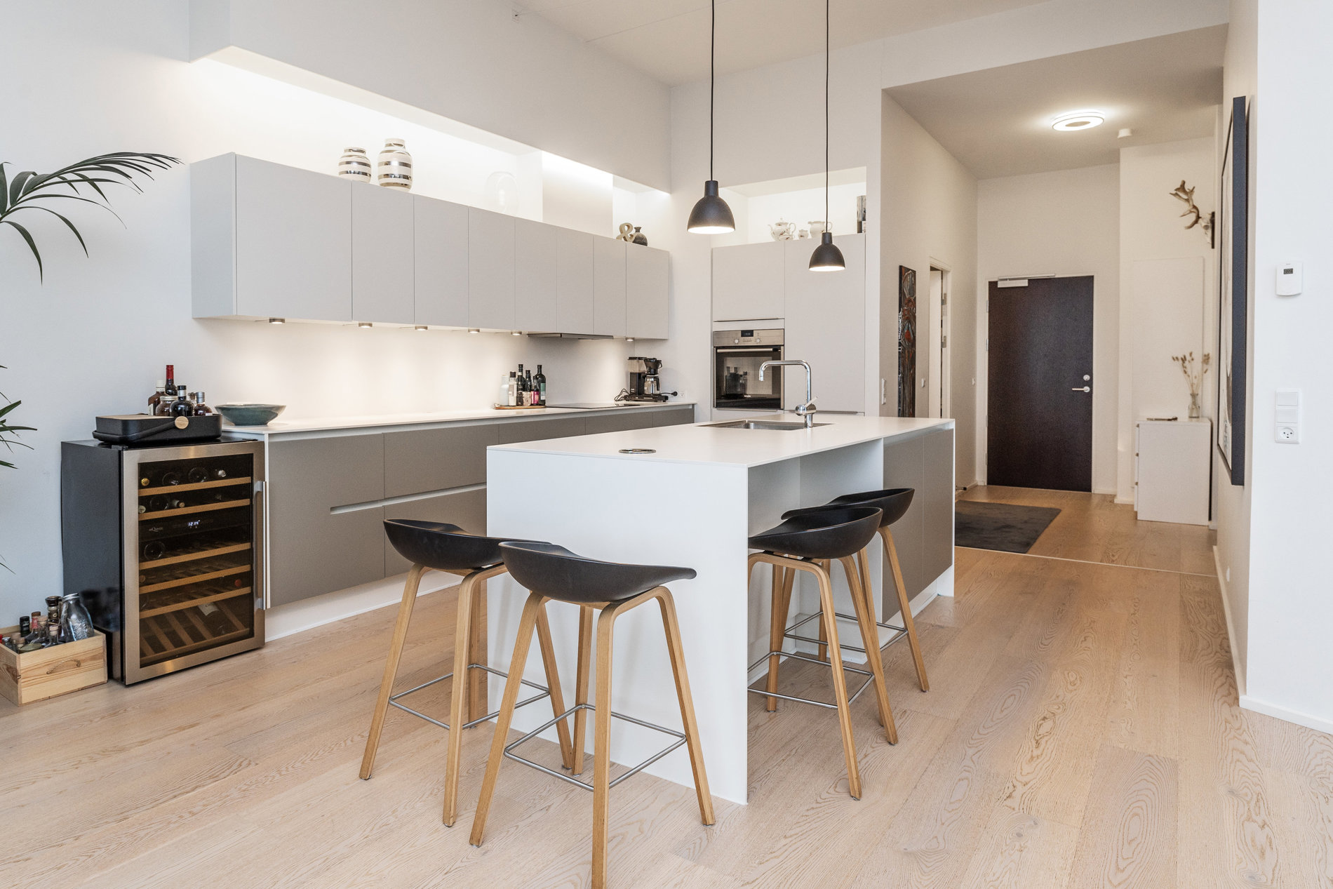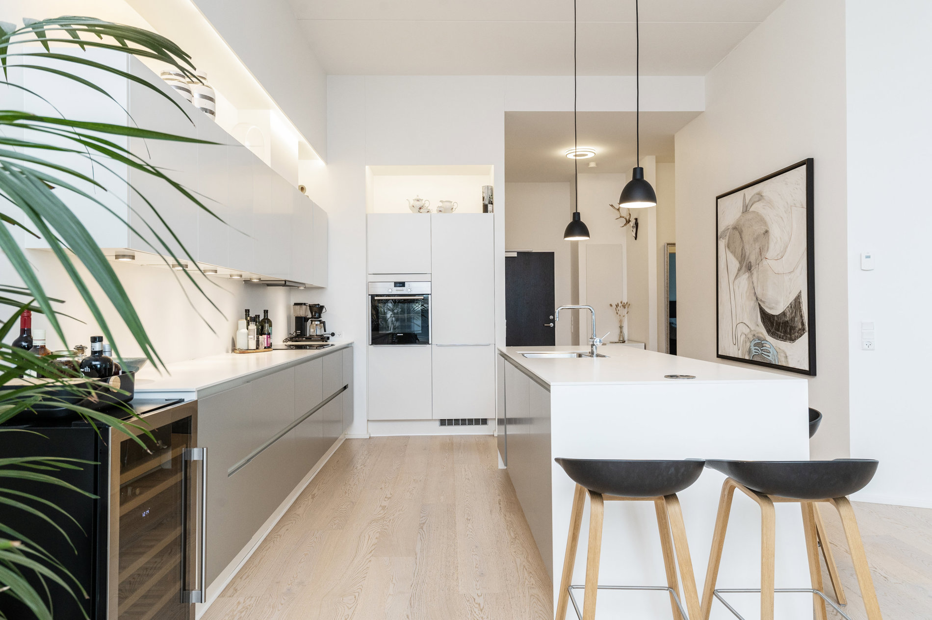 Indenfor fortsætter den gennemførte stil. Det elegante køkken-alrum danner rammen om både hverdag og gæstebud. Det eksklusive køkken med køkkenø indbyder til madlavning, samtaler og samvær, mens de store vinduespartier trækker lyset og udsigten helt ind i rummet. Her smelter funktionalitet og æstetik sammen i perfekte rammer.